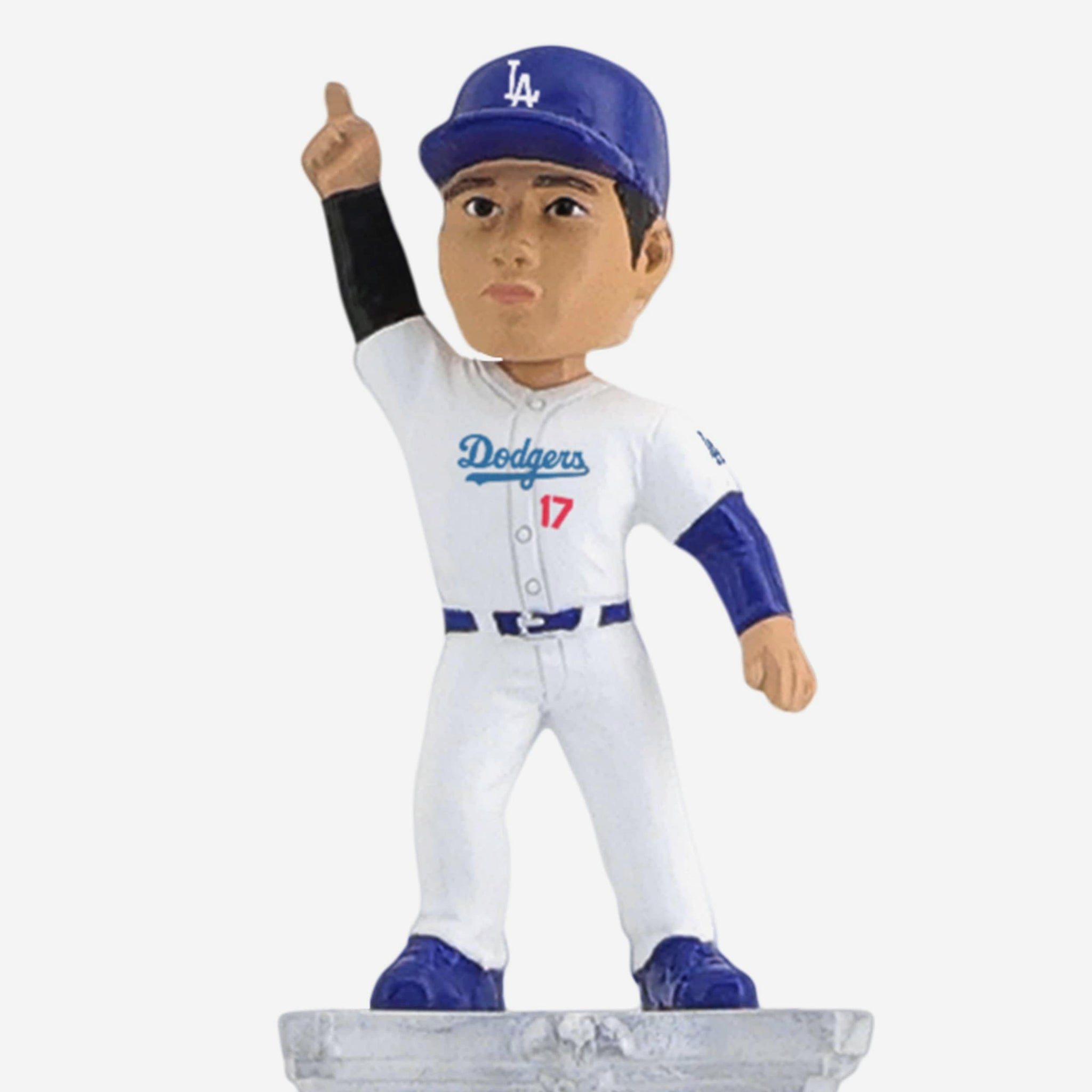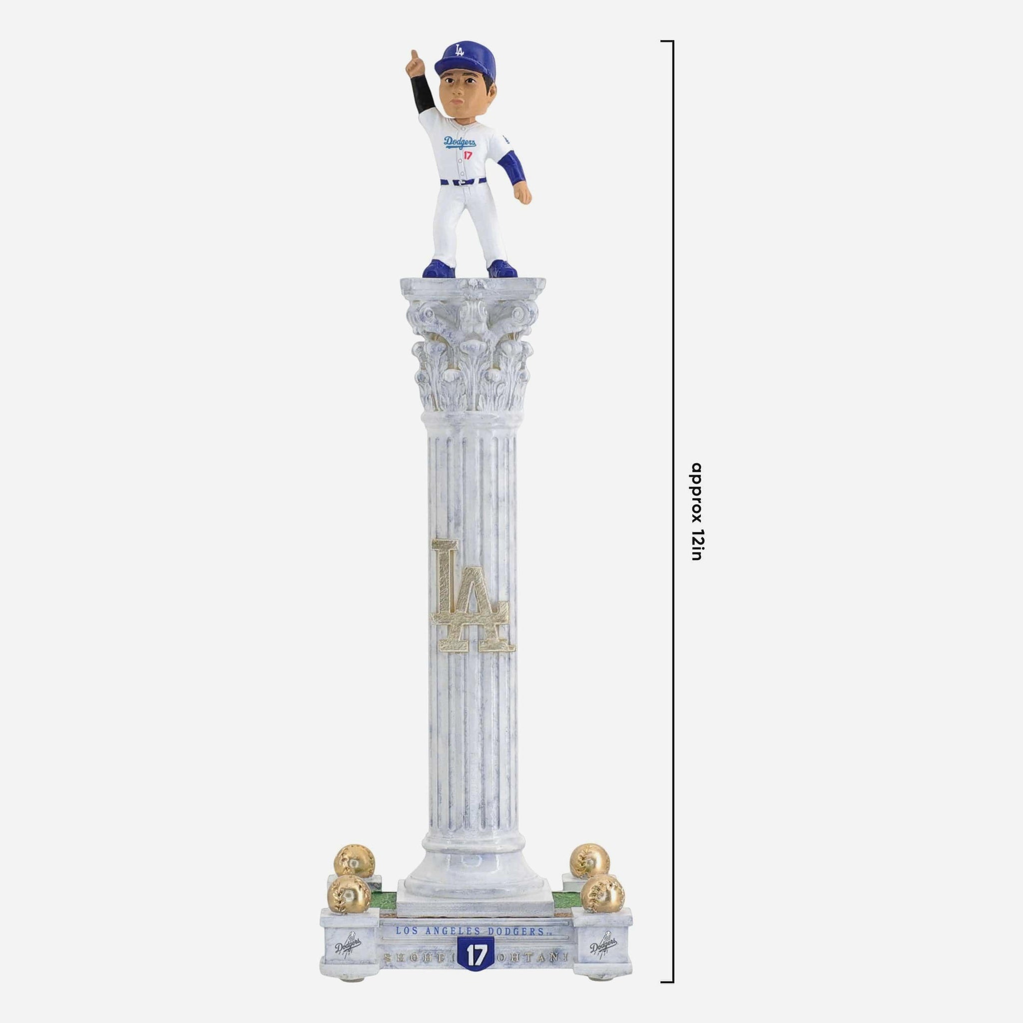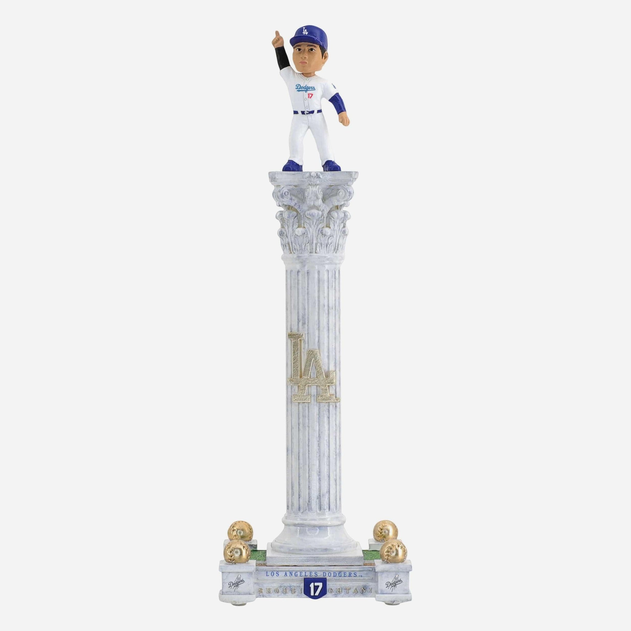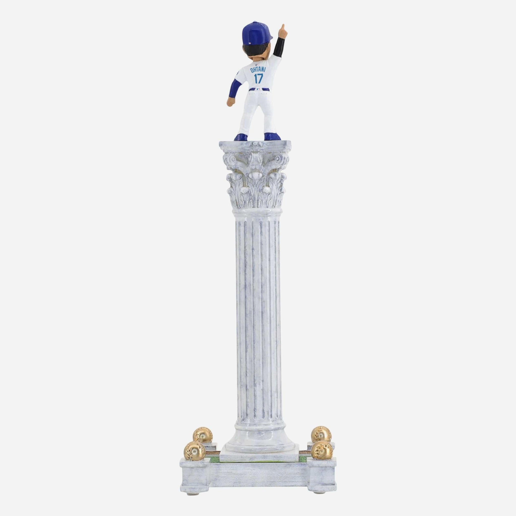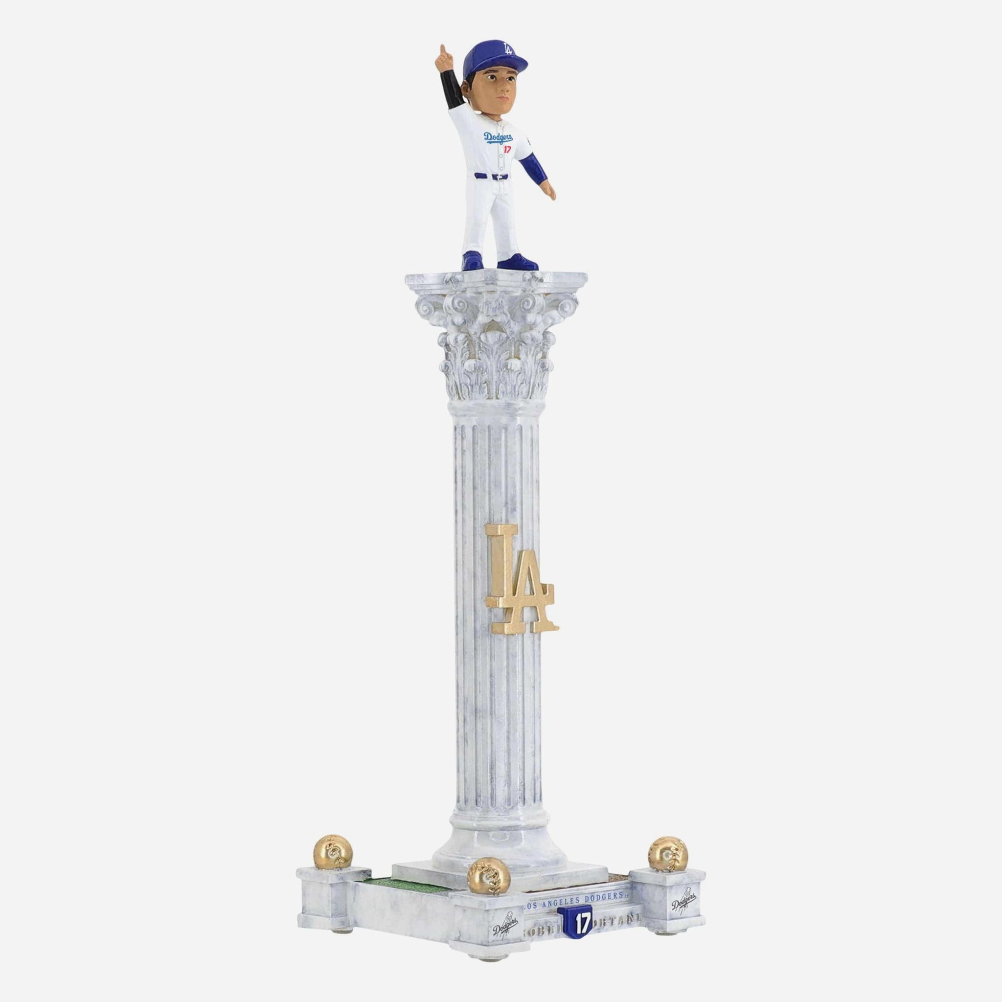 - Portrays Shohei Ohtani wearing his Los Angeles Dodgers gameday uniform, posed atop a dramatic tall pedestal