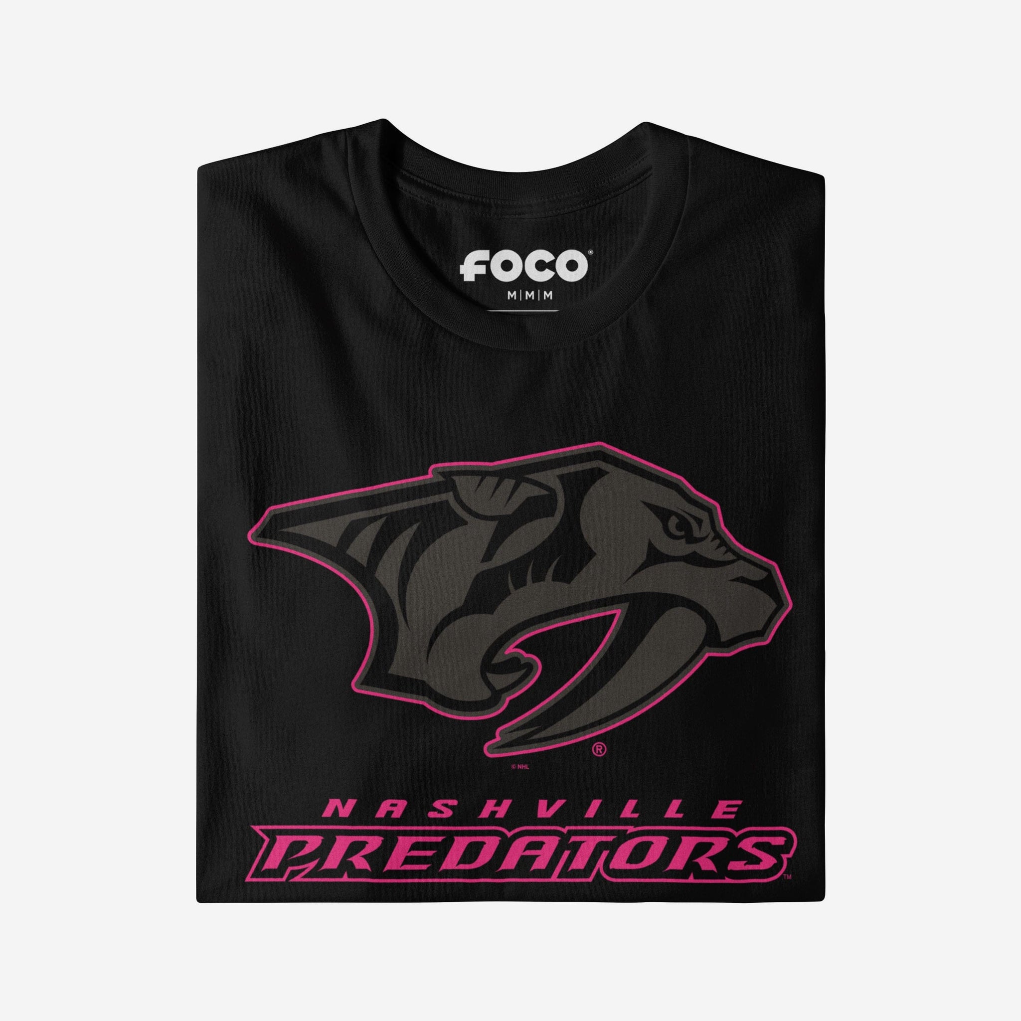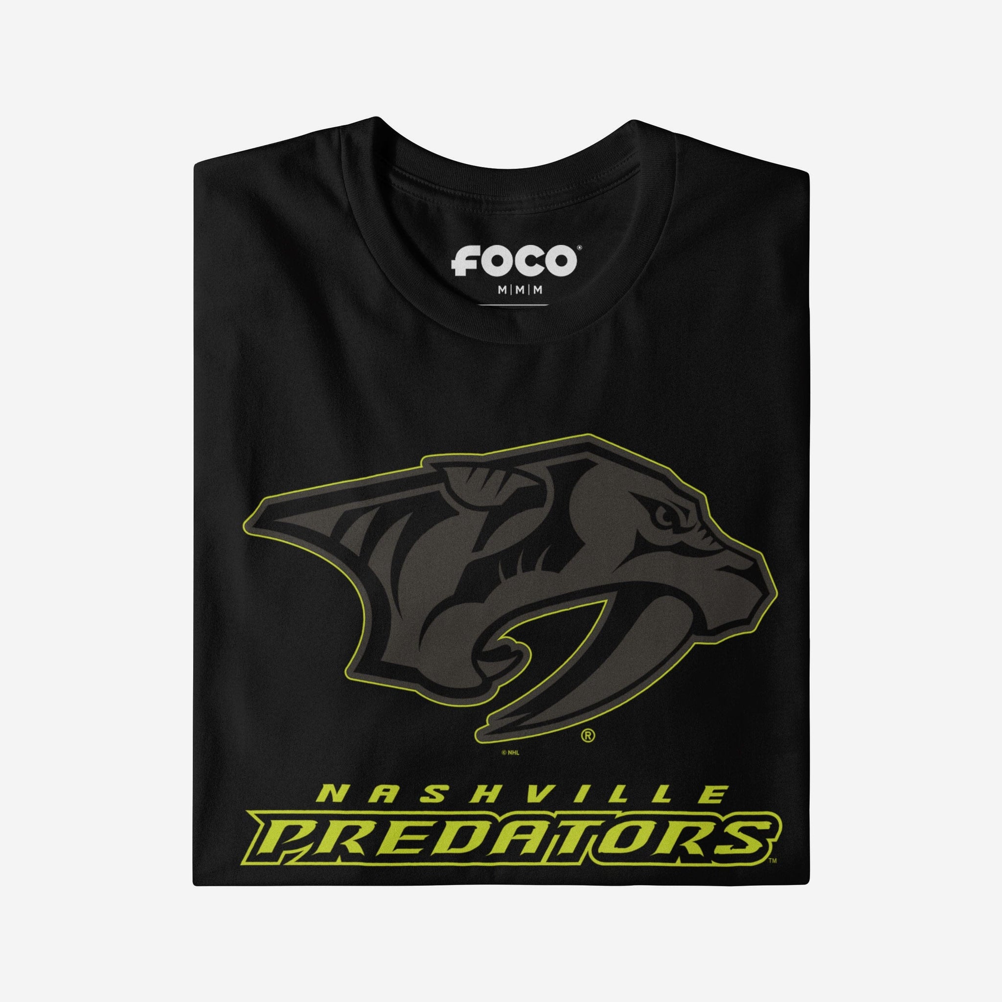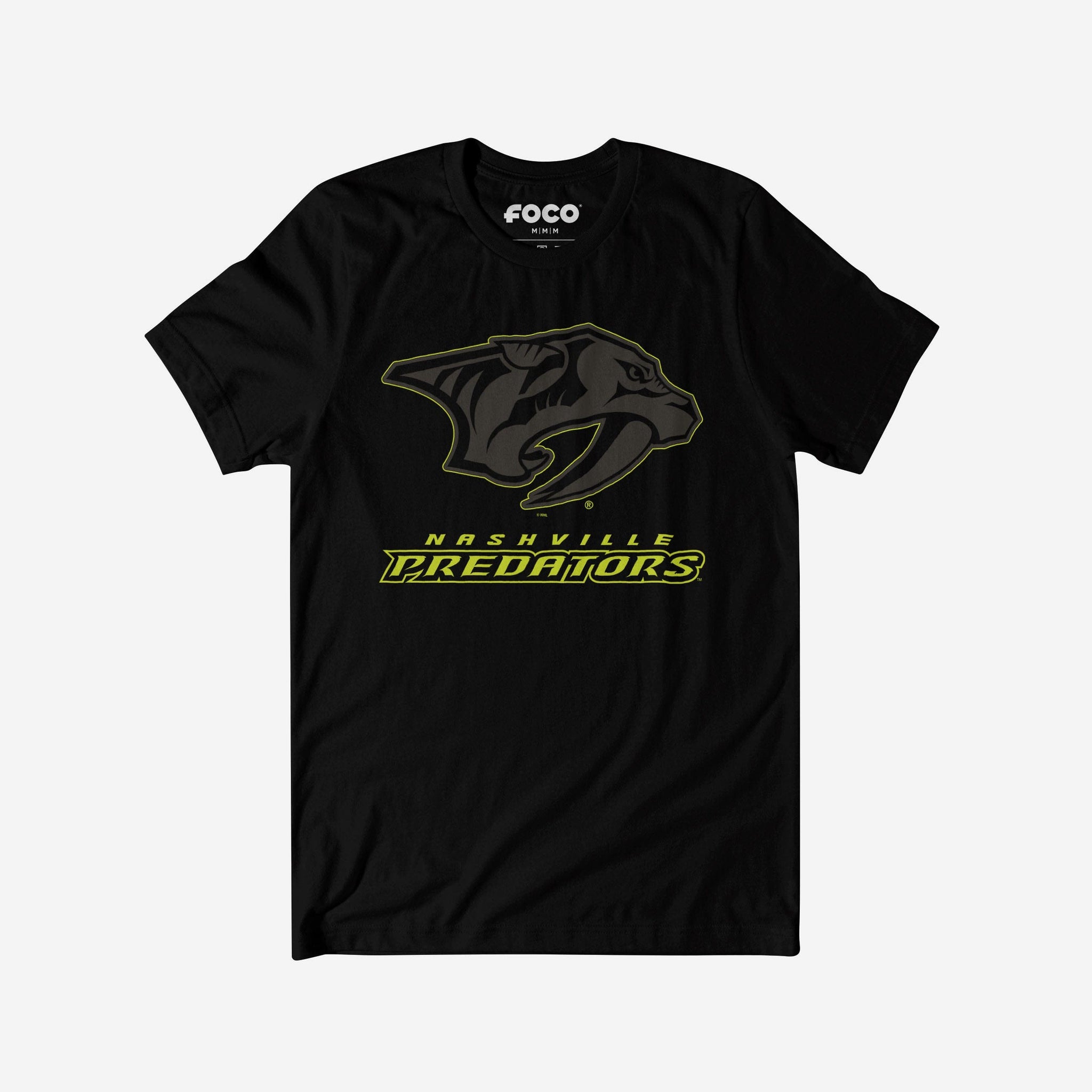 - Team logo display with highlight outline: The front of this apparel features a black Nashville Predators team logo display outlined in neon, and a neon wordmark team name display