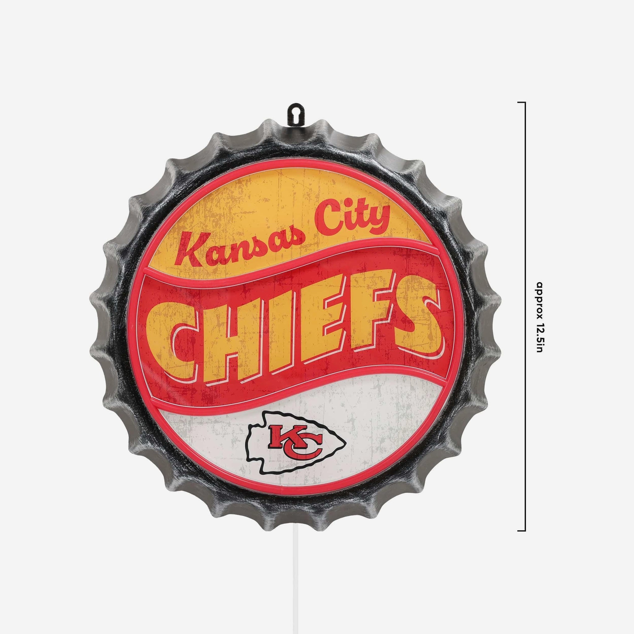 Light up your fancave in team-ready style! Put your pride on full display with this Kansas City Chiefs Neon Backlit Bottle Cap Wall Sign, featuring bold graphics in a classic bottle cap design.