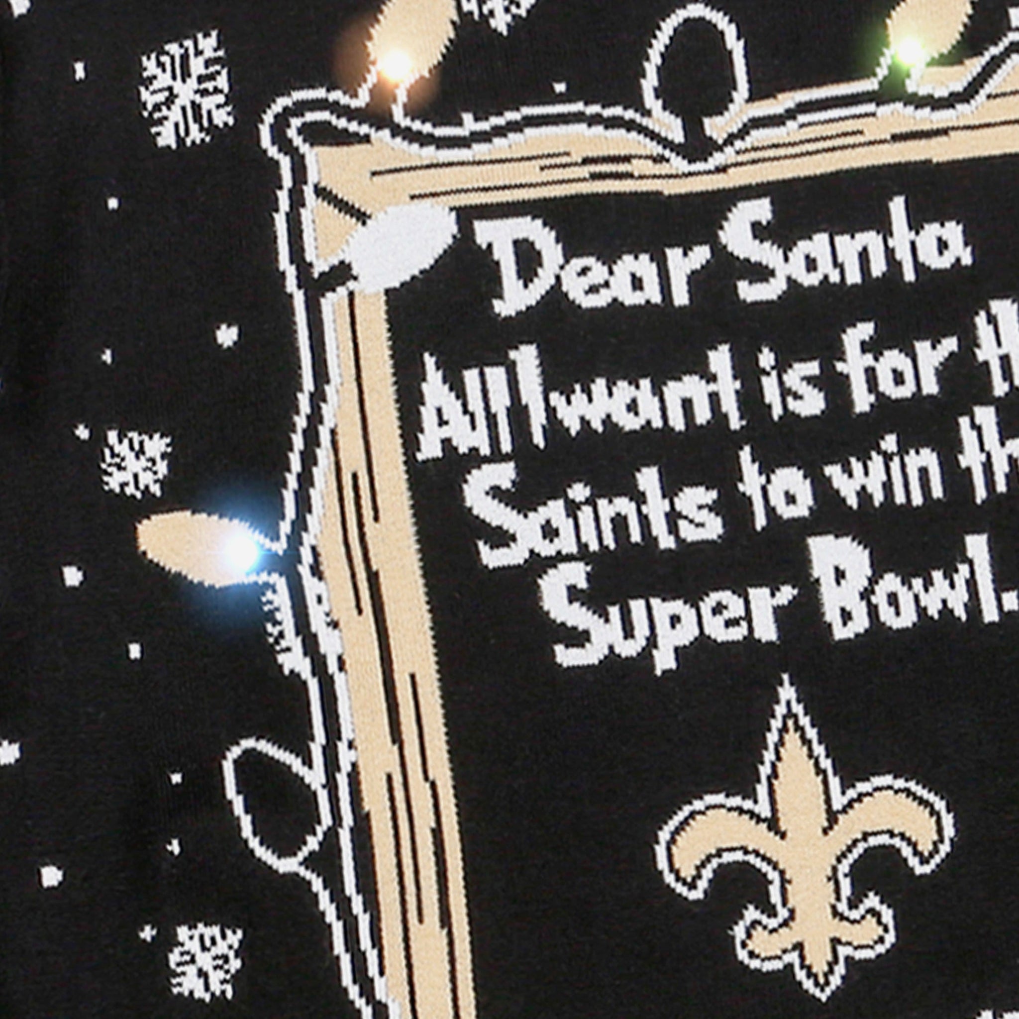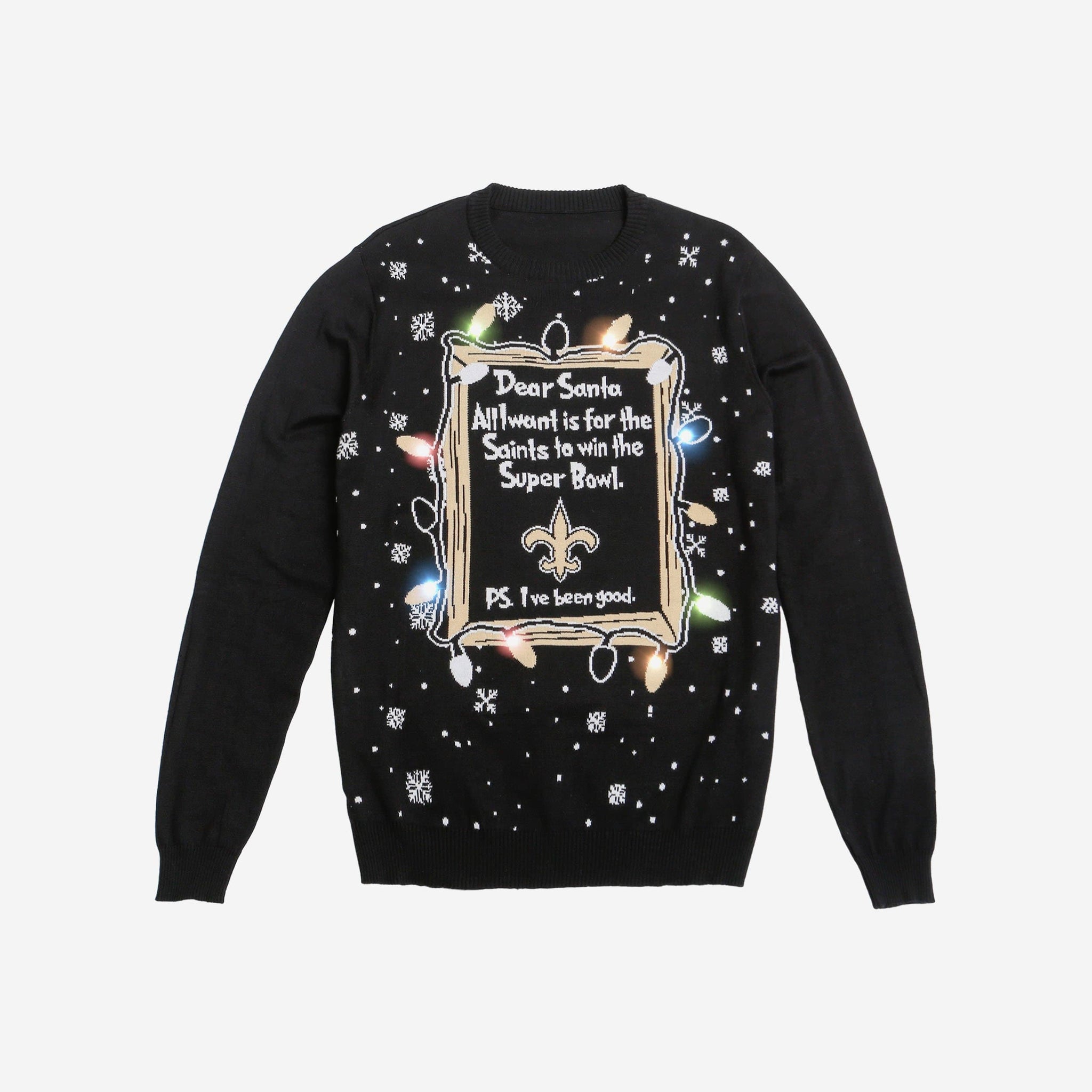 The holidays are coming, and you need a nice holiday sweater so Santa knows you belong on the nice list this year. This New Orleans Saints Dear Santa Light Up Sweater is here to help, whether you're wrapping some gifts or being the star of the Christmas sweater party!