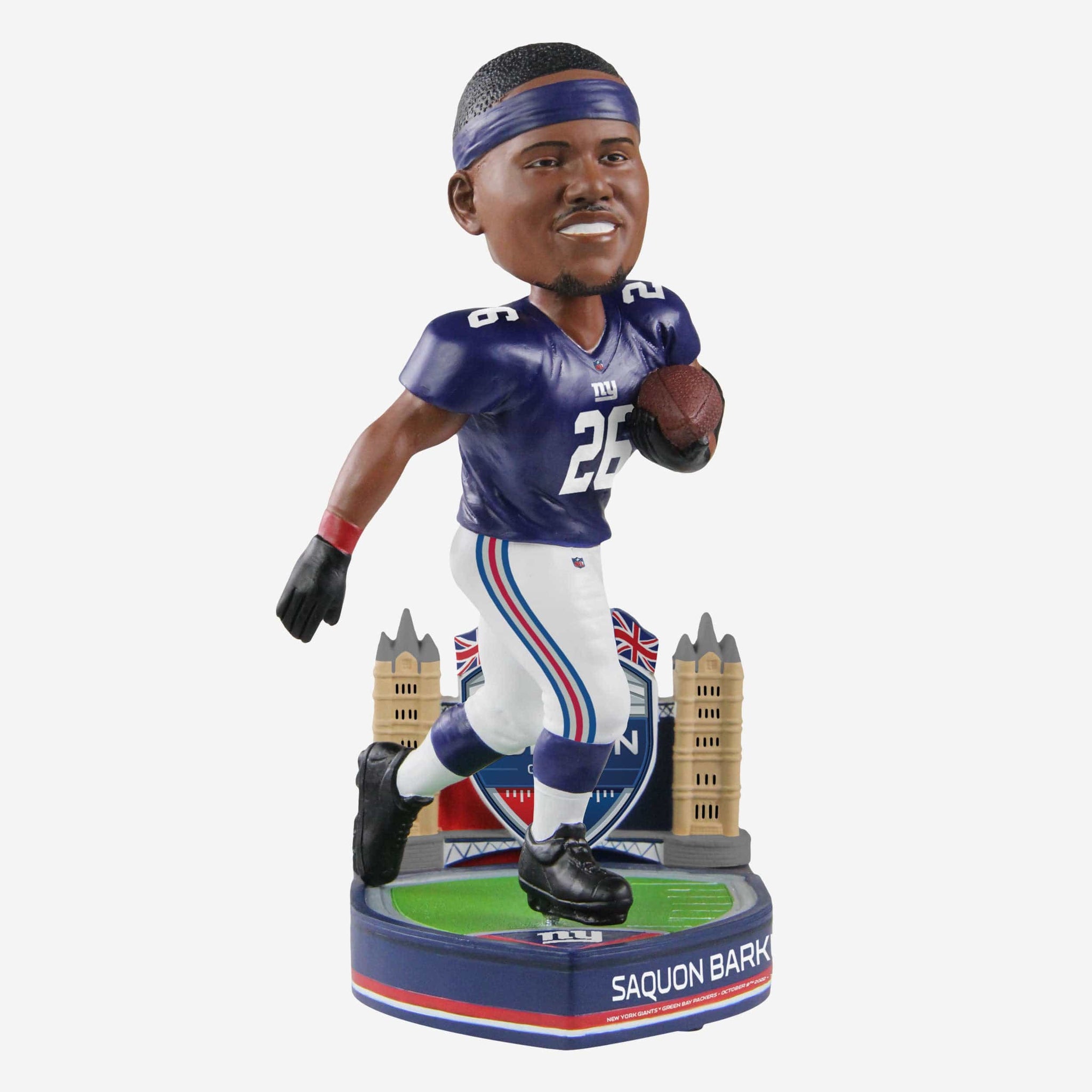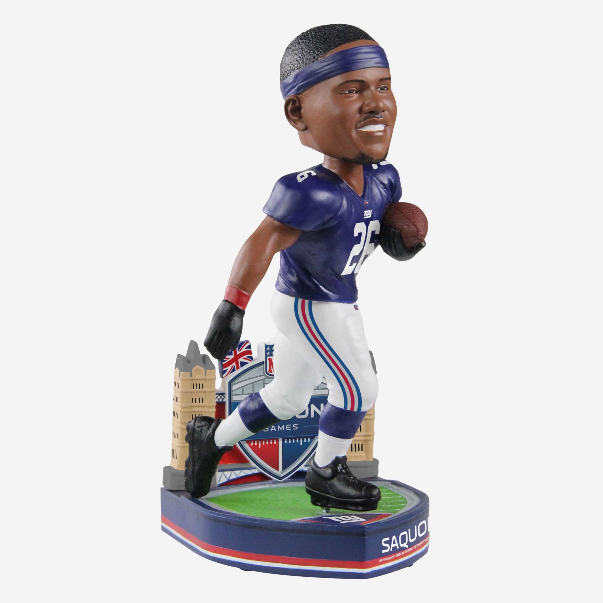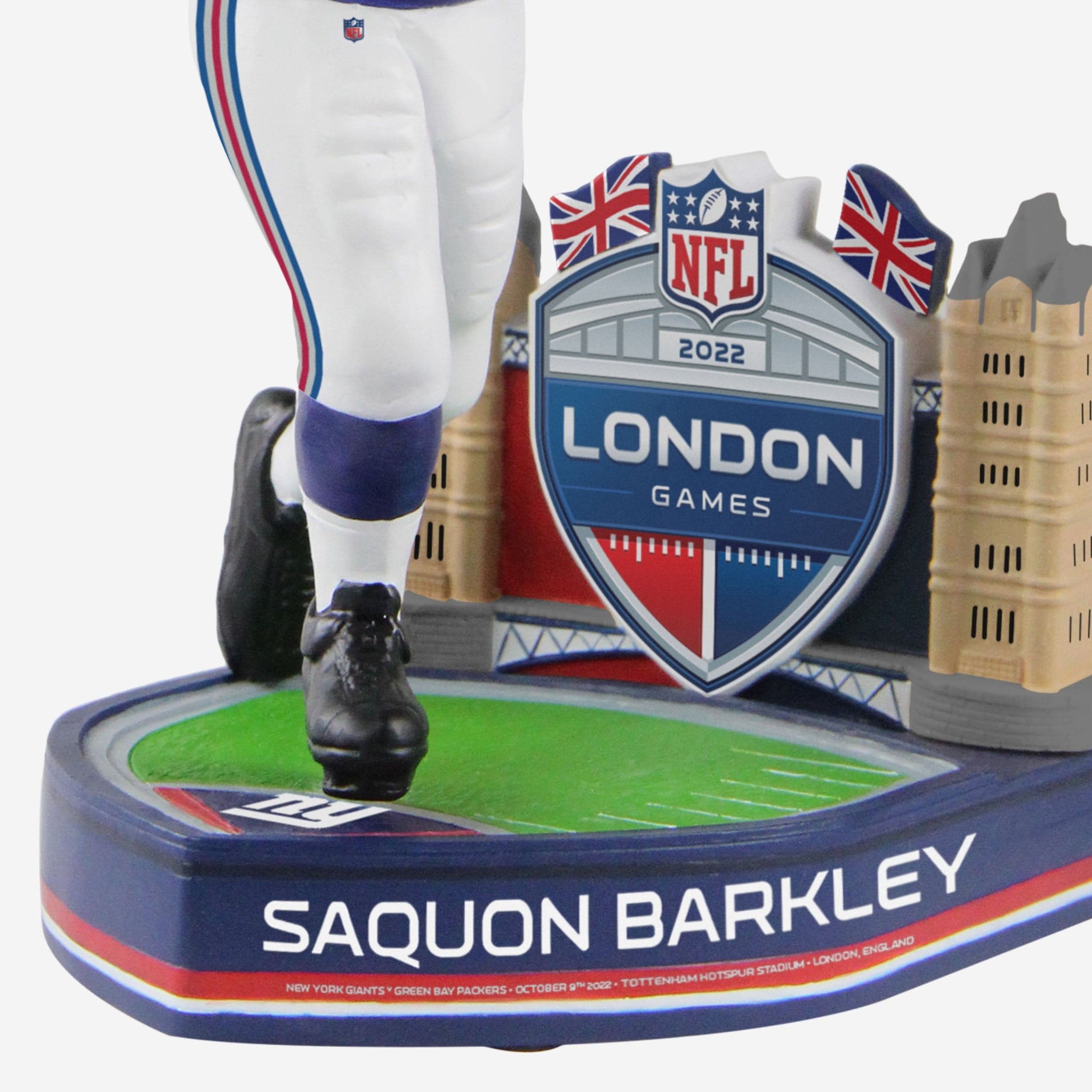 Big Blue meets Big Ben. Saquon and the Giants are ready to touch down in London Town with the Saquon Barkley New York Giants 2022 London Game Bobblehead.