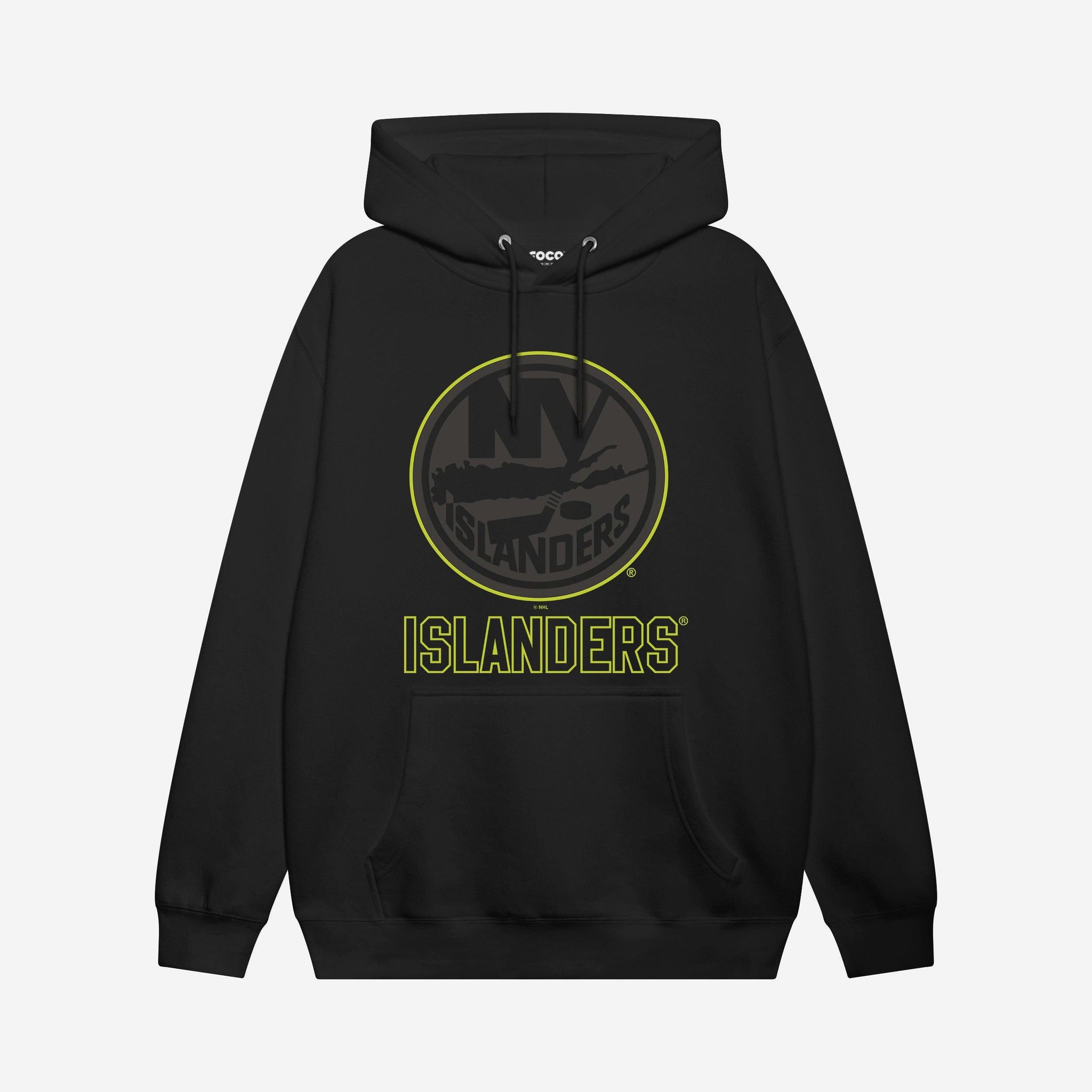 - Team logo display with highlight outline: The front of this apparel features a black New York Islanders team logo display outlined in neon, and a neon team name display