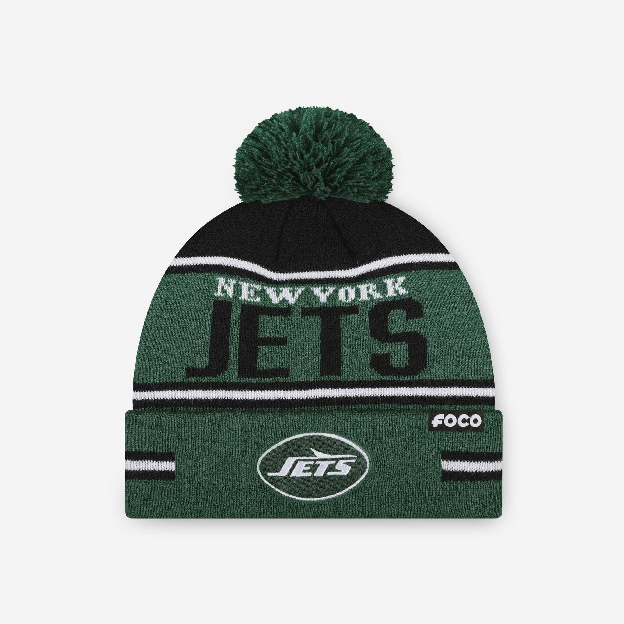 Cold weather? Game day? No problem. The New York Jets Big Wordmark Stripe Pom Beanie is here to keep you warm and stylish while you rep your team like a pro.
