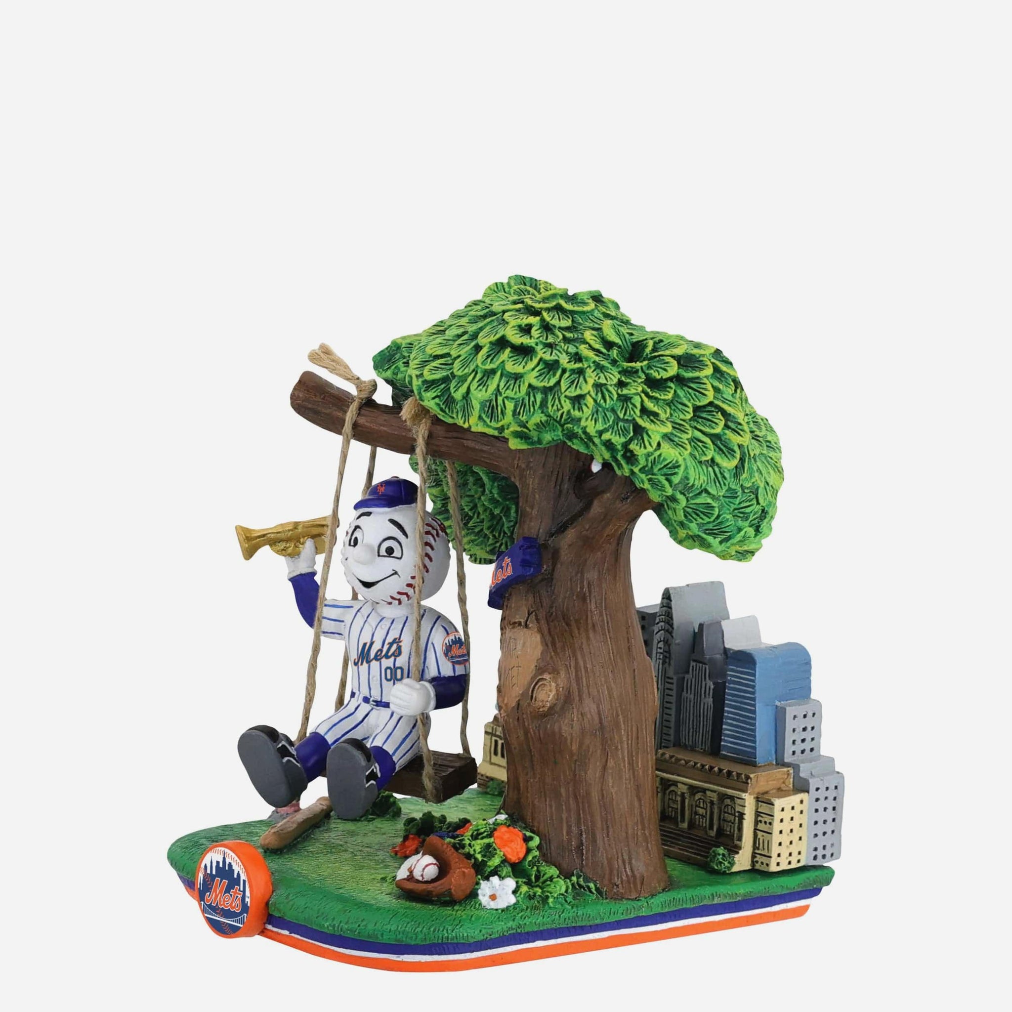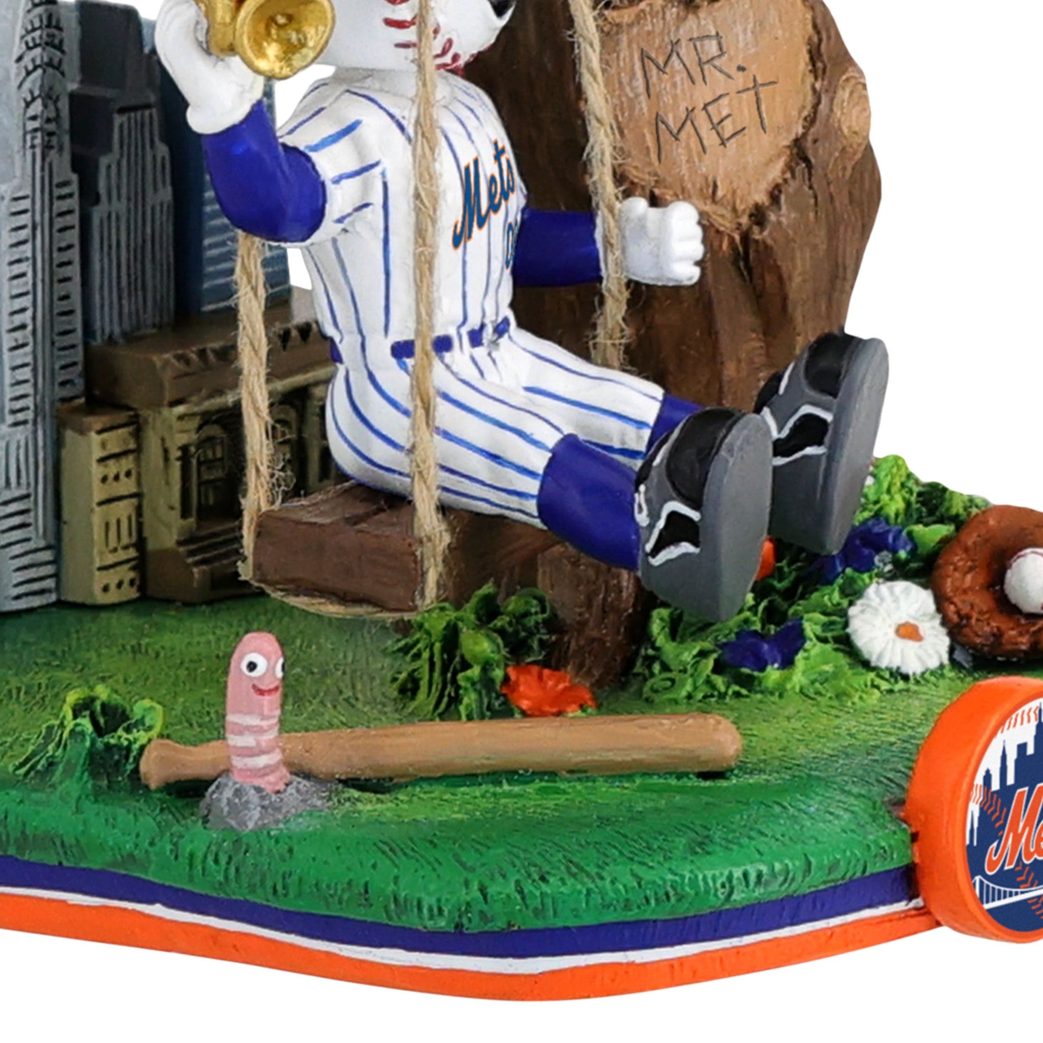 - Portrays Mr. Met wearing his gameday uniform, sitting on a city park swing, and holding a trumpet, ready to cheer on his team