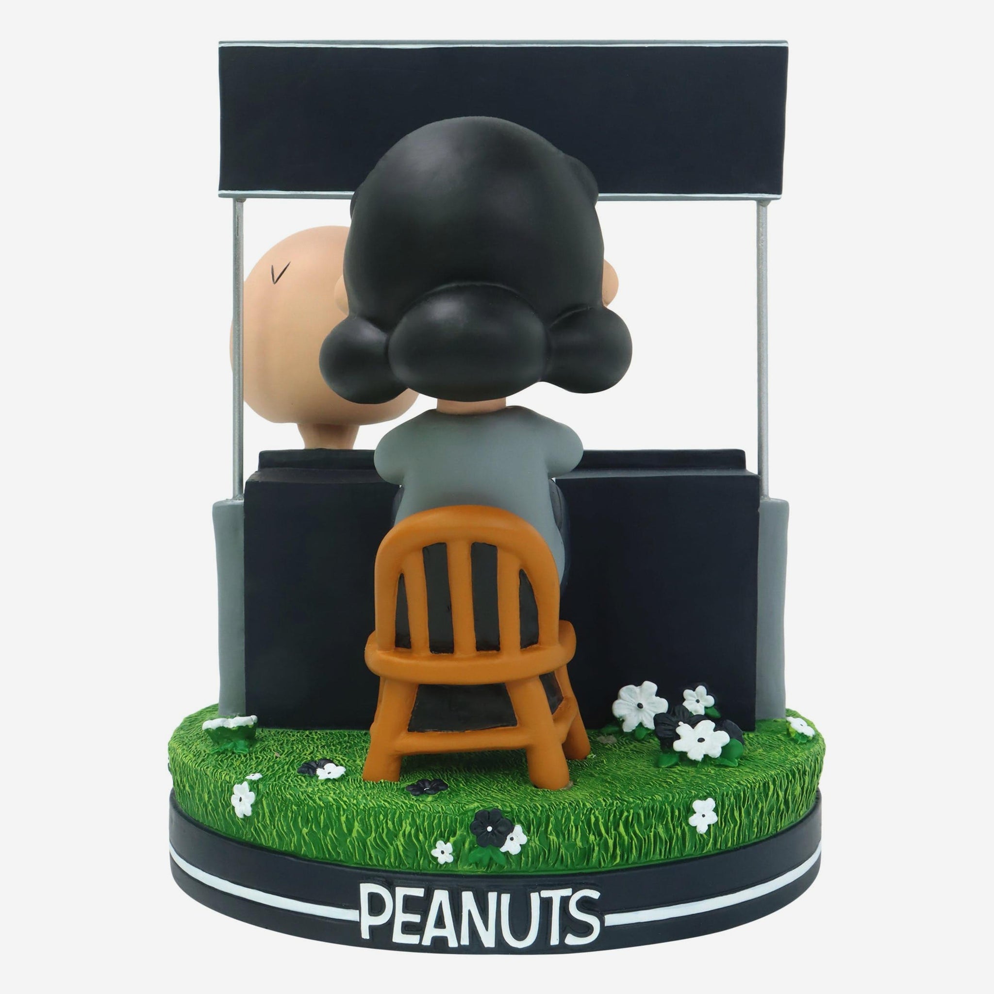 - Portrays Lucy Van Pelt sitting behind a team-colored wooden stand, and Charlie Brown sitting in front of the stand, ready to give your collection some great advice