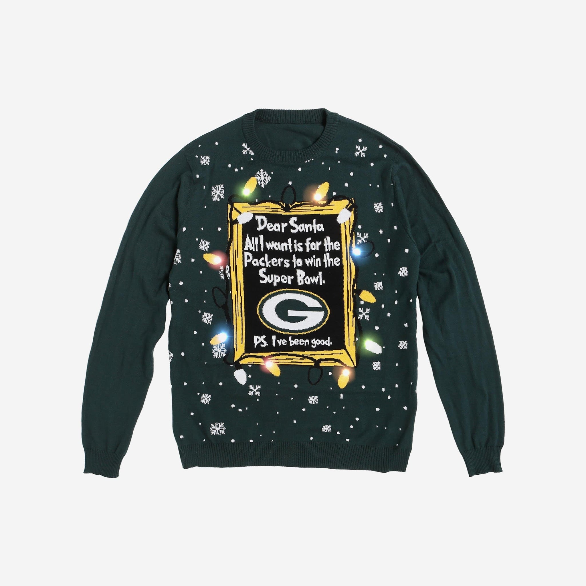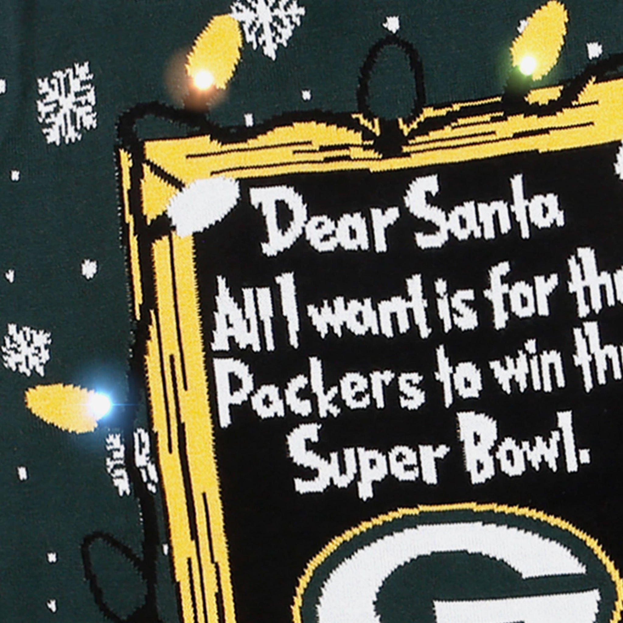 The holidays are coming, and you need a nice holiday sweater so Santa knows you belong on the nice list this year. This Green Bay Packers Dear Santa Light Up Sweater is here to help, whether you're wrapping some gifts or being the star of the Christmas sweater party!