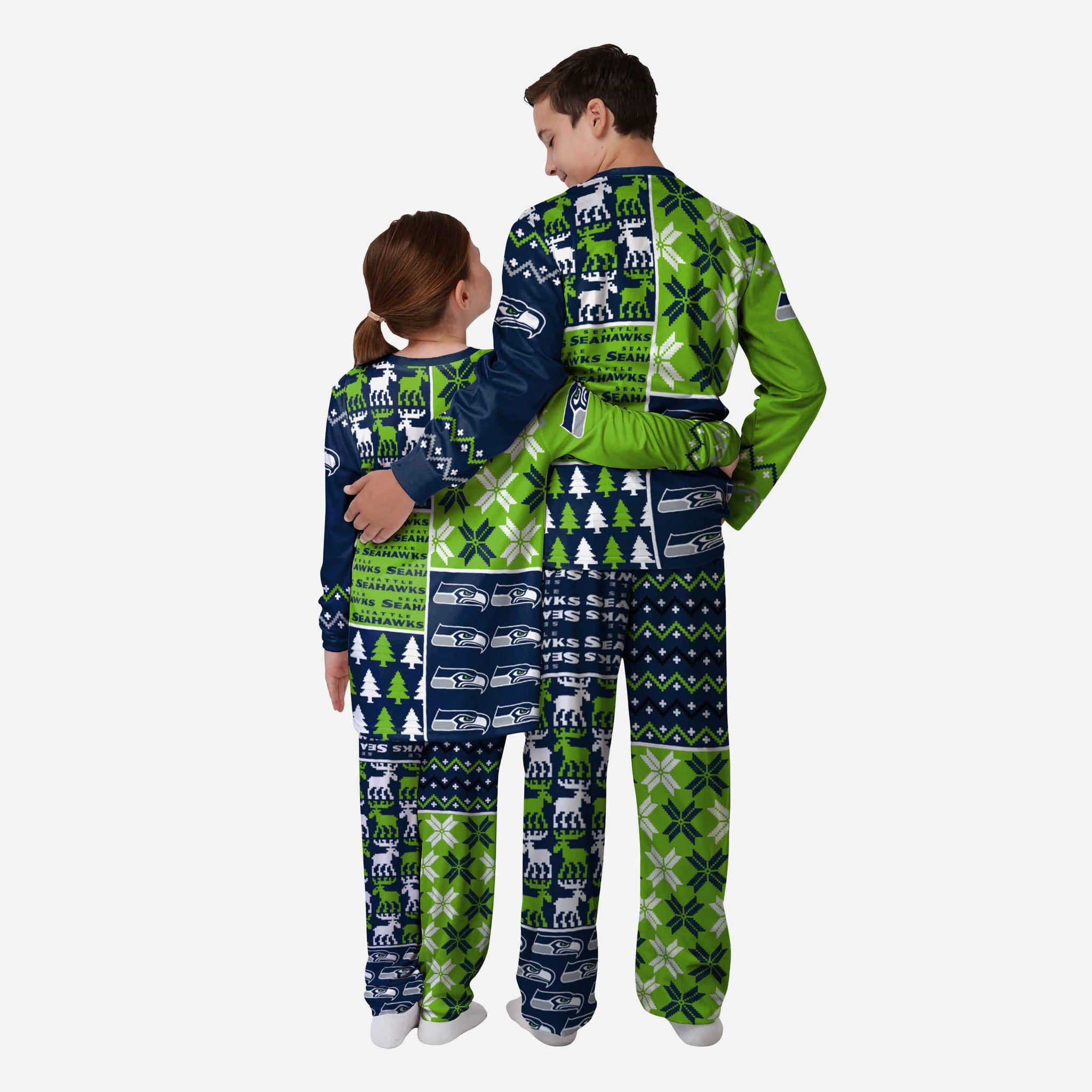 Get some matching family pajamas and dress to impress this holiday season! You won't want to miss these kids' team pajamas! These youth PJ's are comfortable and show off your team spirit in the form of some sweet youth jammies. Introducing the Seattle Seahawks Youth Busy Block Family Holiday Pajamas! Don't forget to take your holiday photo with the whole family wearing matching Christmas pajamas!