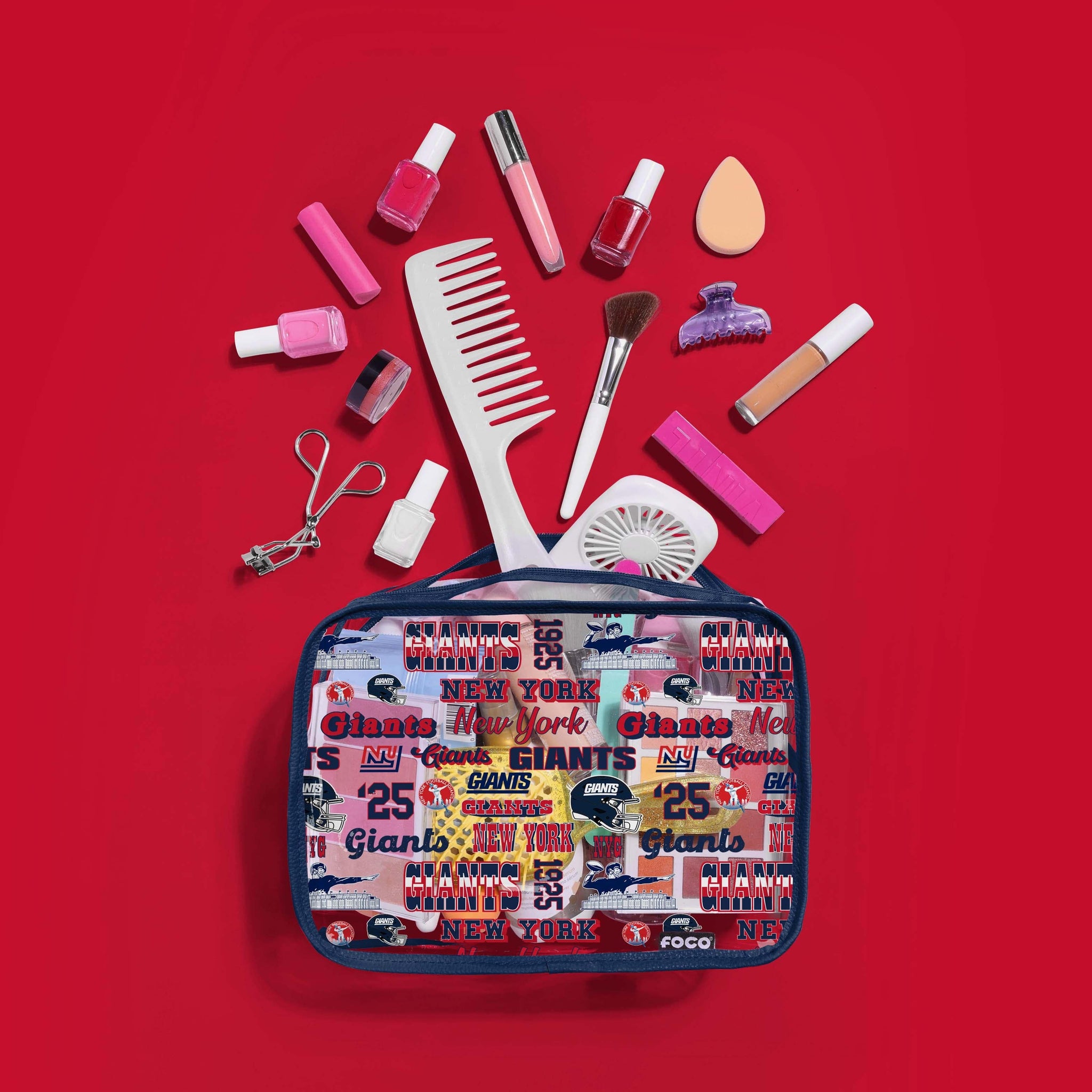 Lipstick. Hair care. Fandom. Get ready to carry it all! Wherever you go, let everyone clearly see which team you root for with a New York Giants Repeat Retro Print Clear Cosmetic Bag.
