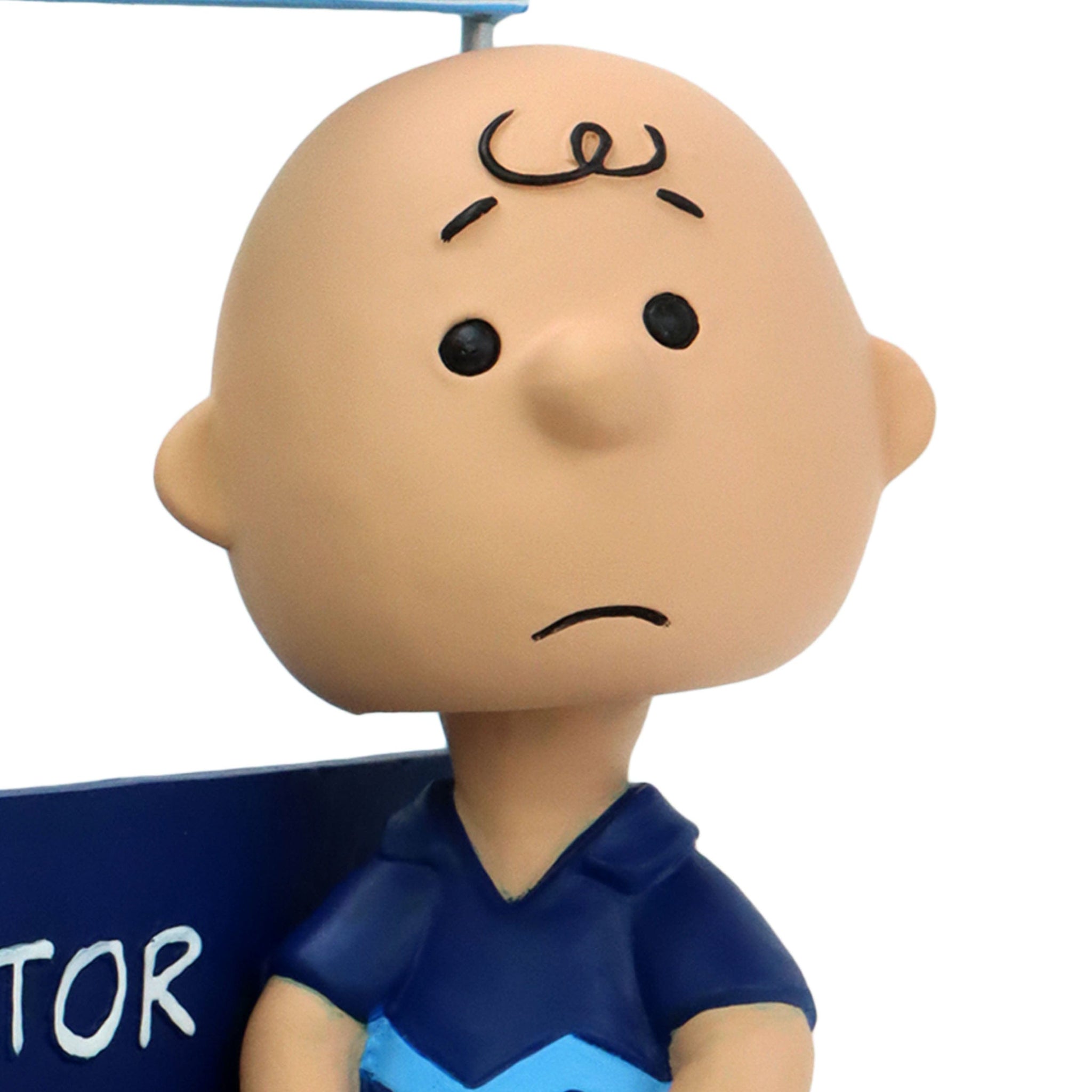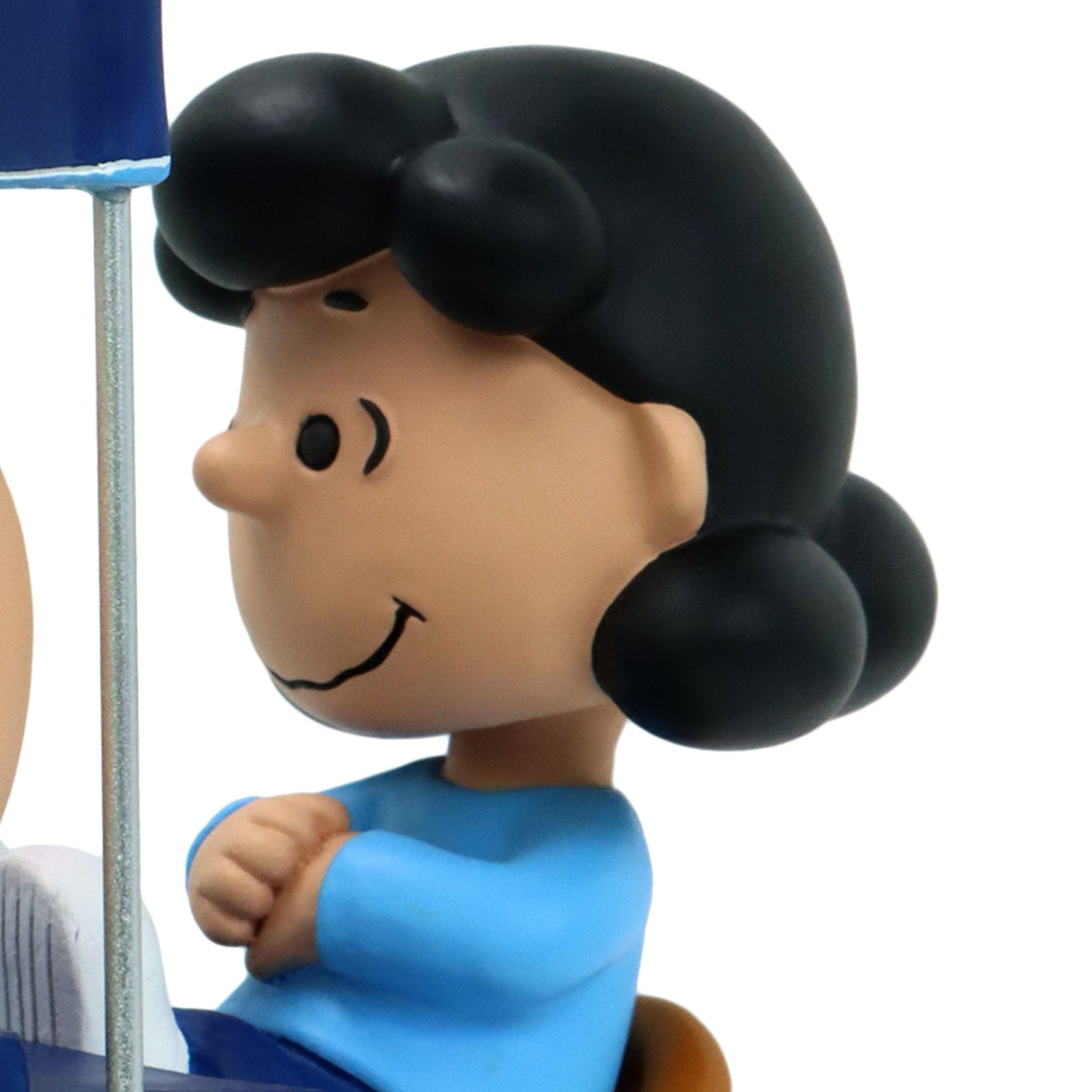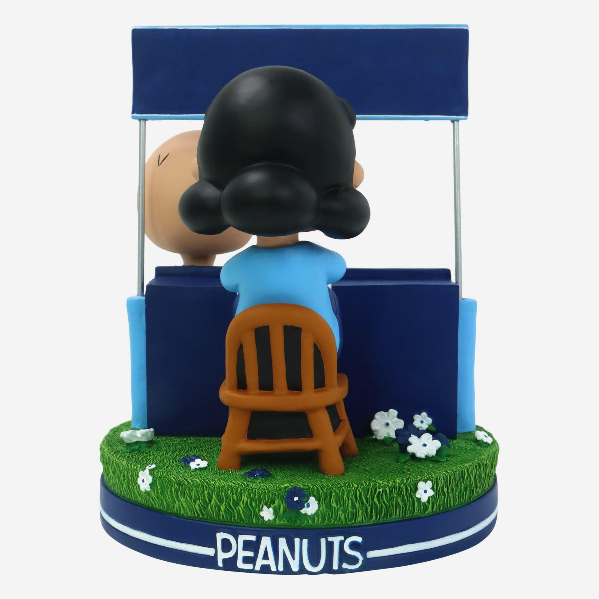 - Portrays Lucy Van Pelt sitting behind a team-colored wooden stand, and Charlie Brown sitting in front of the stand, ready to give your collection some great advice