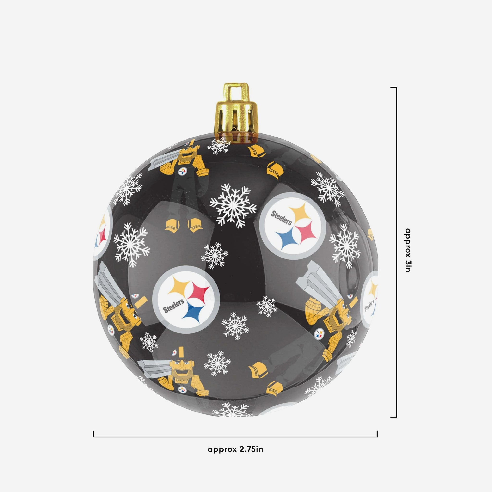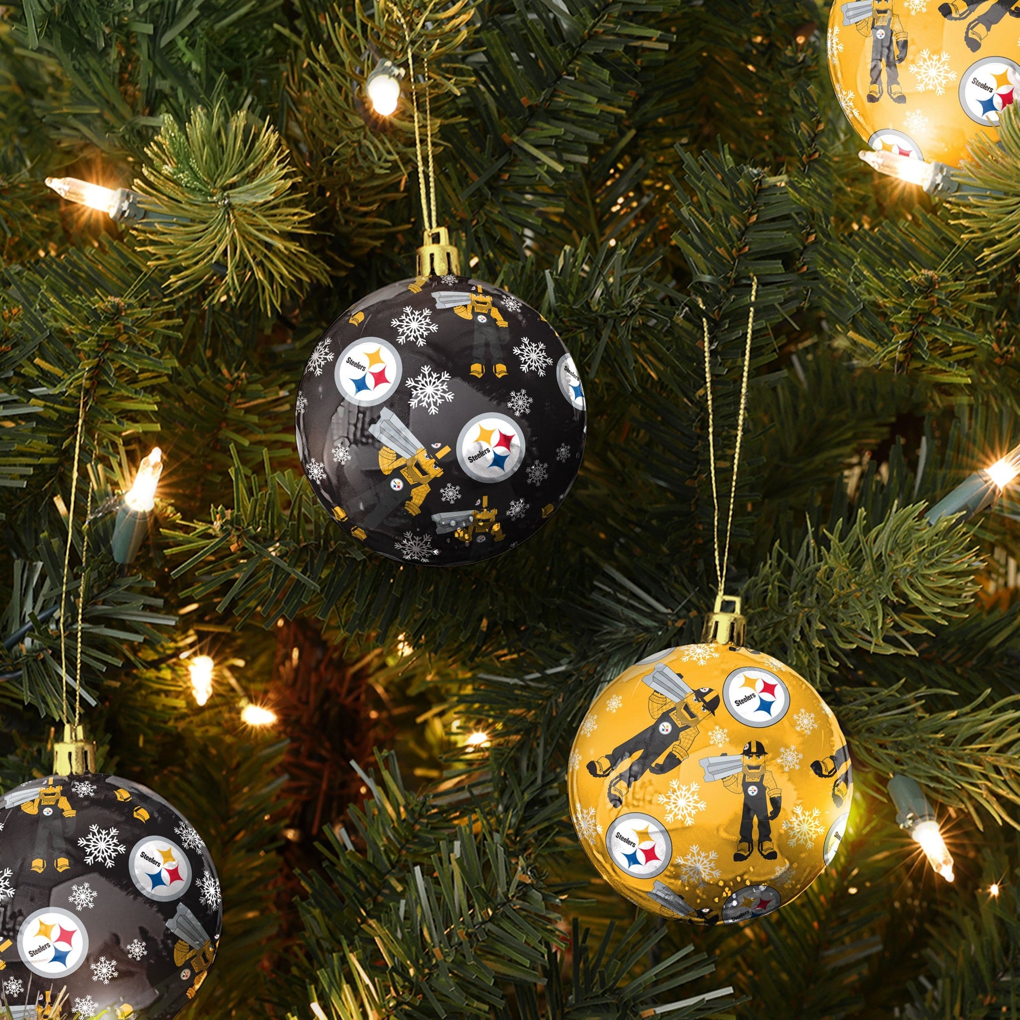 Bring the spirit of the season and your team together with the Pittsburgh Steelers 4 Pack Ball Mascot Ornament Set. This festive set includes four lightweight, plastic ornaments in two bold team-colored designs, each featuring repeat mascot and logo graphics.