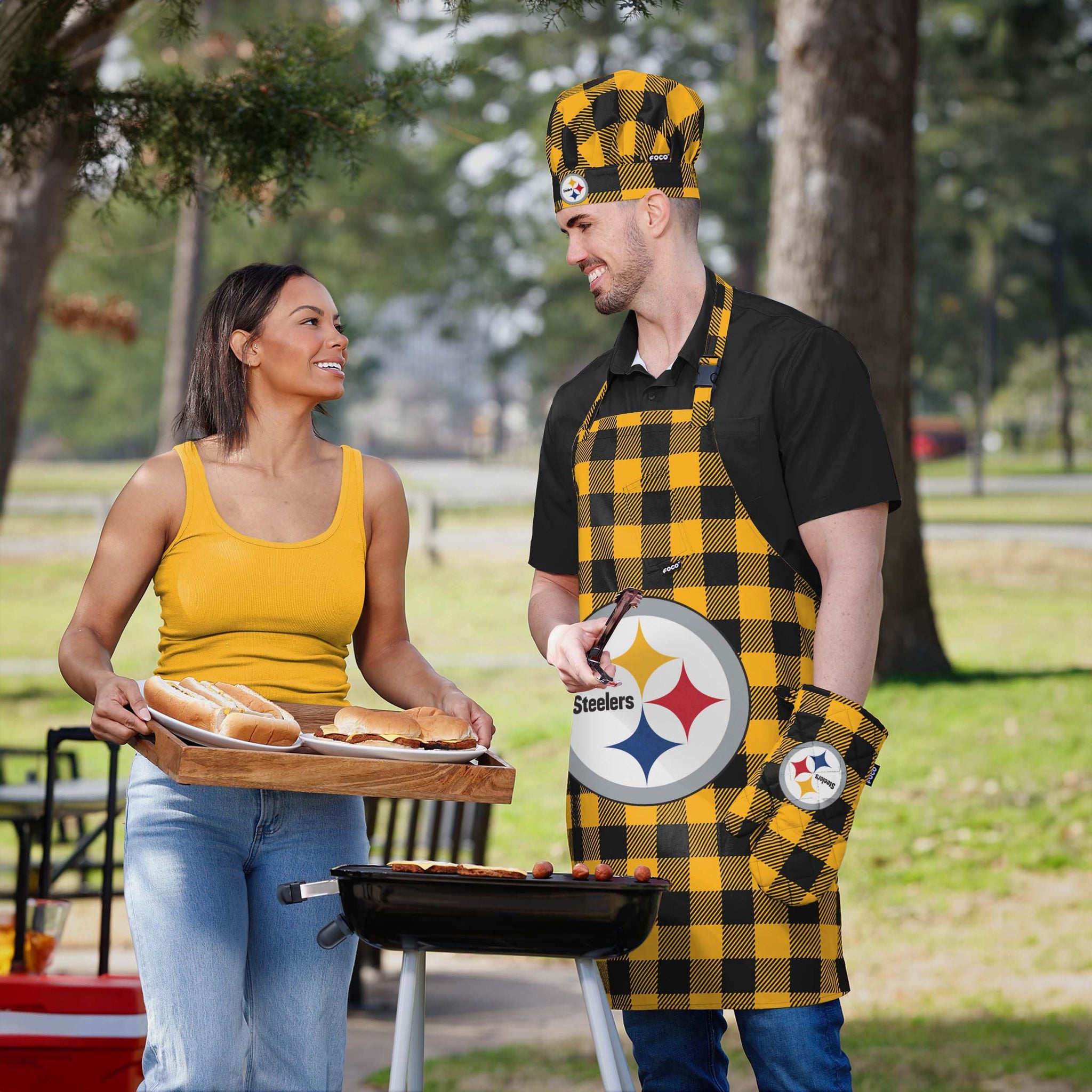 Get ready to serve up the best food in the greatest fan fit. From the kitchen, to the table, to game day, do it all in style with the Pittsburgh Steelers Plaid Chef Set.