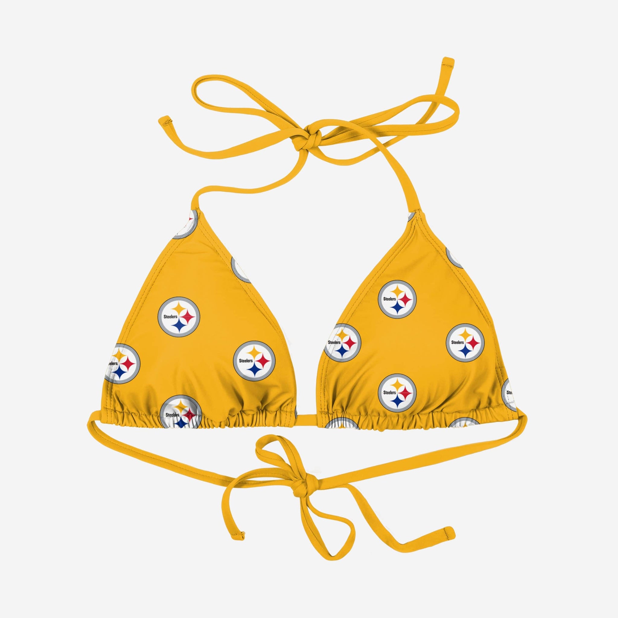Take your team pride poolside and lounge like a legend in the Pittsburgh Steelers Women's Mini Print Bikini Top!