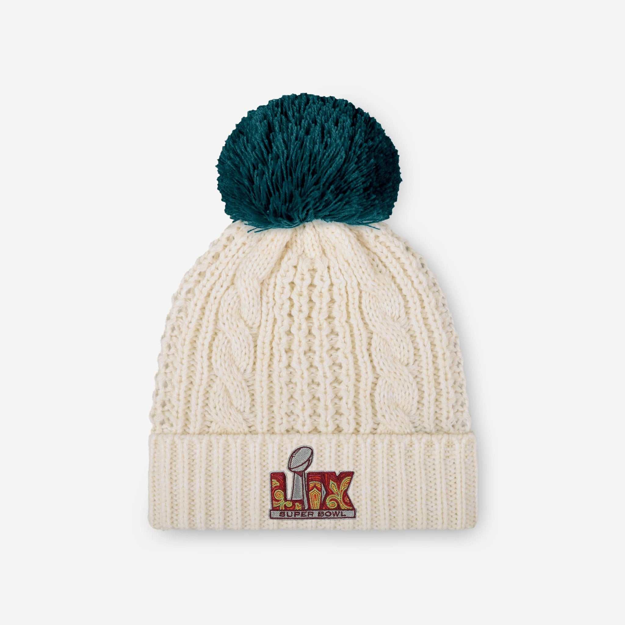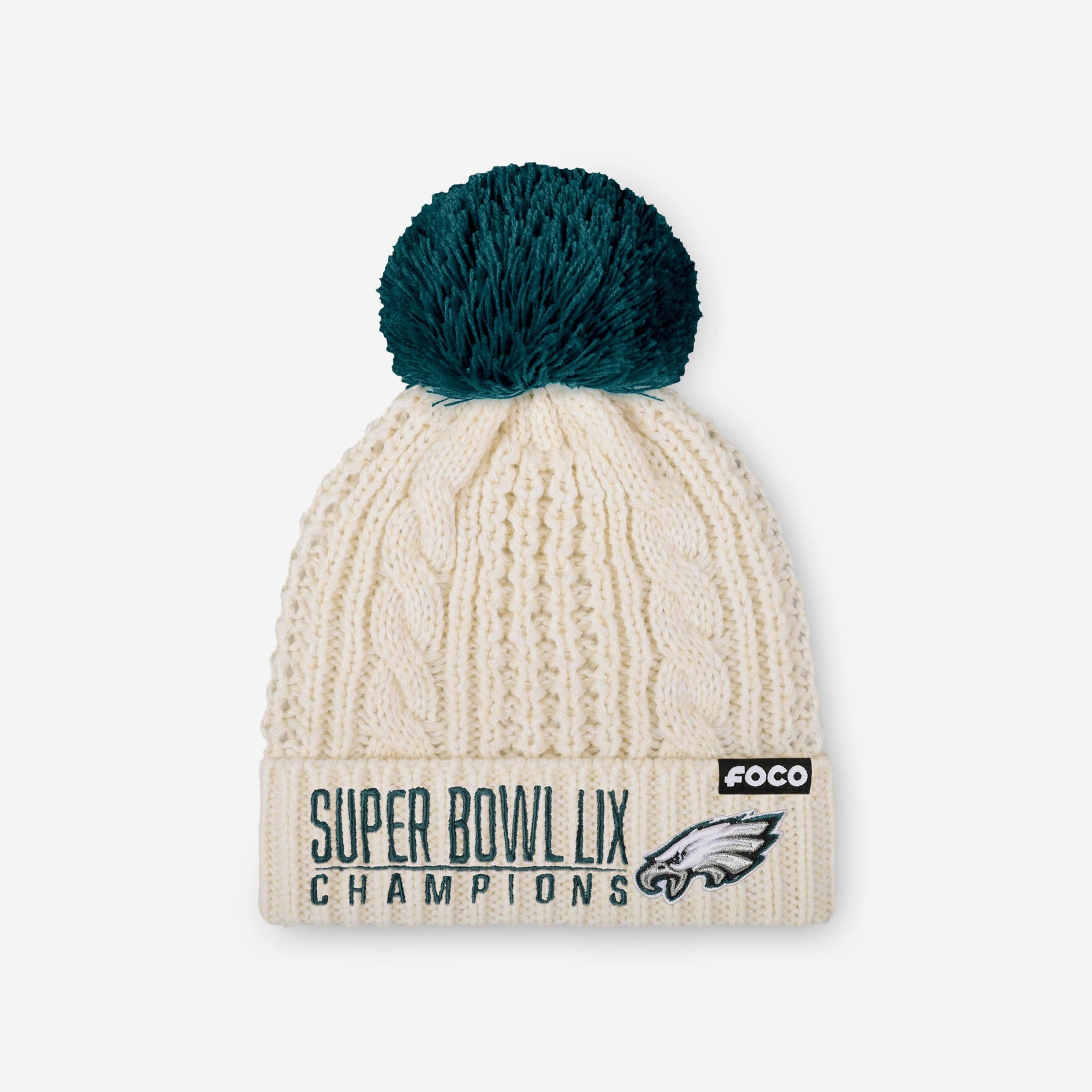 Putting together the ultimate fit for the tailgate and beyond? Make sure to get your head in the game with the Philadelphia Eagles Super Bowl LIX Champions Primary Logo White Cable Knit Pom Beanie!