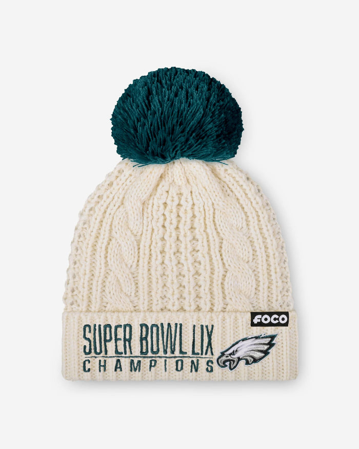 Philadelphia Eagles Super Bowl LIX Champions Primary Logo White Cable Knit Pom Beanie FOCO - FOCO.com