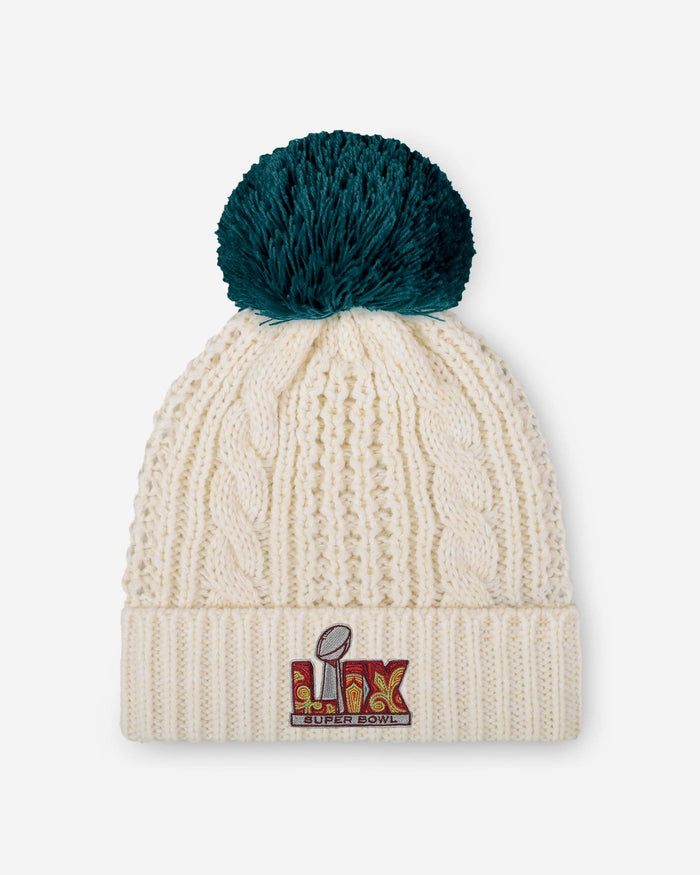 Philadelphia Eagles Super Bowl LIX Champions Primary Logo White Cable Knit Pom Beanie