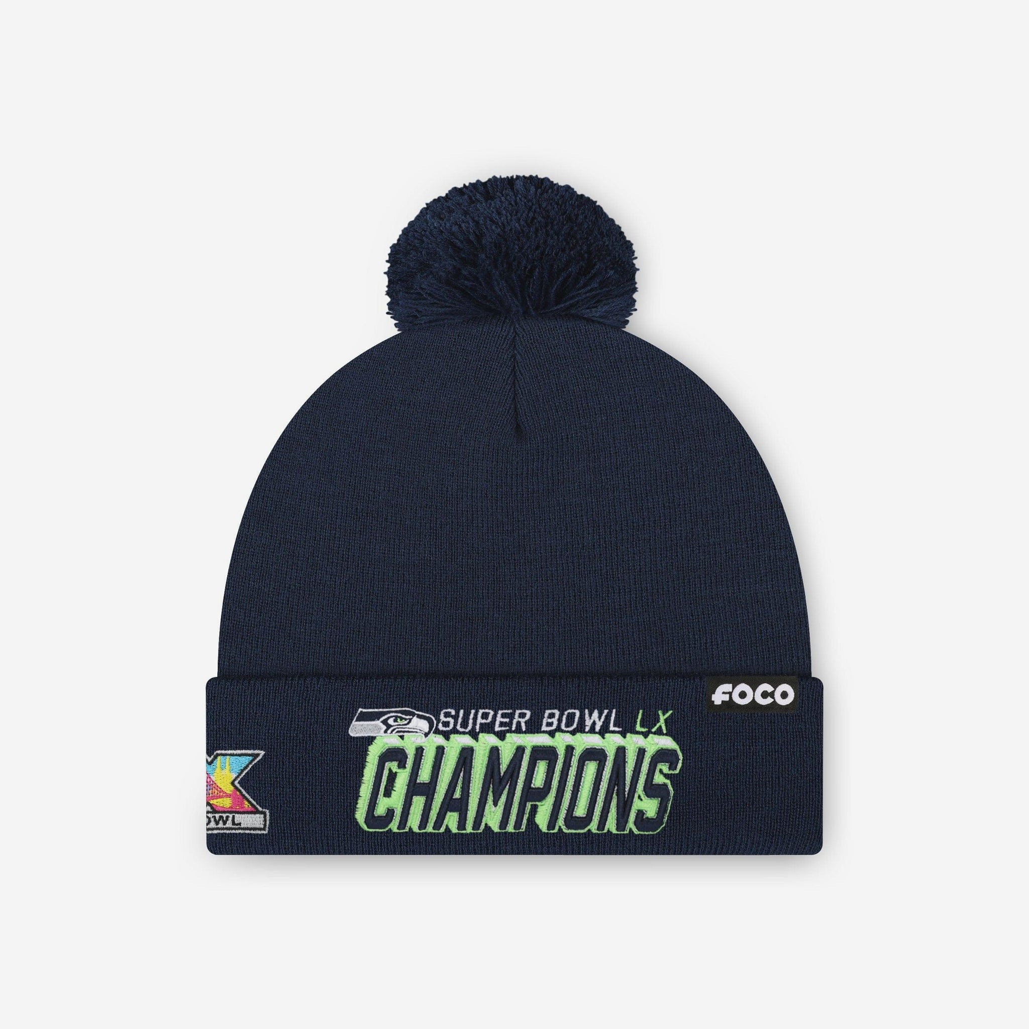 Seattle Seahawks Super Bowl LX Champions Basic Primary Logo Pom Beanie FOCO - FOCO.com