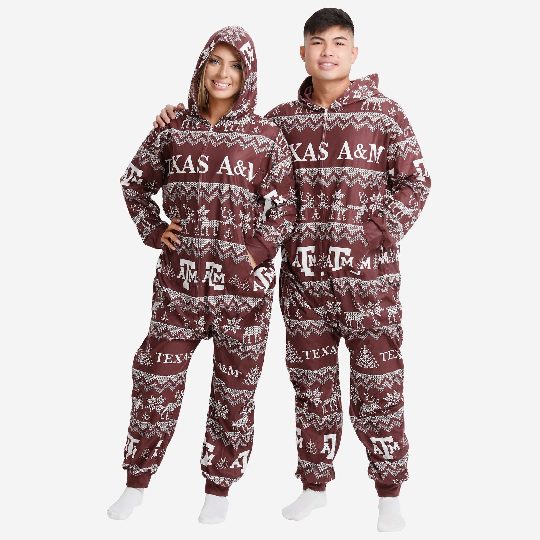 Get some matching family pajamas and dress to impress this holiday season! You won't want to miss these onesie team pajamas! These men's and women's PJ's are comfortable and show off your team spirit in the form of some sweet one piece jammies. Introducing the Texas A&M Aggies Ugly Pattern One Piece Pajamas! Don't forget to take your holiday photo with the whole family wearing matching Christmas pajamas!