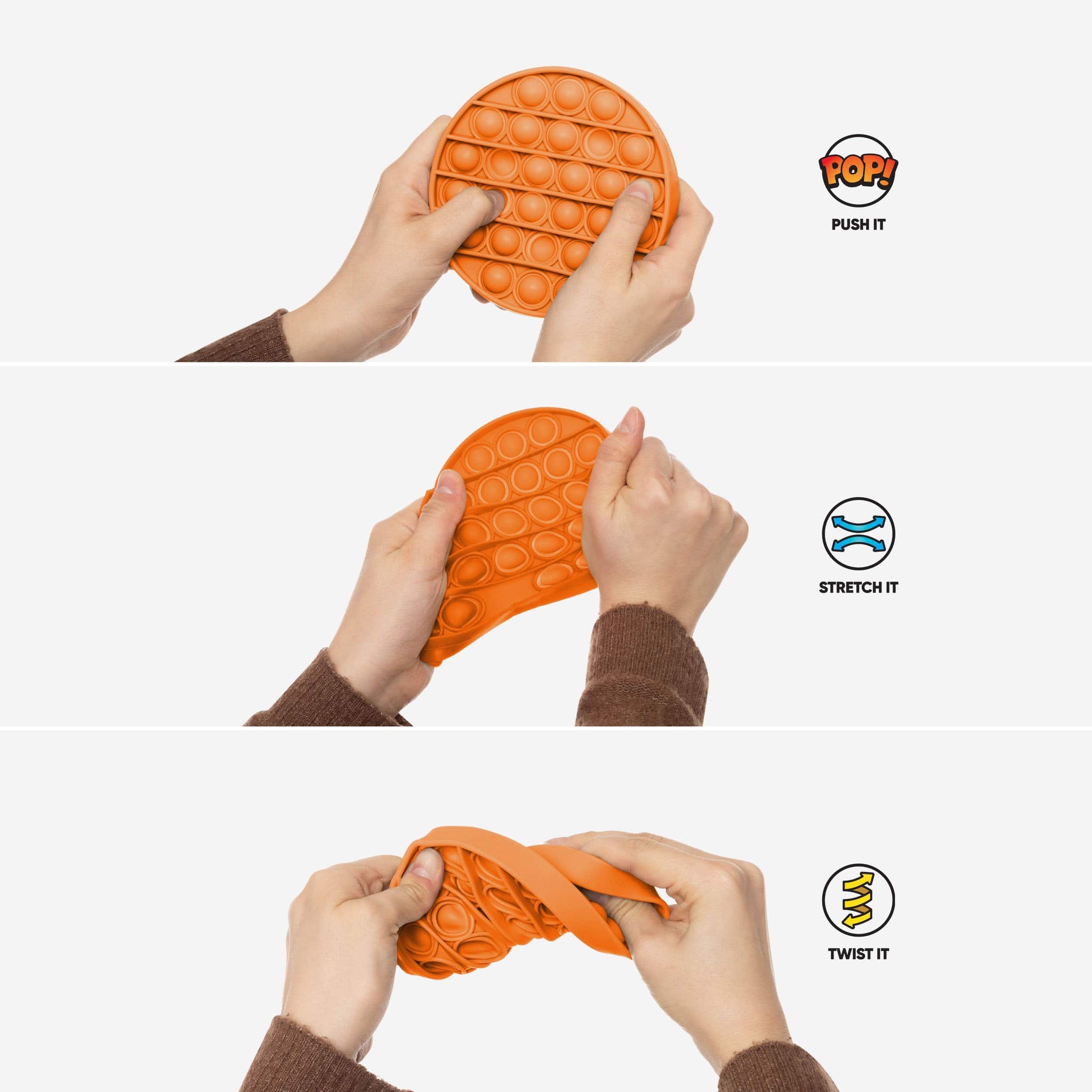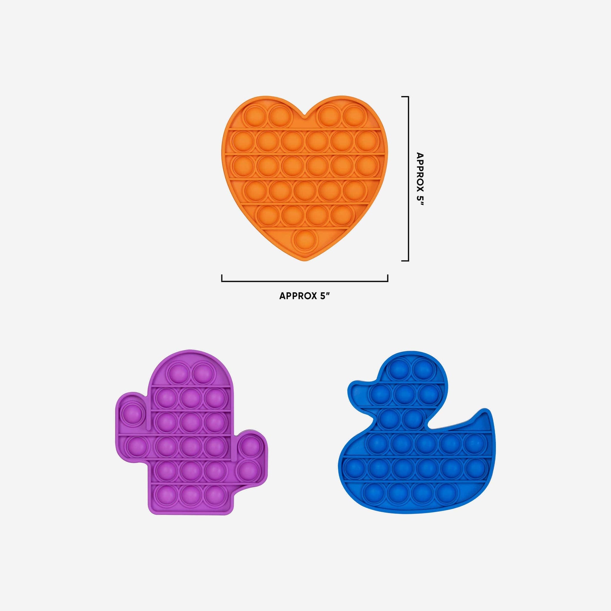 - Three-pack of vibrant colored fidget popper toys in fun shapes that will put a smile on any face
