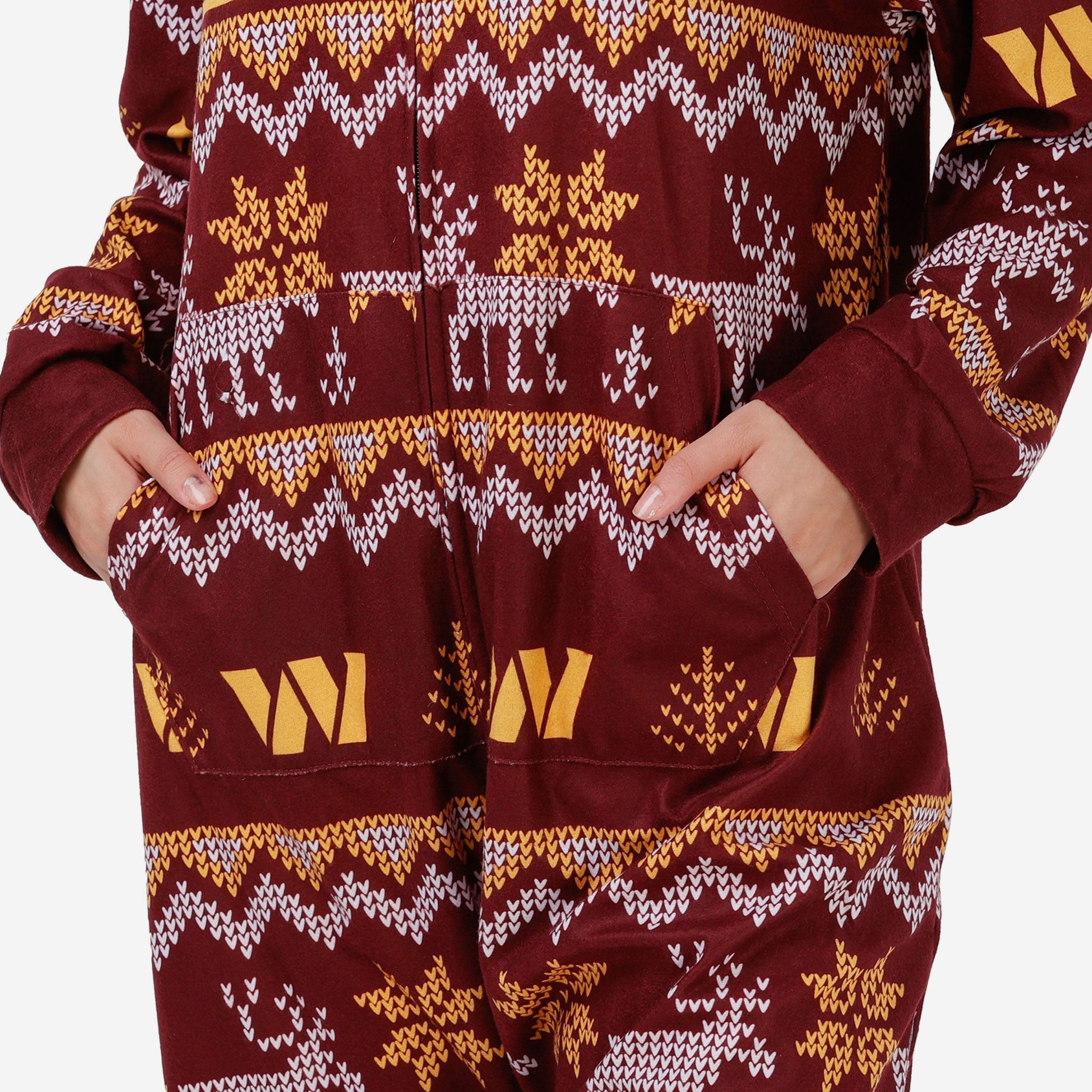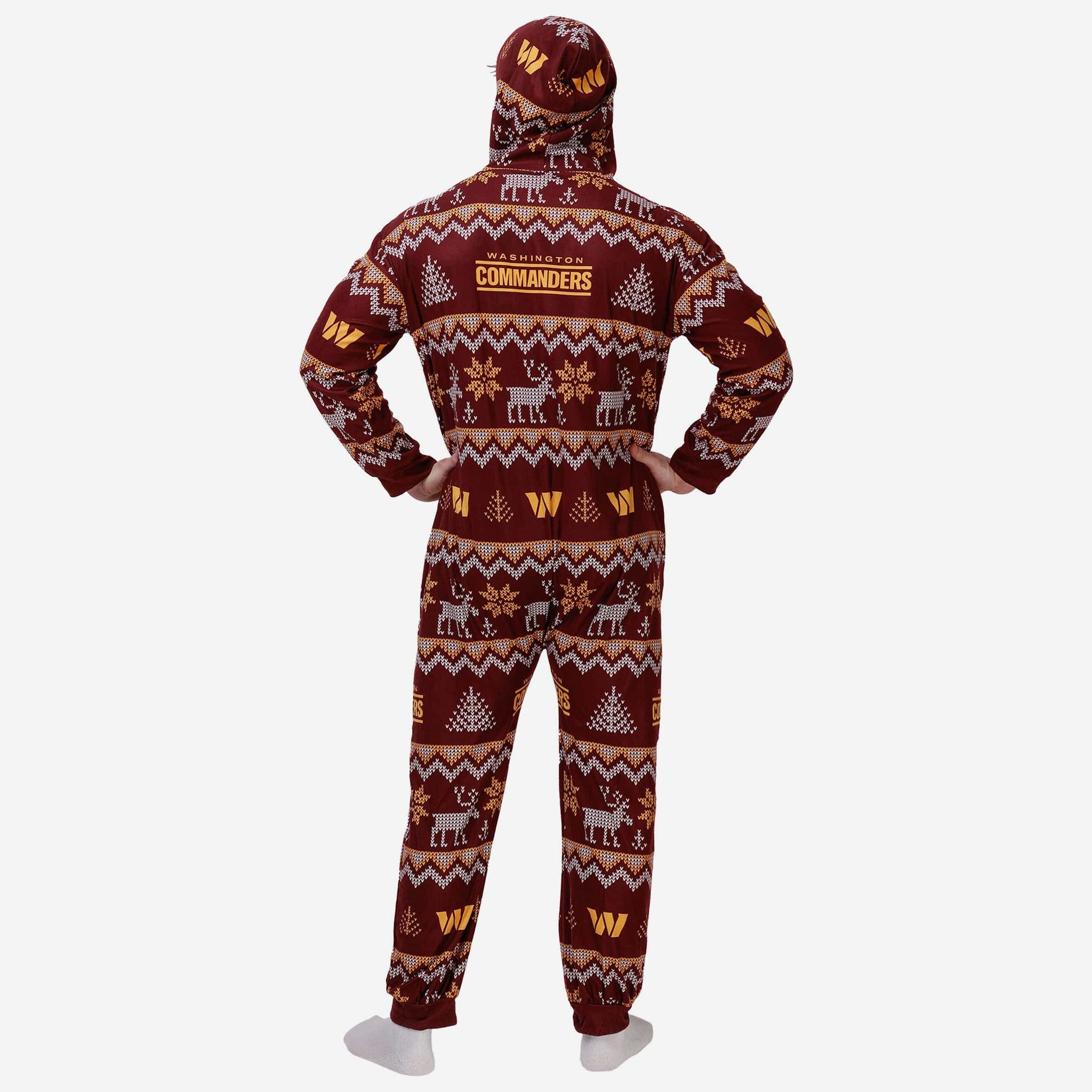 Get some matching family pajamas and dress to impress this holiday season! You won't want to miss these onesie team pajamas! These men's and women's PJ's are comfortable and show off your team spirit in the form of some sweet one piece jammies. Introducing the Washington Commanders Ugly Pattern One Piece Pajamas! Don't forget to take your holiday photo with the whole family wearing matching Christmas pajamas!