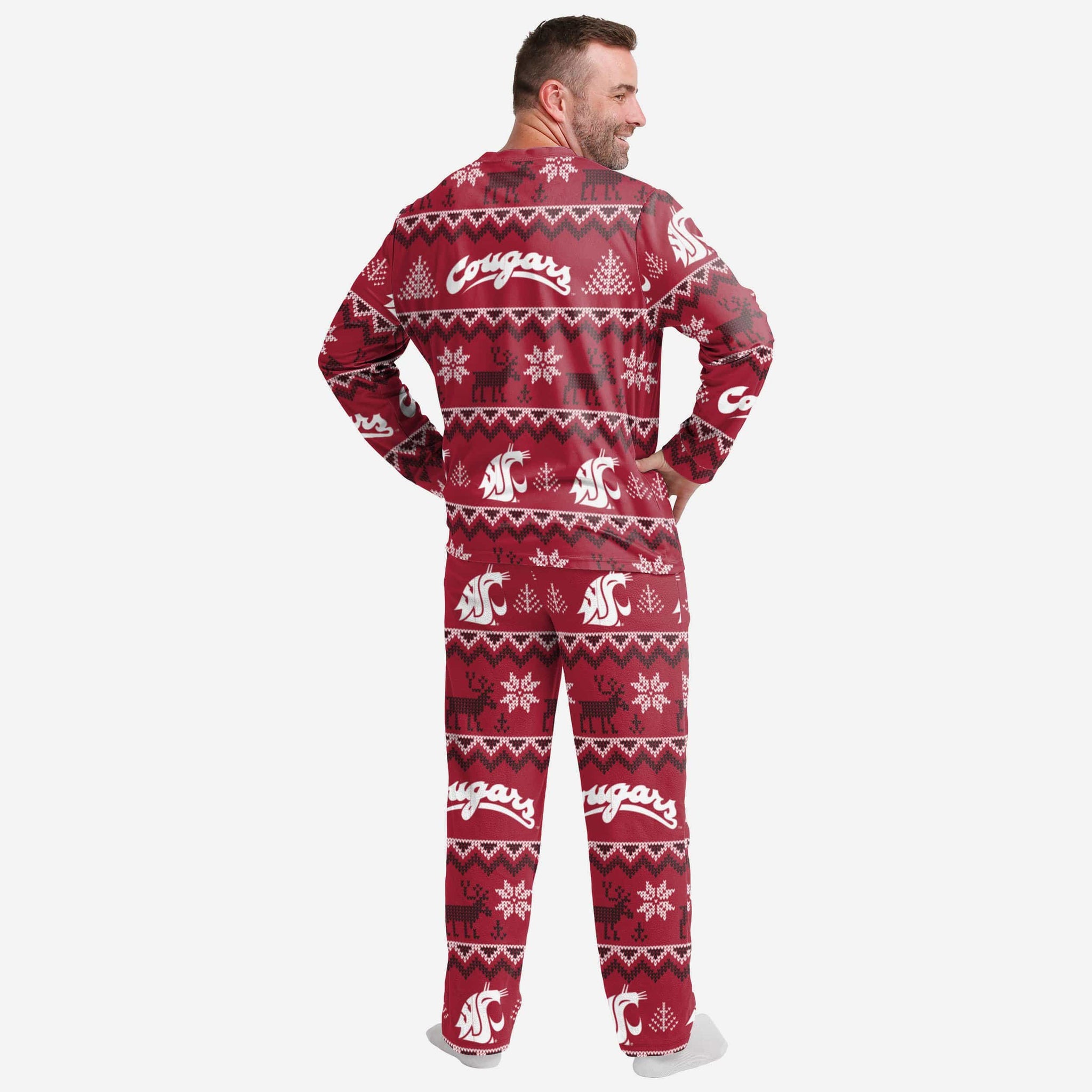 Get some matching family pajamas and dress to impress this holiday season! You won't want to miss these men's team pajamas! These men's PJ's are comfortable and show off your team spirit in the form of some sweet men's jammies. Introducing the Washington State Cougars Ugly Pattern Family Holiday Pajamas! Don't forget to take your holiday photo with the whole family wearing matching Christmas pajamas!