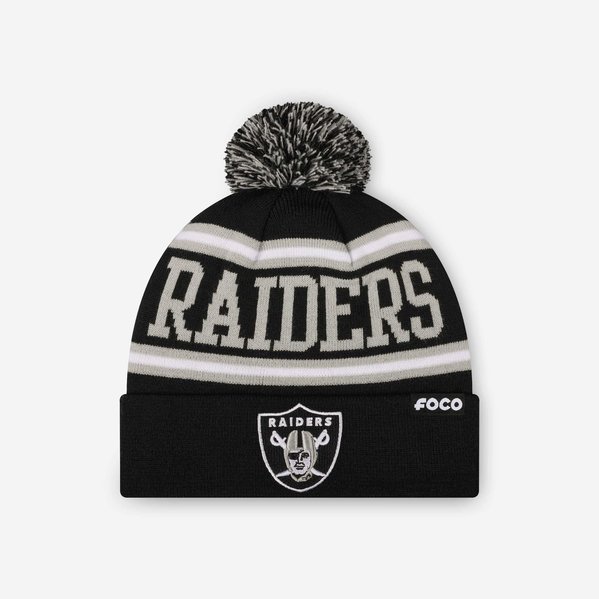 Las Vegas Raiders Primary Logo Stripe Pom Beanie FOCO - FOCO.com