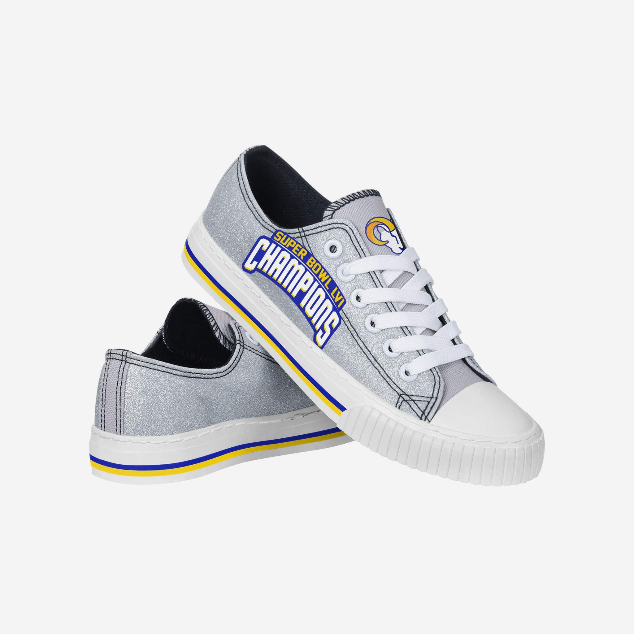 Who said being a fan of the champs can't be stylish? Certainly not us. That's because these Los Angeles Rams Super Bowl LVI Champions Glitter Low Top Canvas Shoes exist.