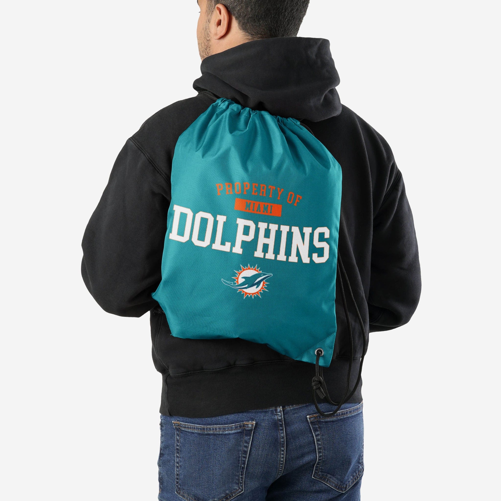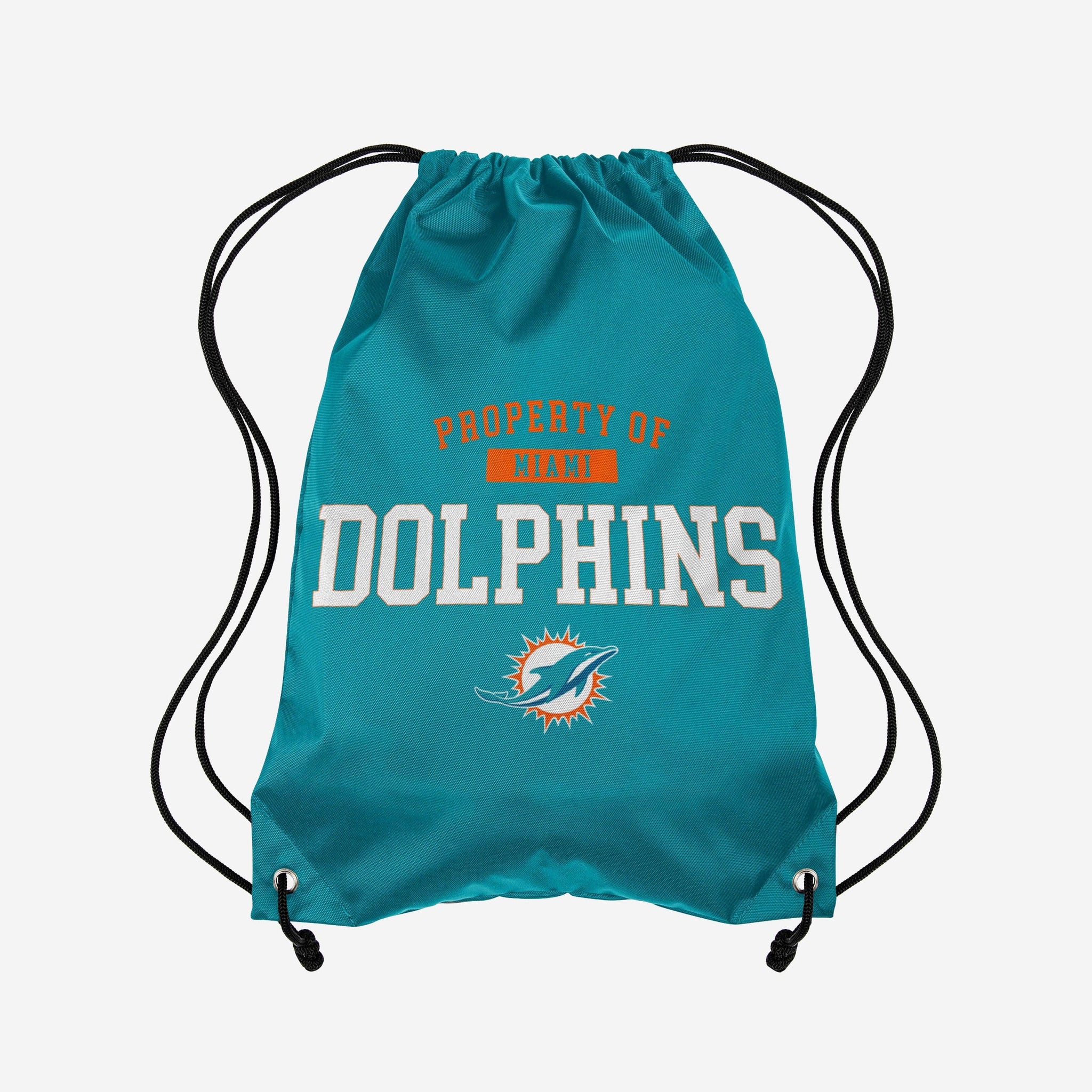 When you store your gear in this Miami Dolphins Property Of Drawstring Backpack, you'll feel like you're on the sidelines with your favorite team. Even if you're just on your way to your history exam.