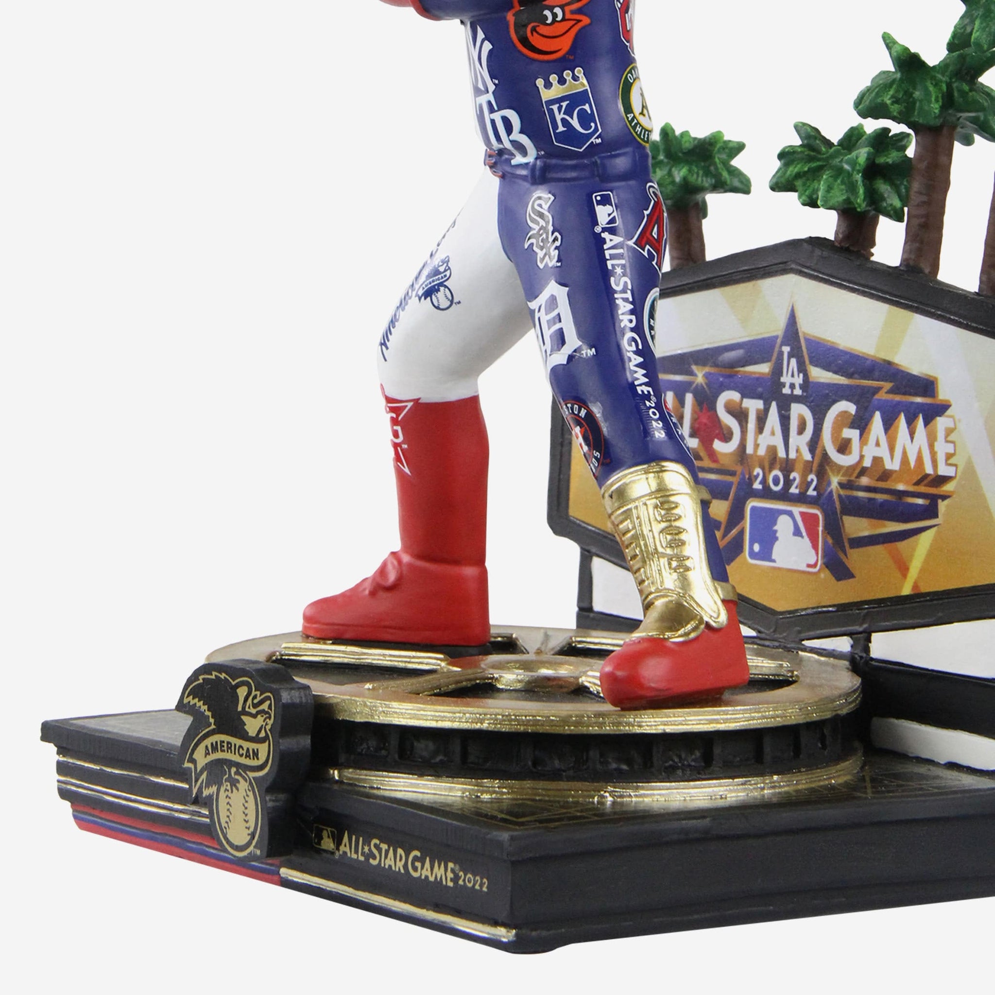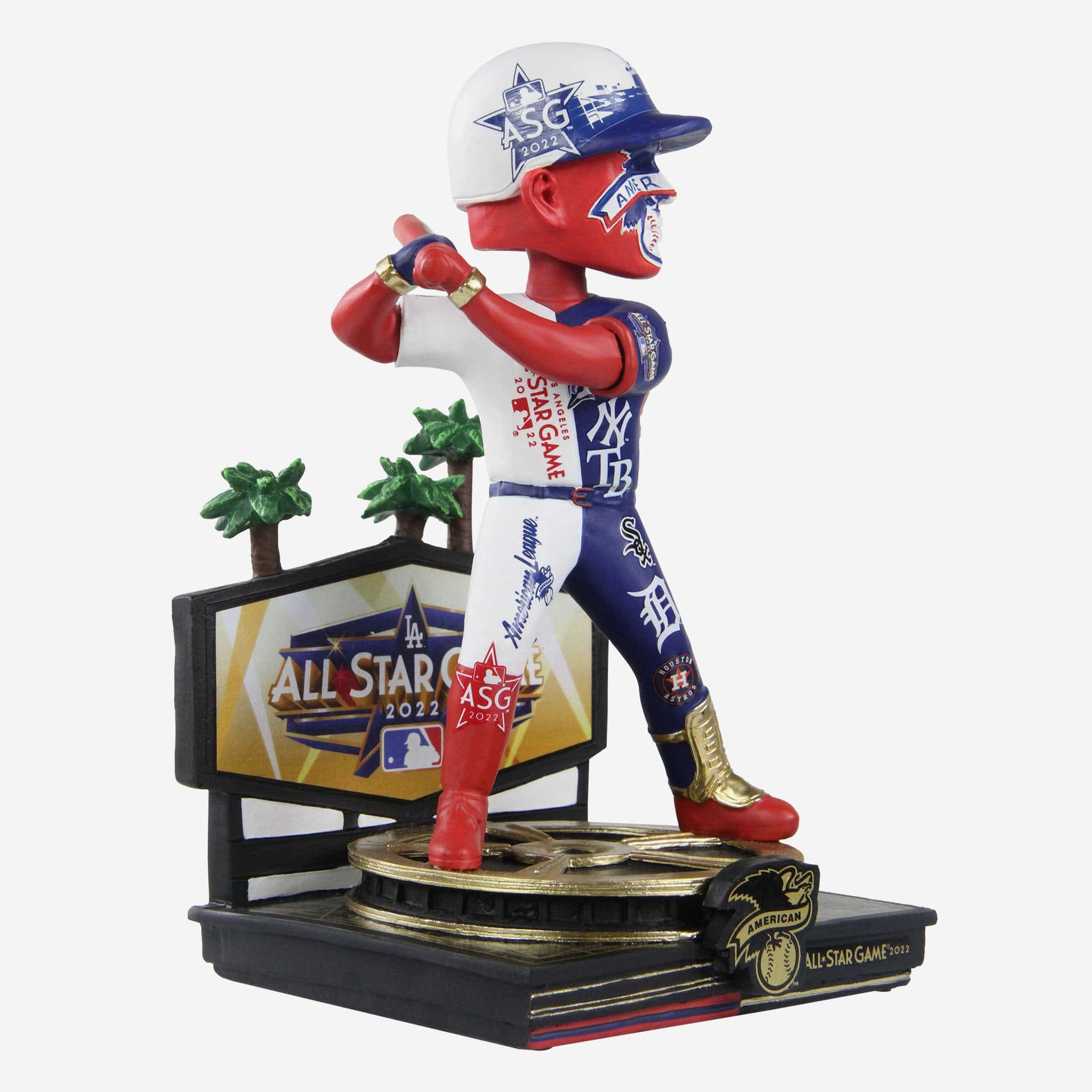 • Gold-colored 2022 MLB All-Star Game logo and American League logo display on front of base, because this bobble is good as gold