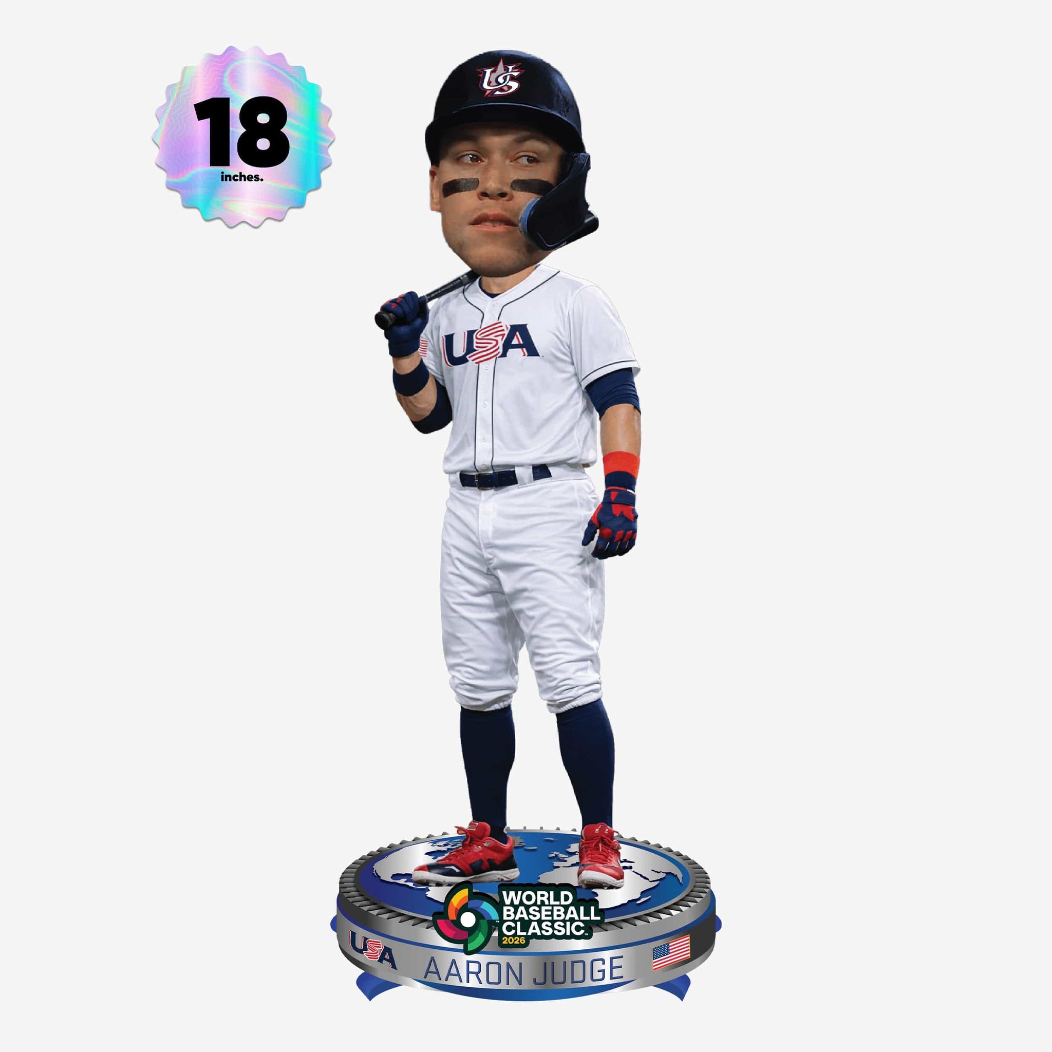 All rise for international power! Bring larger-than-life star power to your collection with this Aaron Judge USA 2026 World Baseball Classic 18 in. Bobblehead.