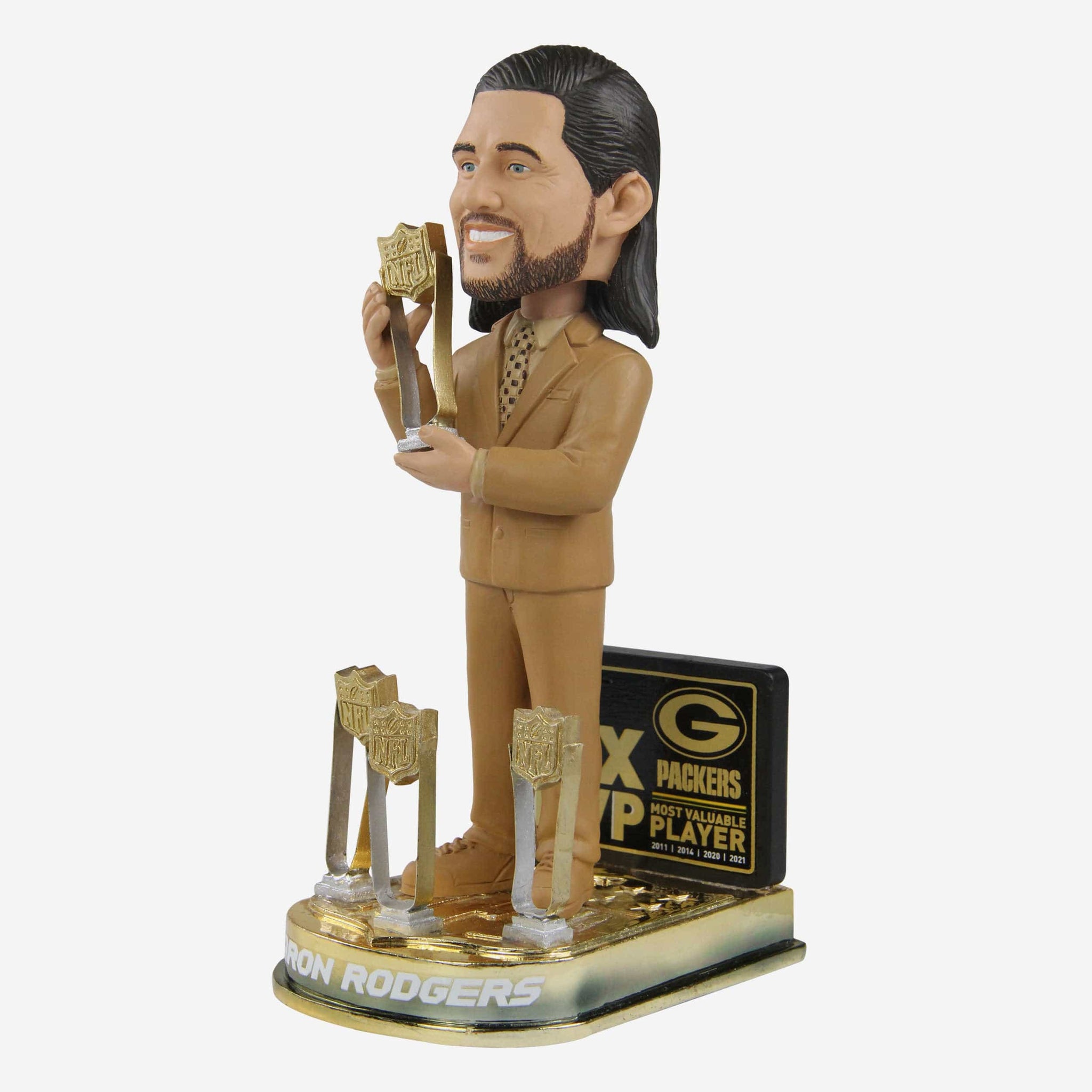 - Rodgers holding a trophy with three at his feet for four in total, because four MVP trophies are better than one