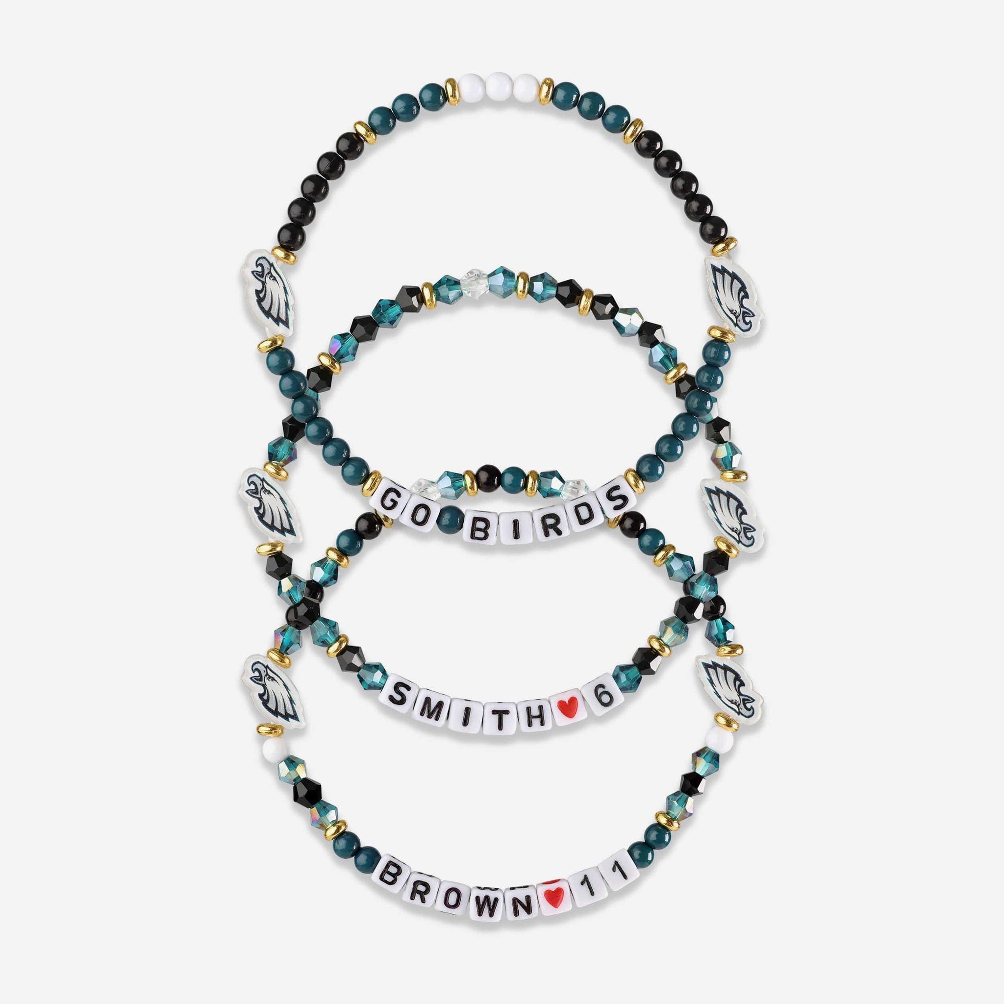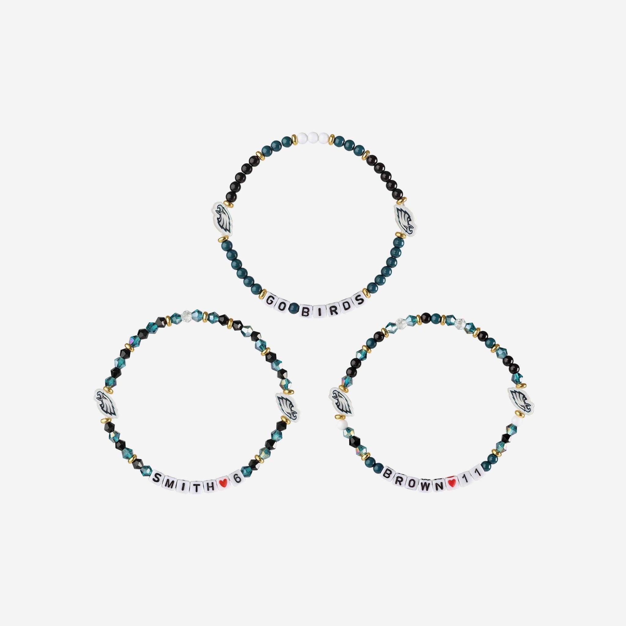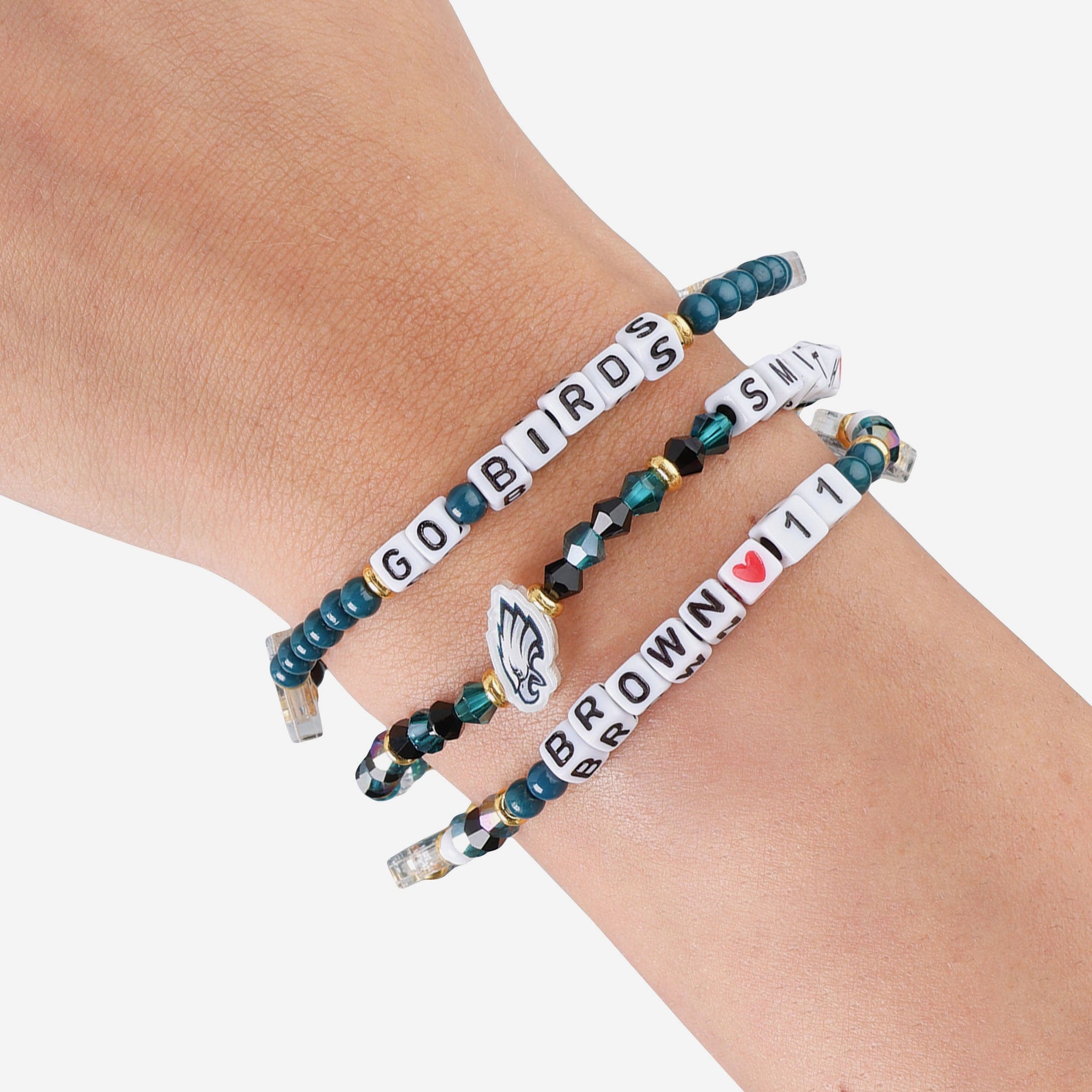 Accessorize and maximize your fandom while impressing your fellow fans with this A.J. Brown & DeVonta Smith Philadlephia Eagles 3 Pack Player Friendship Bracelet. These matching friendship bracelets have an all-over team-colored design and team logo displays, which makes them the perfect way to show your support for the Philadlephia Eagles and get in on the latest accessory craze.