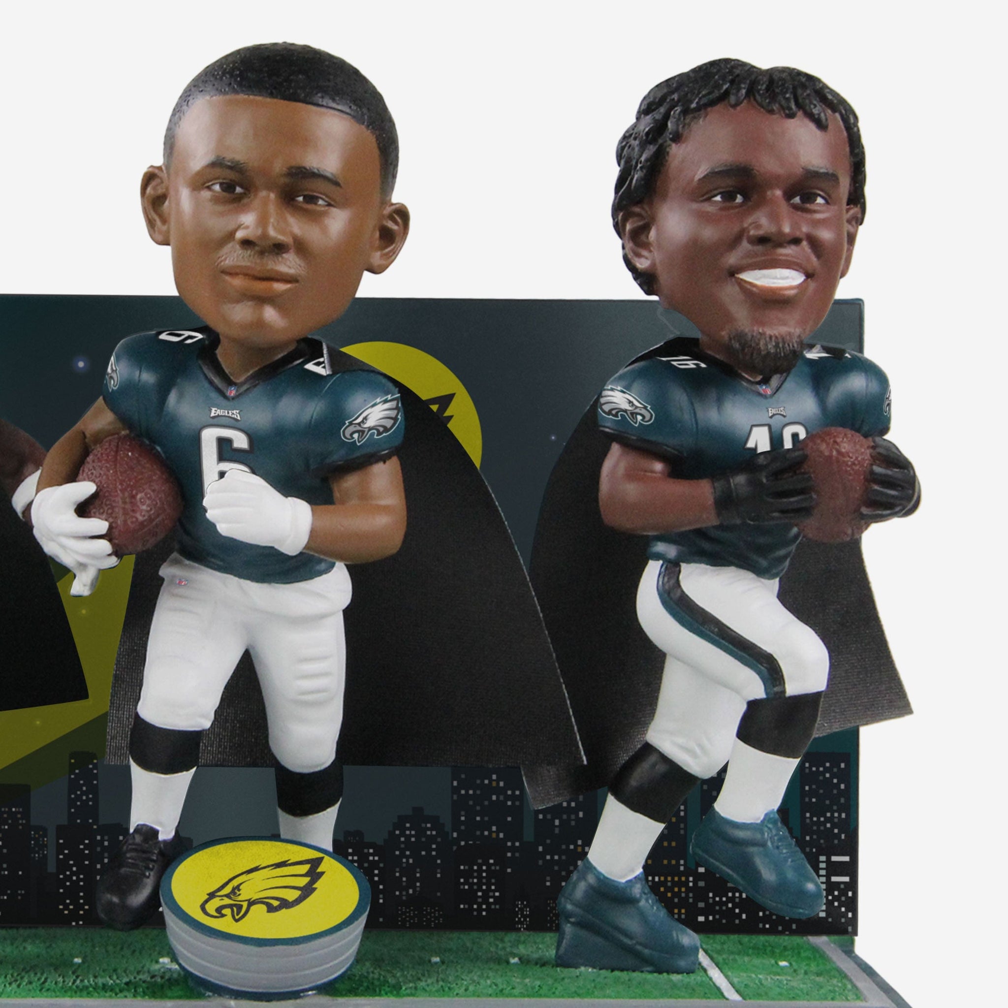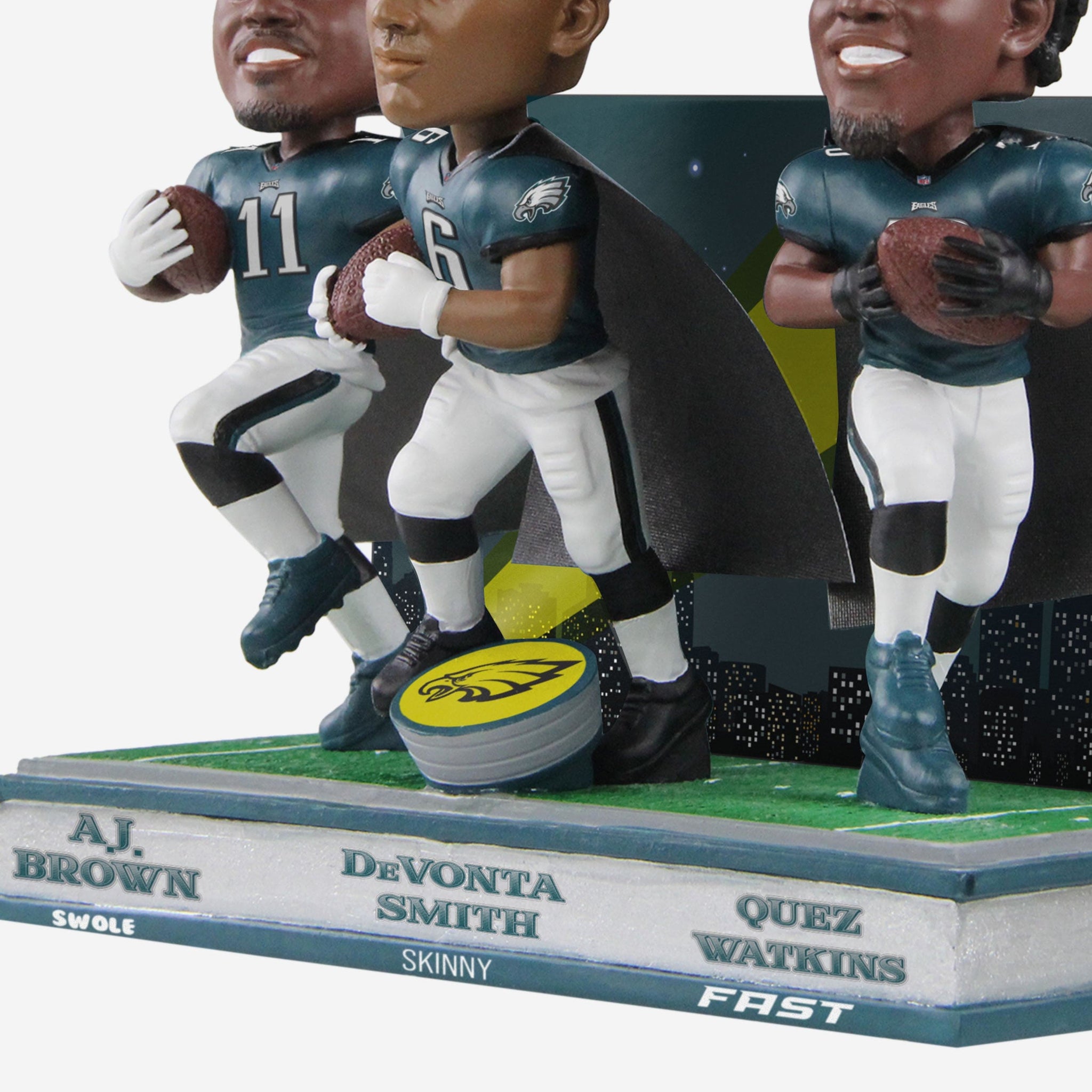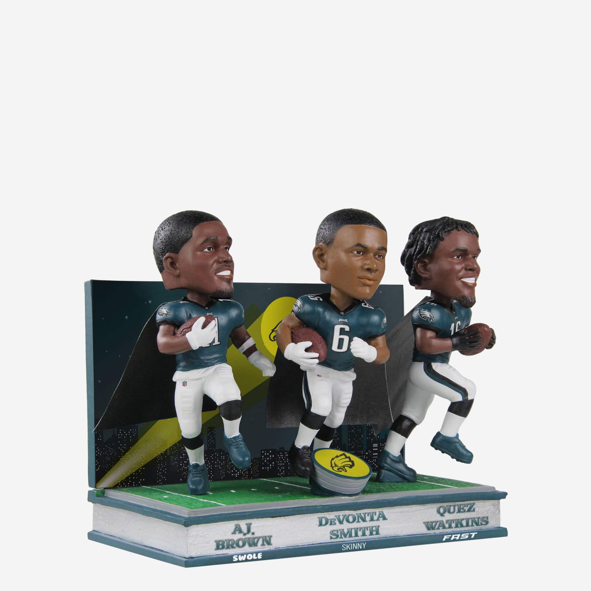When that unmistakable logo hits the sky, opponents beware. Defenders will learn to fear the night with this A.J. Brown & DeVonta Smith & Quez Watkins Philadelphia Eagles Swole Skinny Fast Triple Bobblehead on the prowl.