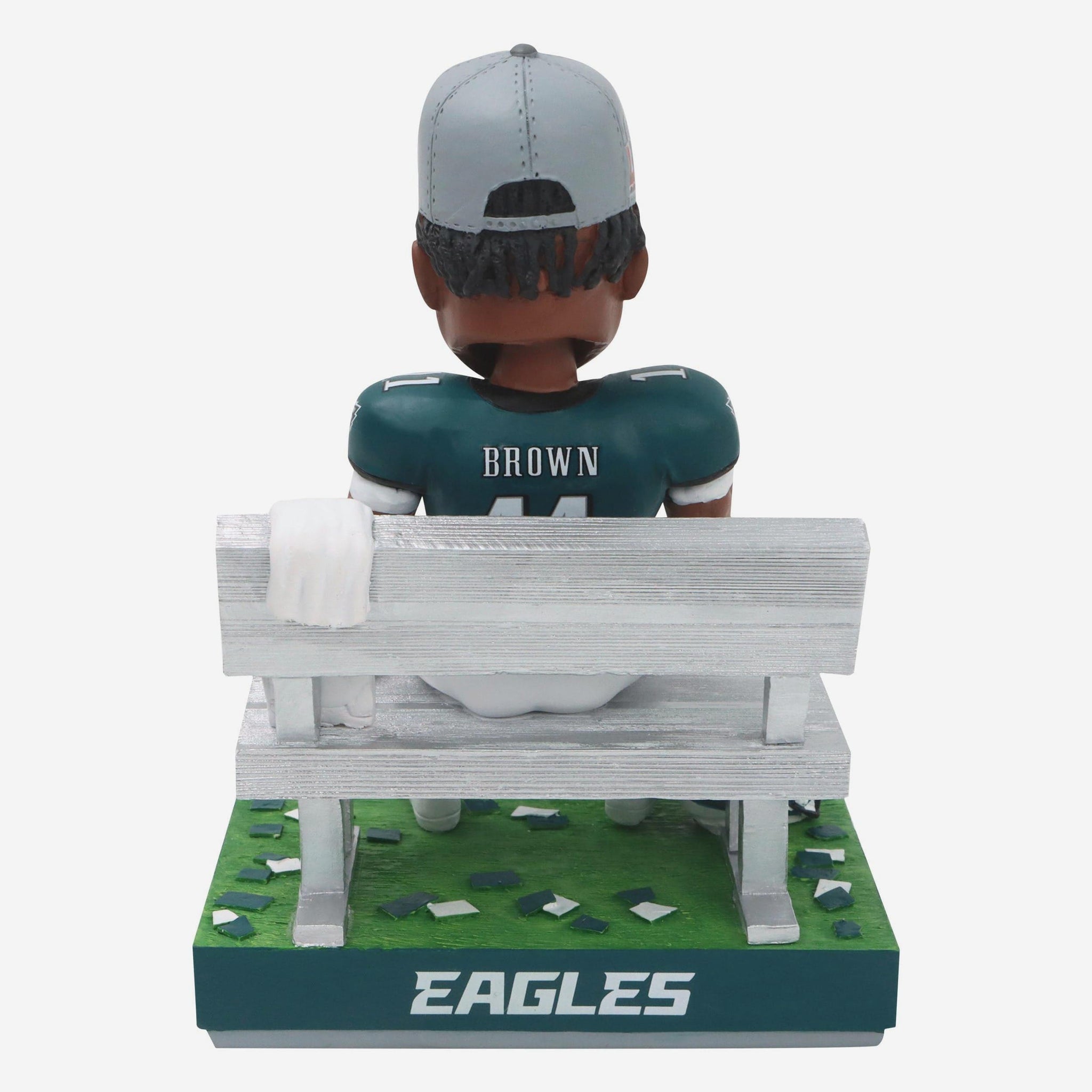 - Portrays Brown wearing his green gameday uniform, sitting on the sideline and reading a book with a team logo display, reading up the Eagles’ championship chapter