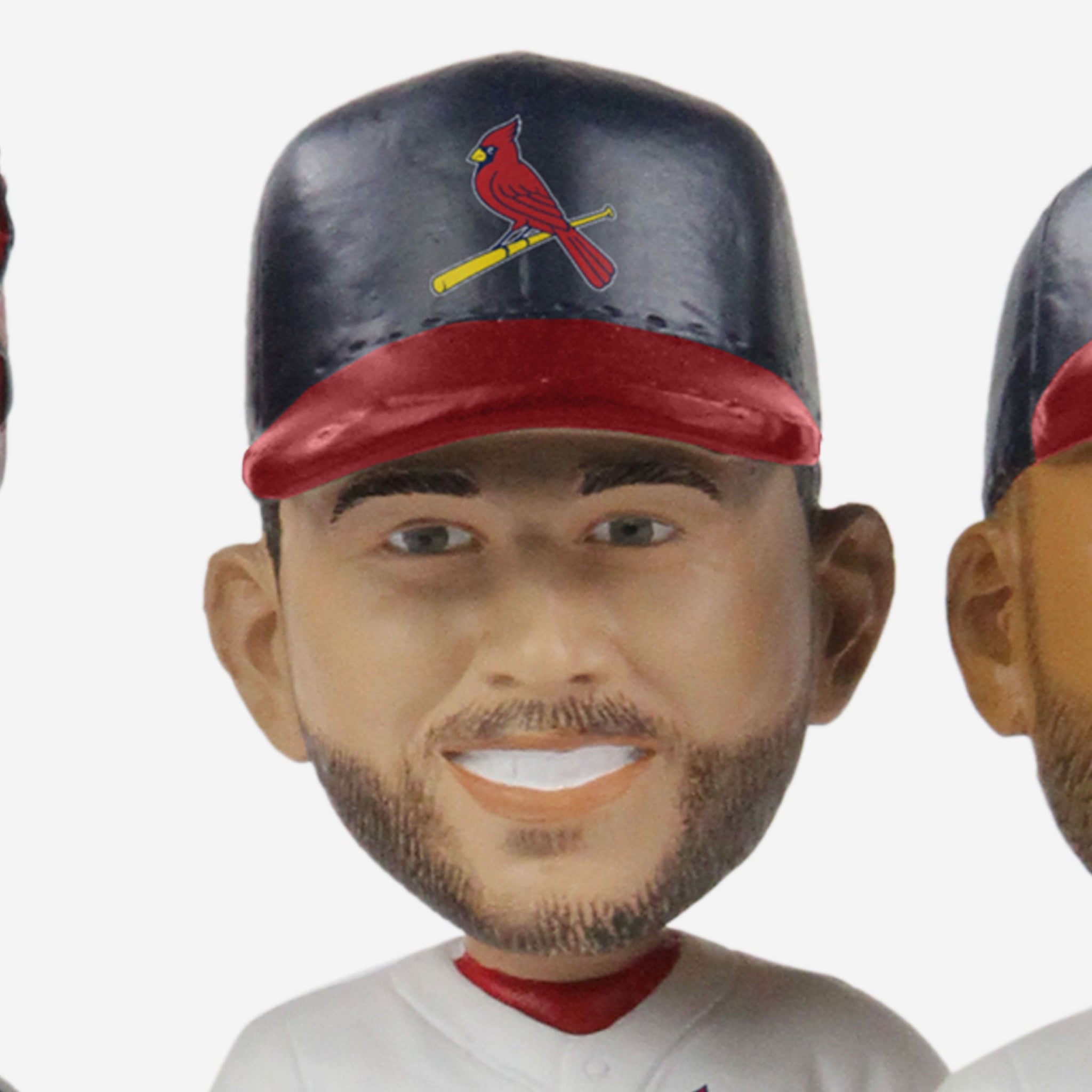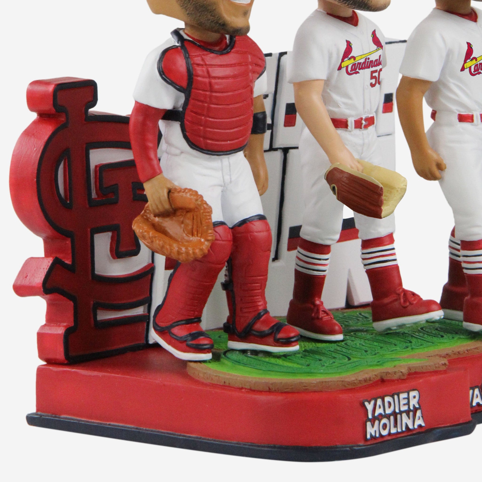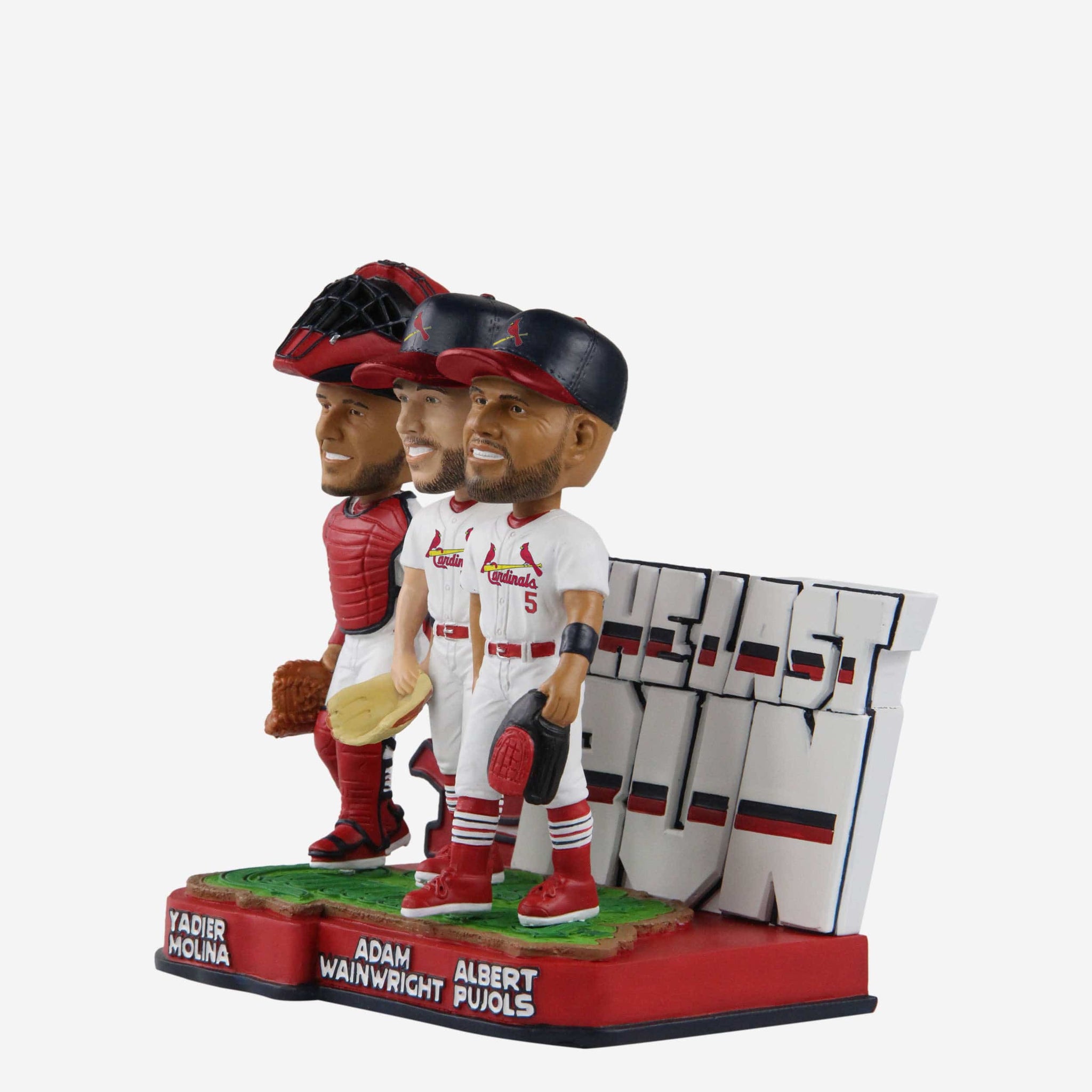 Three Cardinals legends, one last walk to the dugout. Celebrating an incredible era of Cards baseball is easy as 1-2-3 with this Albert Pujols & Yadier Molina & Adam Wainwright St. Louis Cardinals The Last Run Mini Bobblehead Scene on display in your collection.