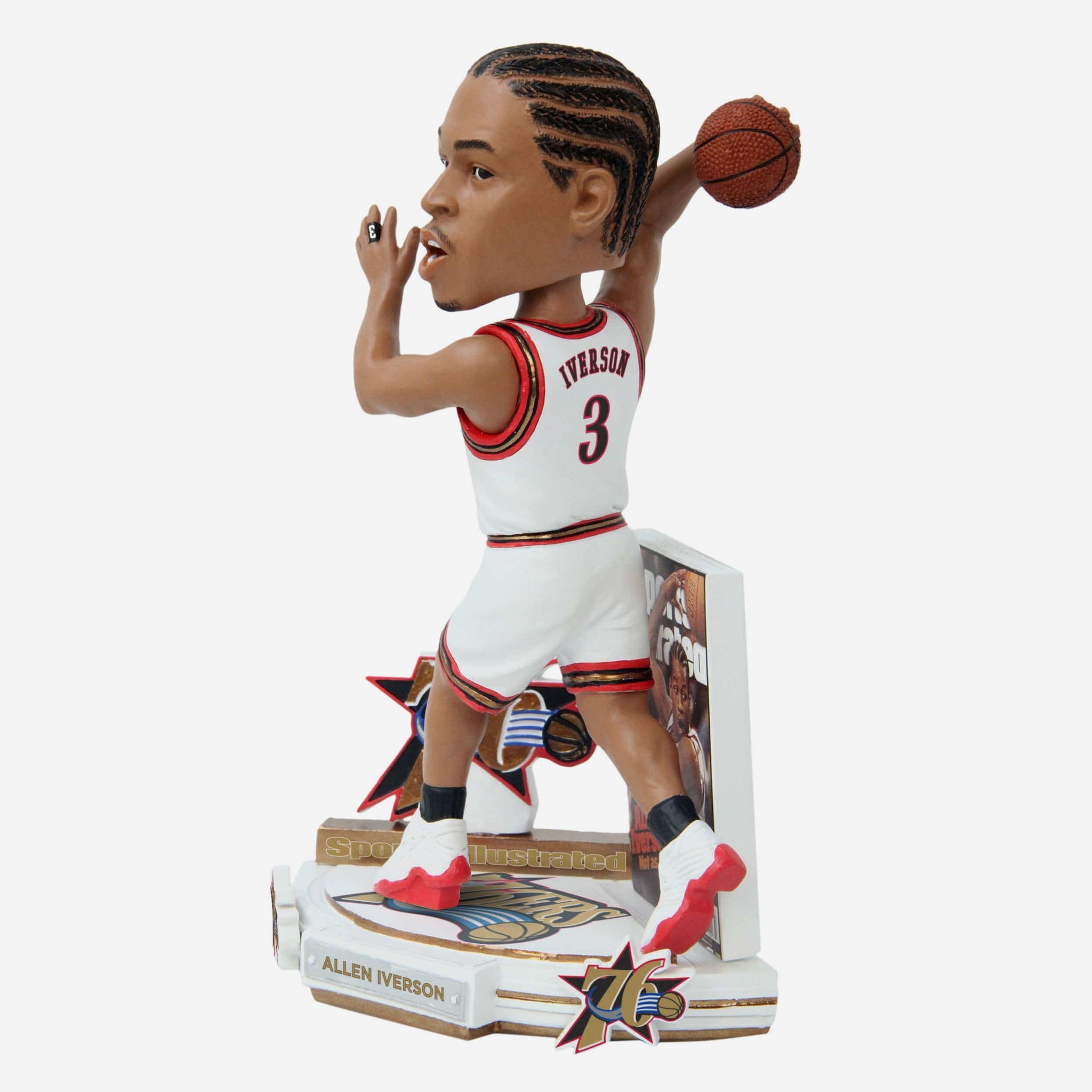 The Answer is here to bring his trademark swagger and skill from the hardwood to your fancave! Go cover-to-cover with this Allen Iverson Philadelphia 76ers Sports Illustrated Cover Bobblehead.