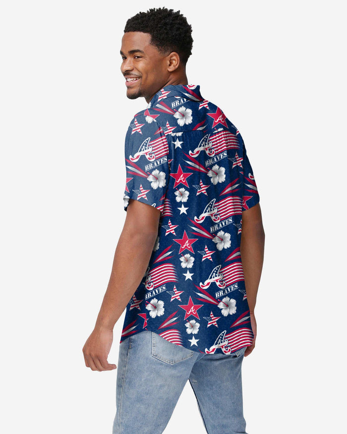 Stars + stripes + team spirit + style = The Atlanta Braves Americana Button Up Shirt. Dress to impress, all summer long!