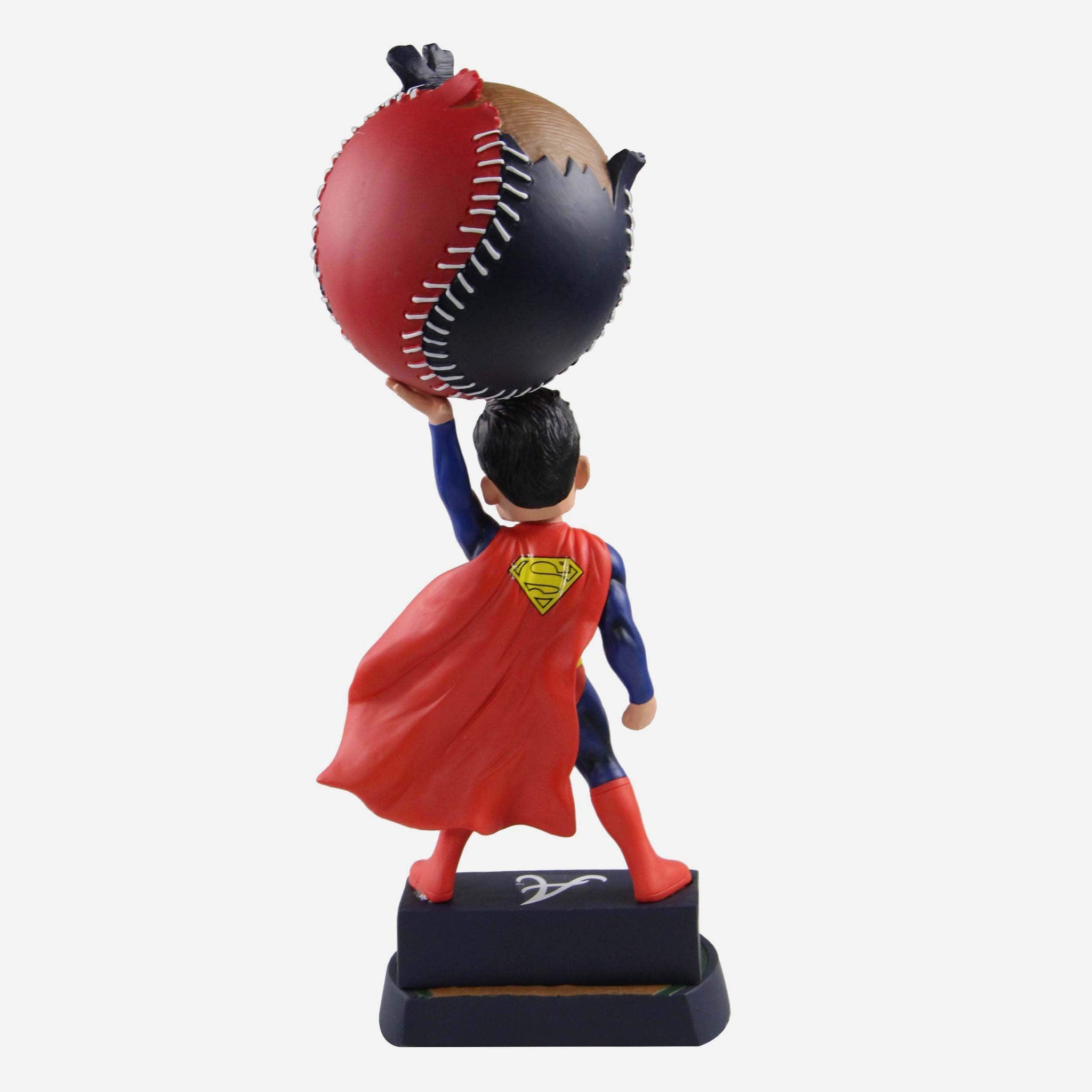 • Portrays Superman posing and holding a team-colored baseball with team logo display, showing off that super strength