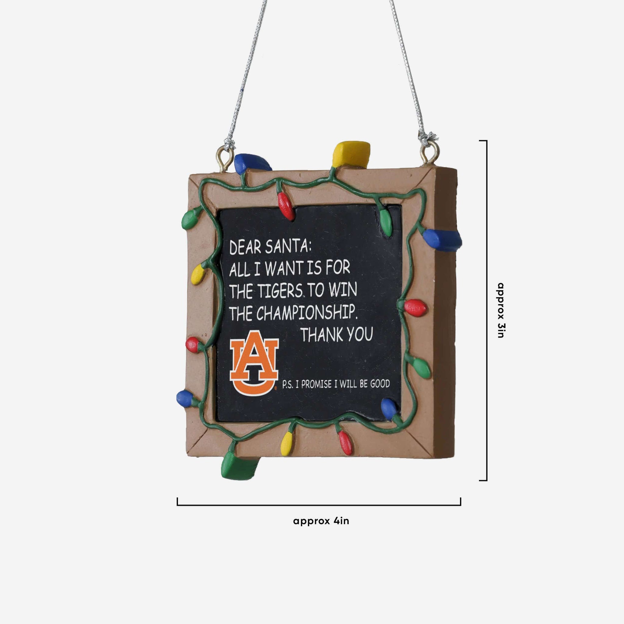 So, you made your list and sent it to jolly ol' Fanta Claus, asking him for a championship. But sometimes letters can get lost in the mail. Just in case, put this Auburn Tigers Resin Chalkboard Sign Ornament on your tree to let him know how good you've been this year, and that all you want for the holidays is a trophy.