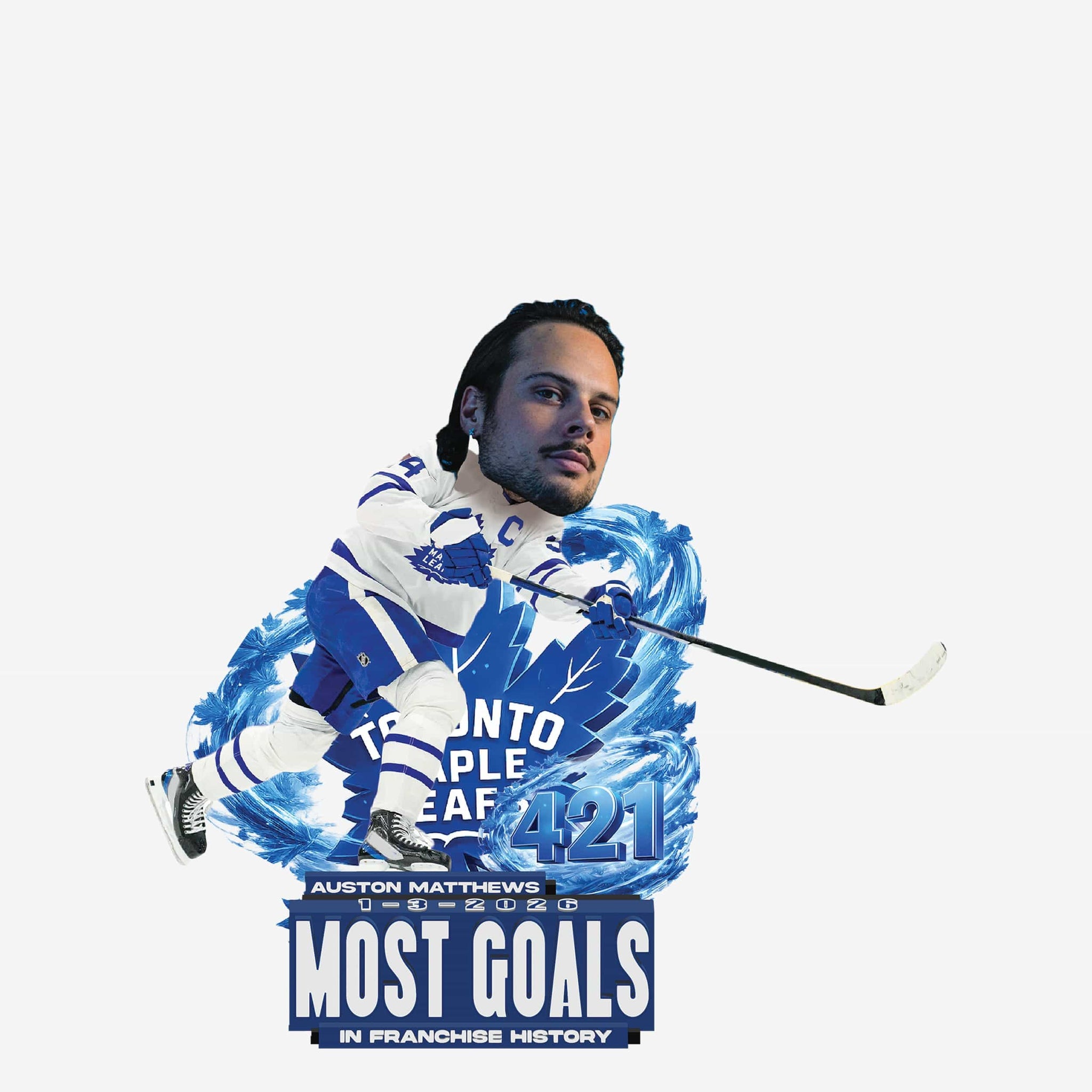 • Portrays Auston Matthews in his Toronto Maple Leafs gameday uniform, captured mid-shot as he continues to make history