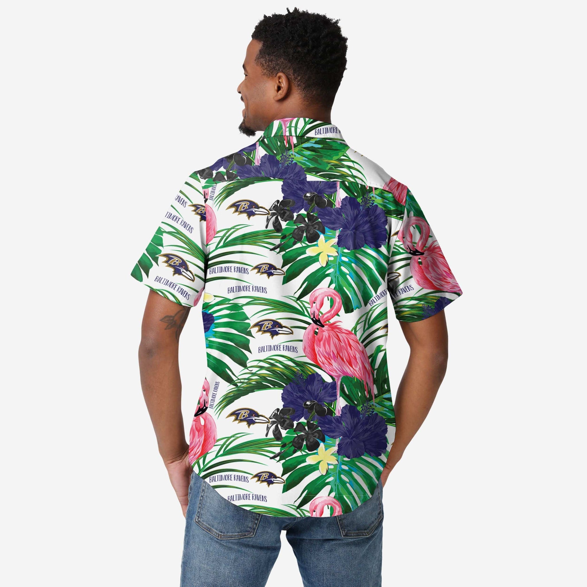 Aloha, party people! No need to set your watch - You're always on island time when you're rocking this Baltimore Ravens Flamingo Button Up Shirt.