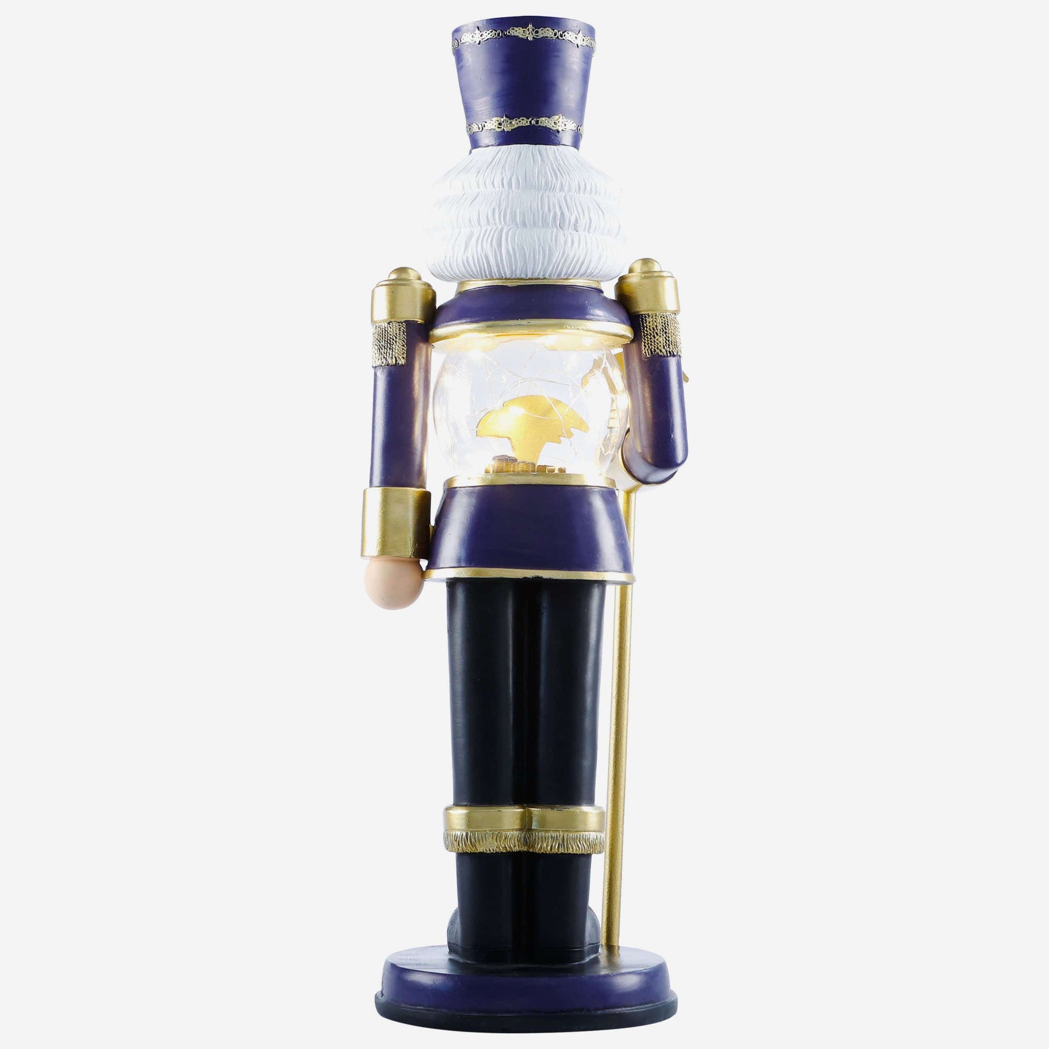 - Nutcracker's torso features clear globe with gold-colored team logo display, holiday gift accents, and light-up fairy lights for maximum holiday magic
