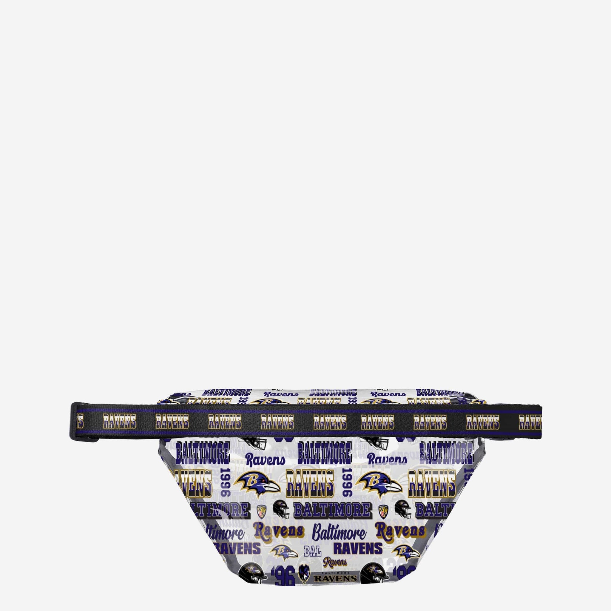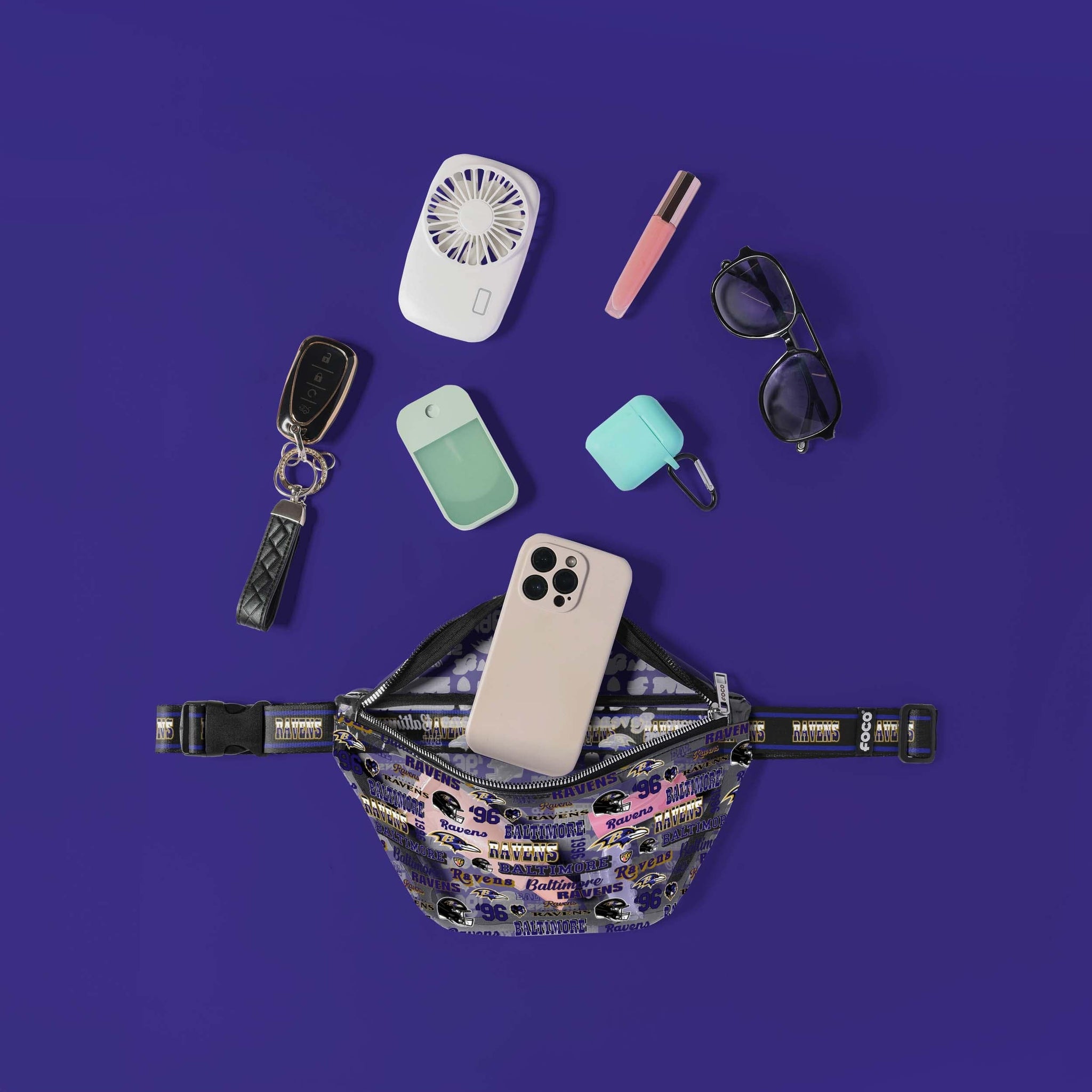 - Repeat Baltimore Ravens current and retro team logo and wordmark displays on the fanny pack, in case there were any doubts where your allegiances lie