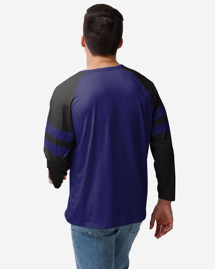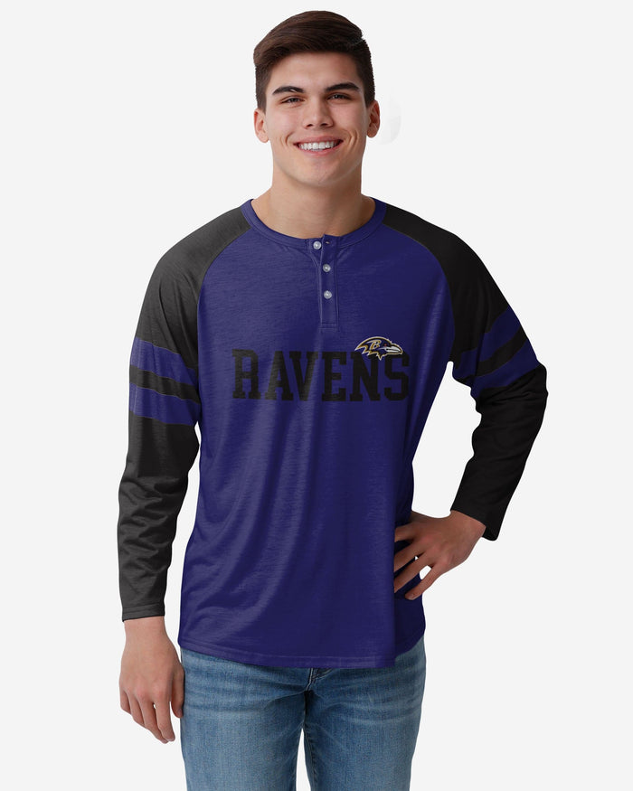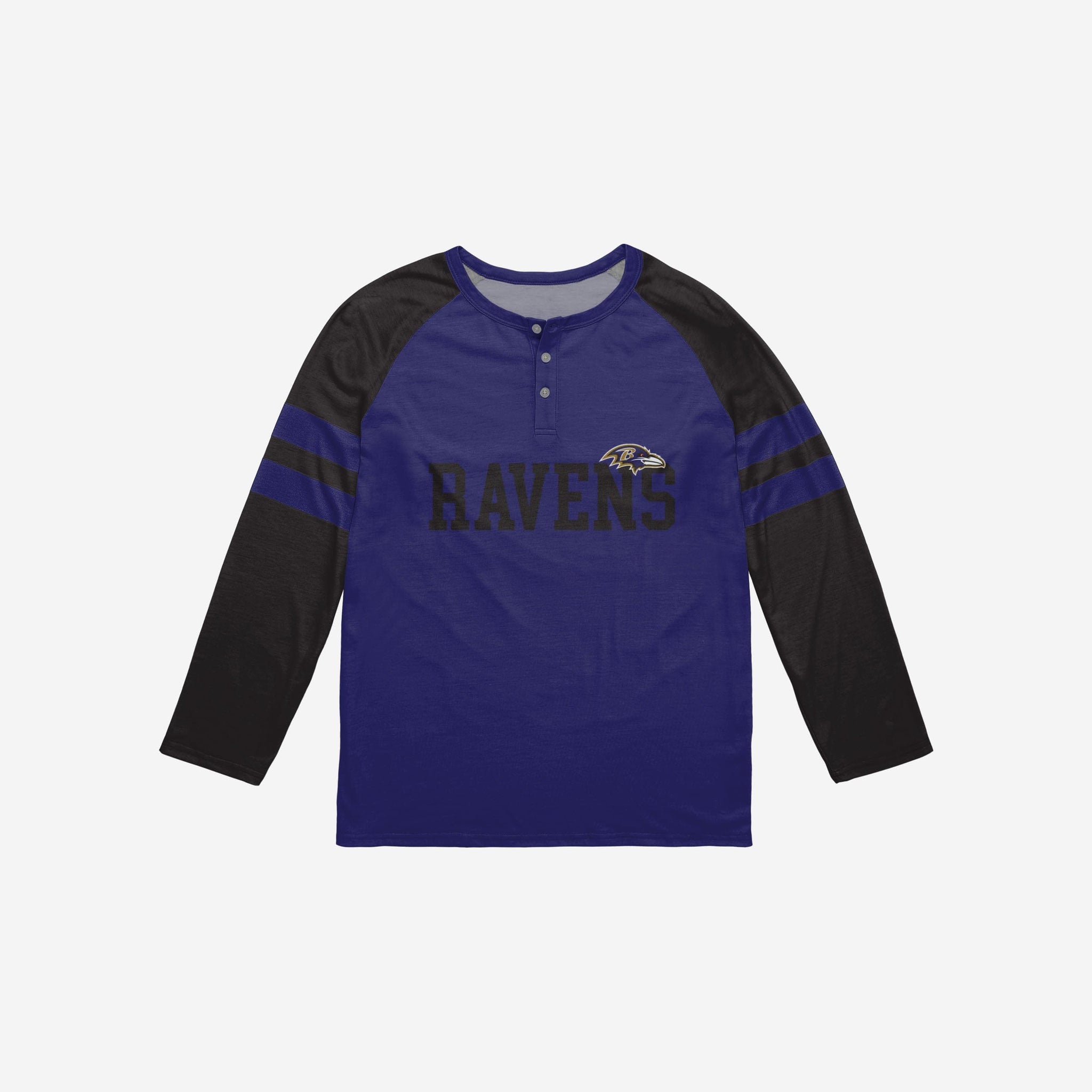 Long sleeves to keep you warm. Sleek style to keep you cool. Bring some sensational style to the game or wherever your team spirit takes you with this Baltimore Ravens Team Stripe Wordmark Long Sleeve Henley.