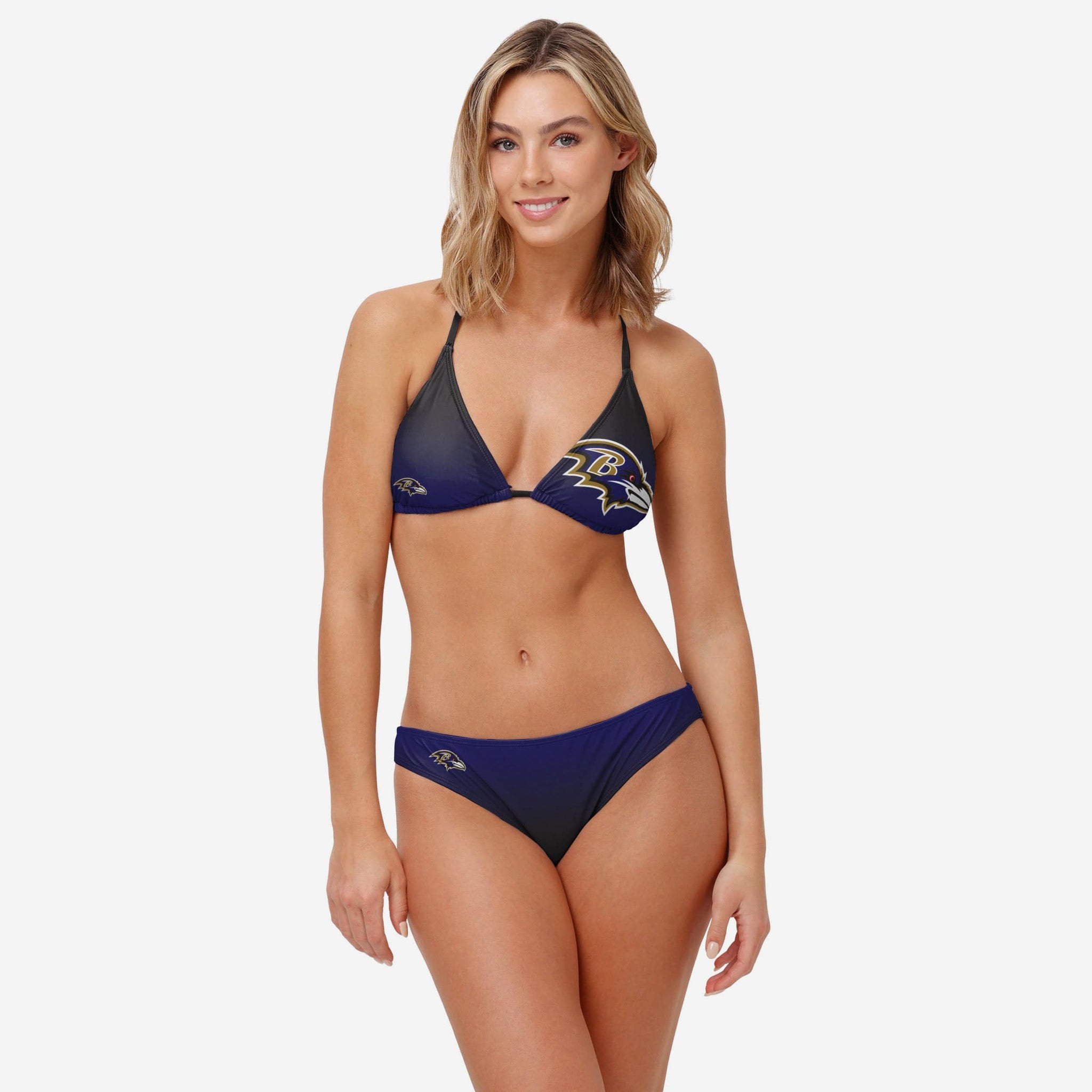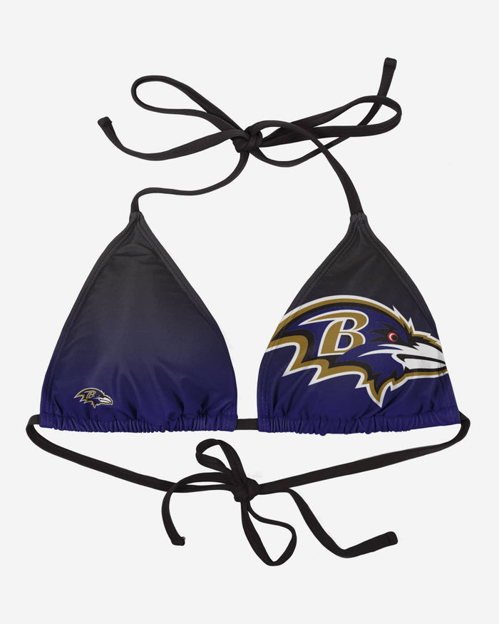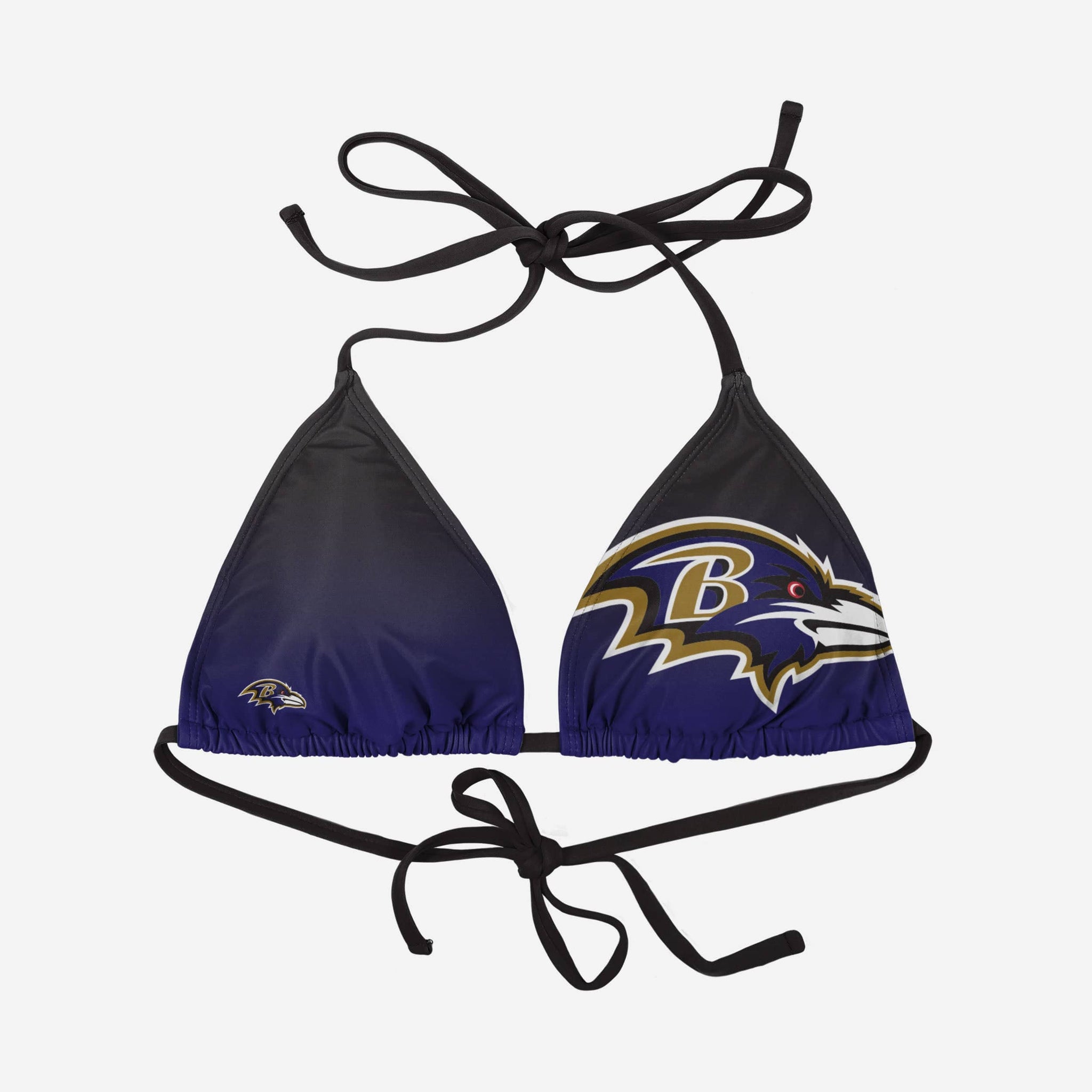 Sun, sand, and fan fun in the summer sun! Let no one second guess your team loyalty this summer with the Baltimore Ravens Women's Gradient Big Logo Bikini Top.