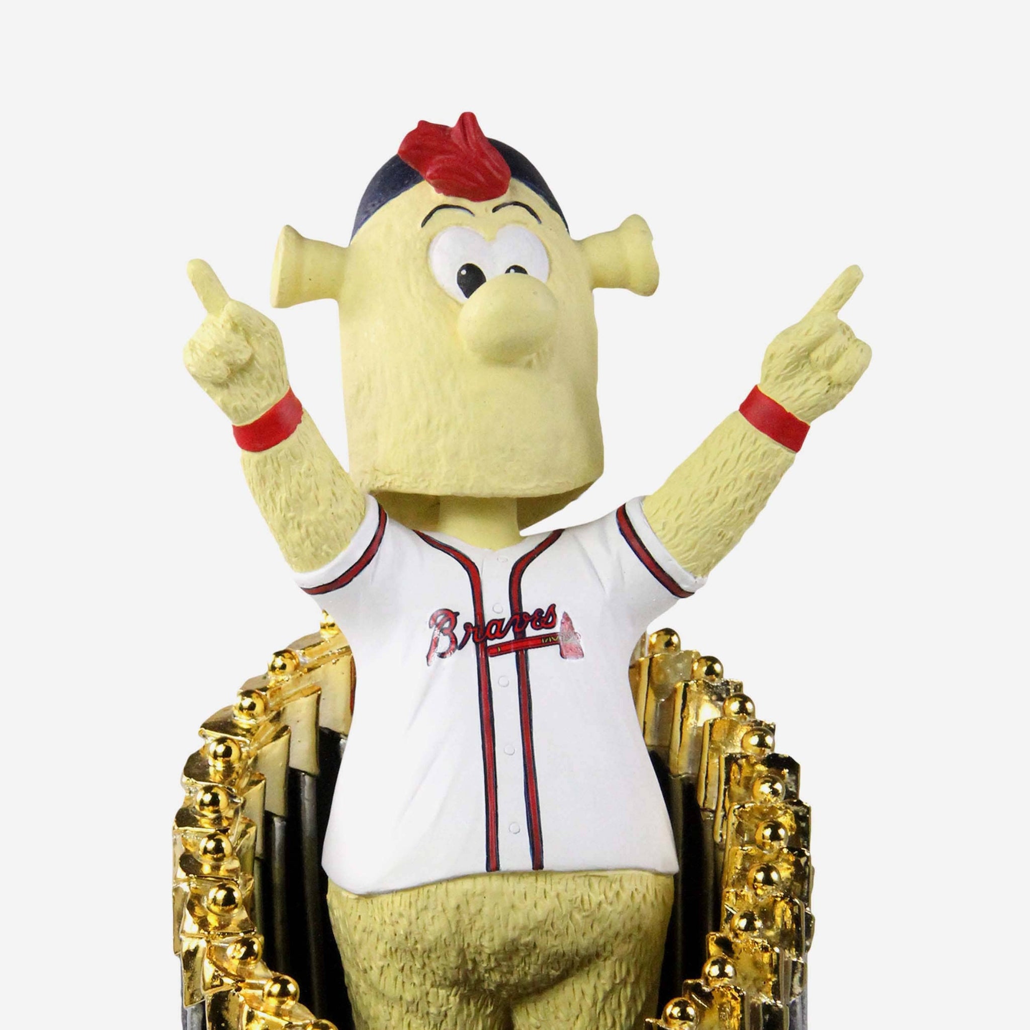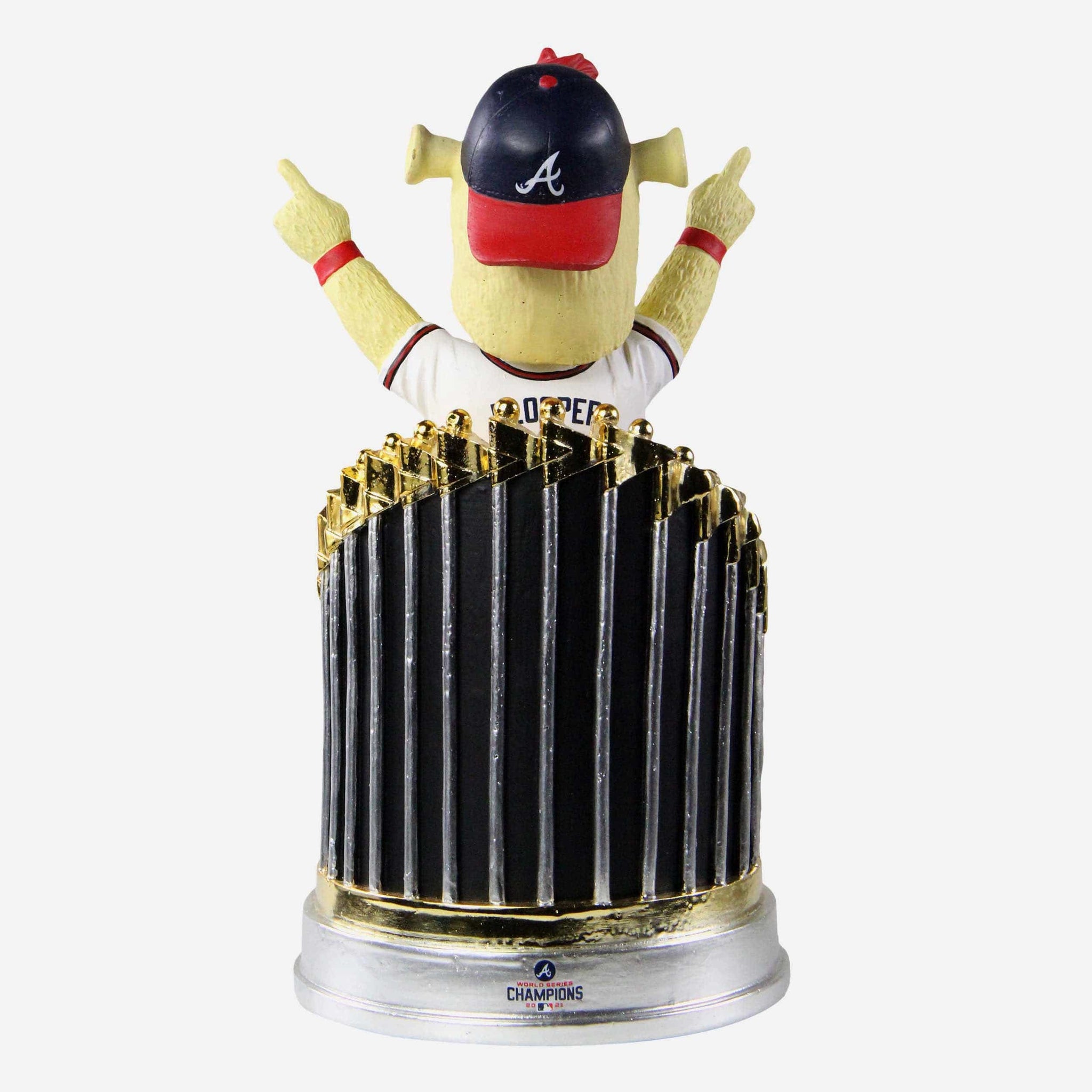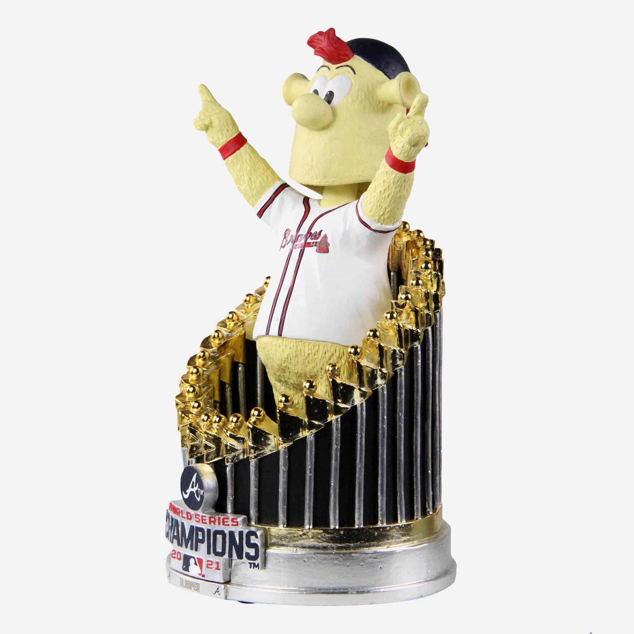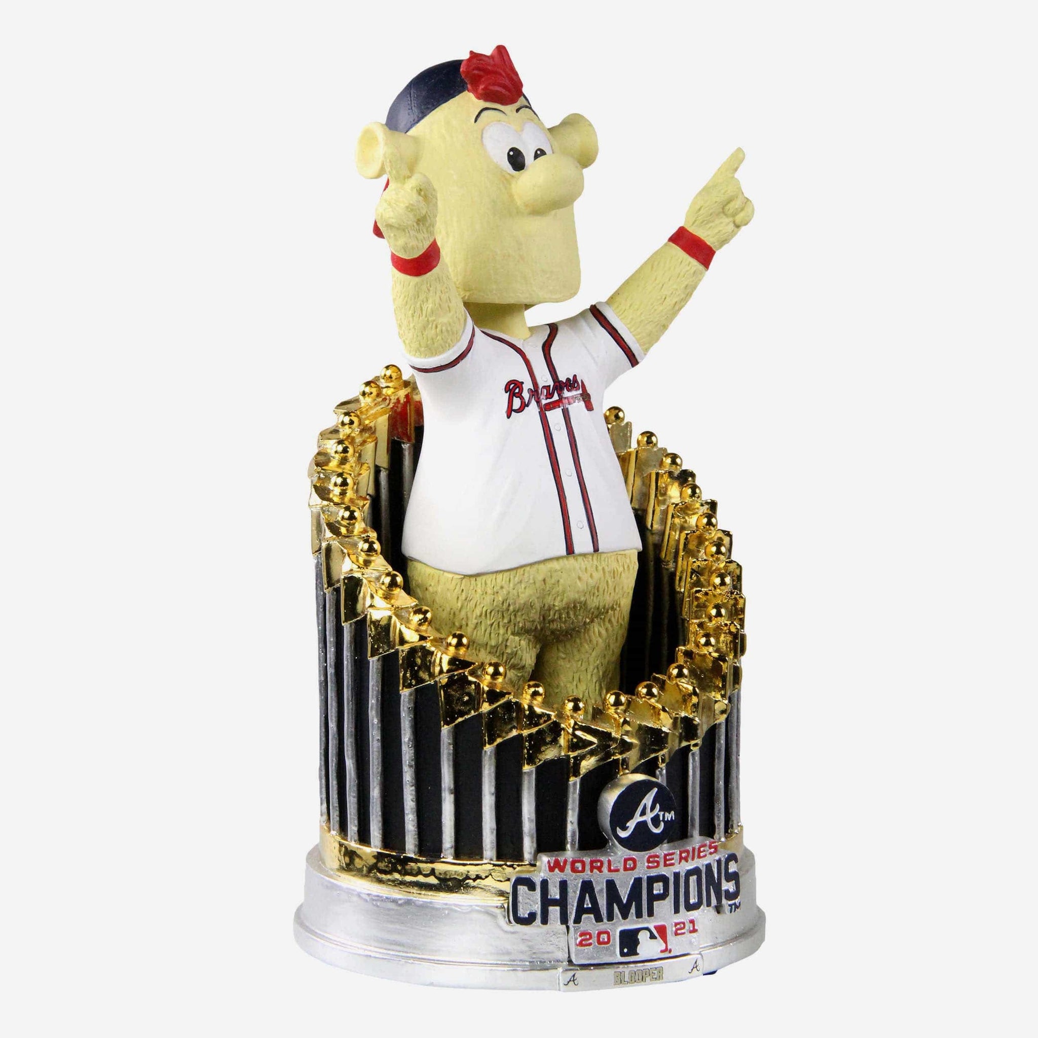 Mascot madness and some hardware that's good as gold! This Blooper Atlanta Braves Mascot in Trophy 2021 World Series Champions Bobblehead truly has it all!