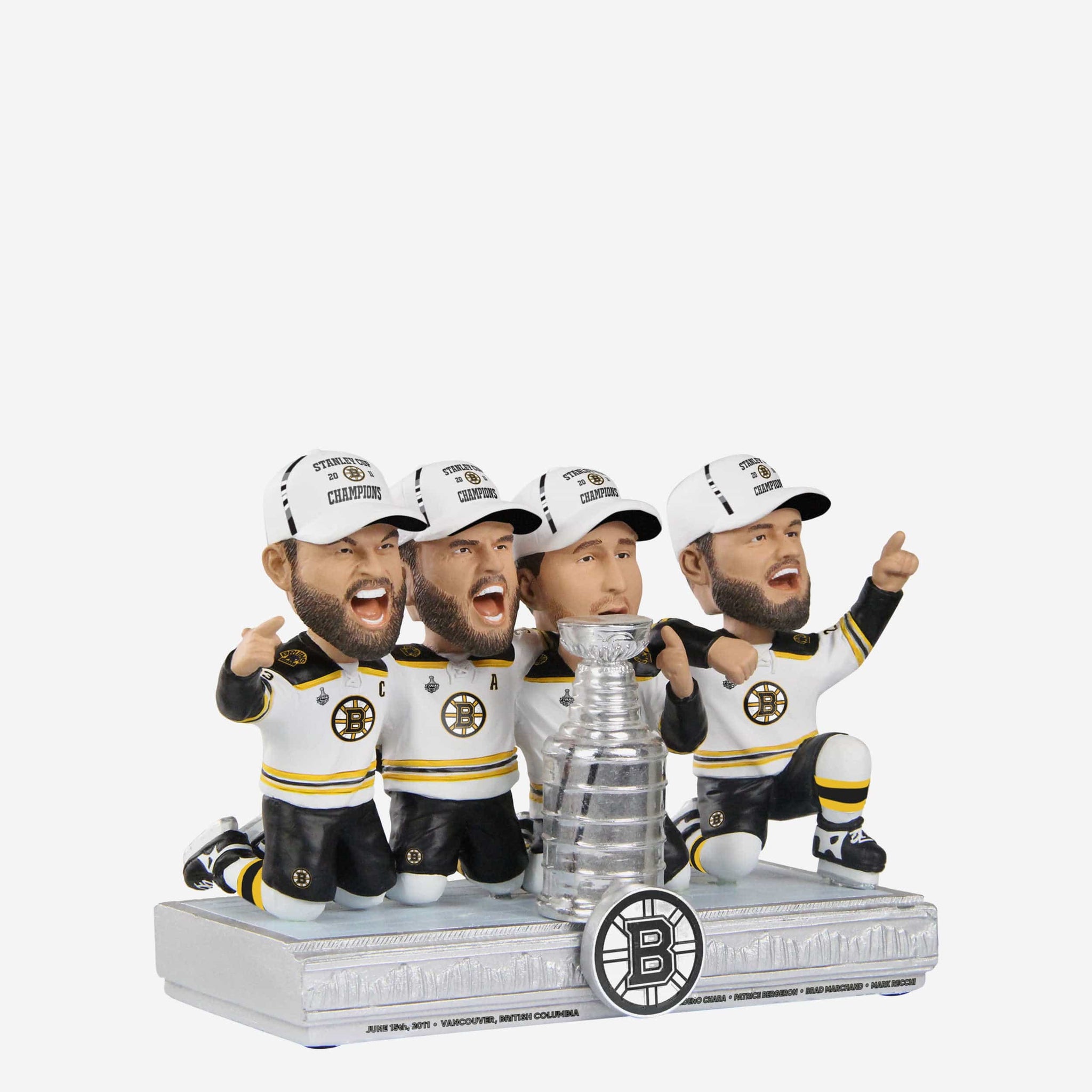 Chara. Bergeron. Marchand. Recchi. This quartet of Bruins greats is immortalized forever and ready to help you re-live that incredible season with this Boston Bruins 2011 Stanley Cup Champions Mini Bobblehead Scene!