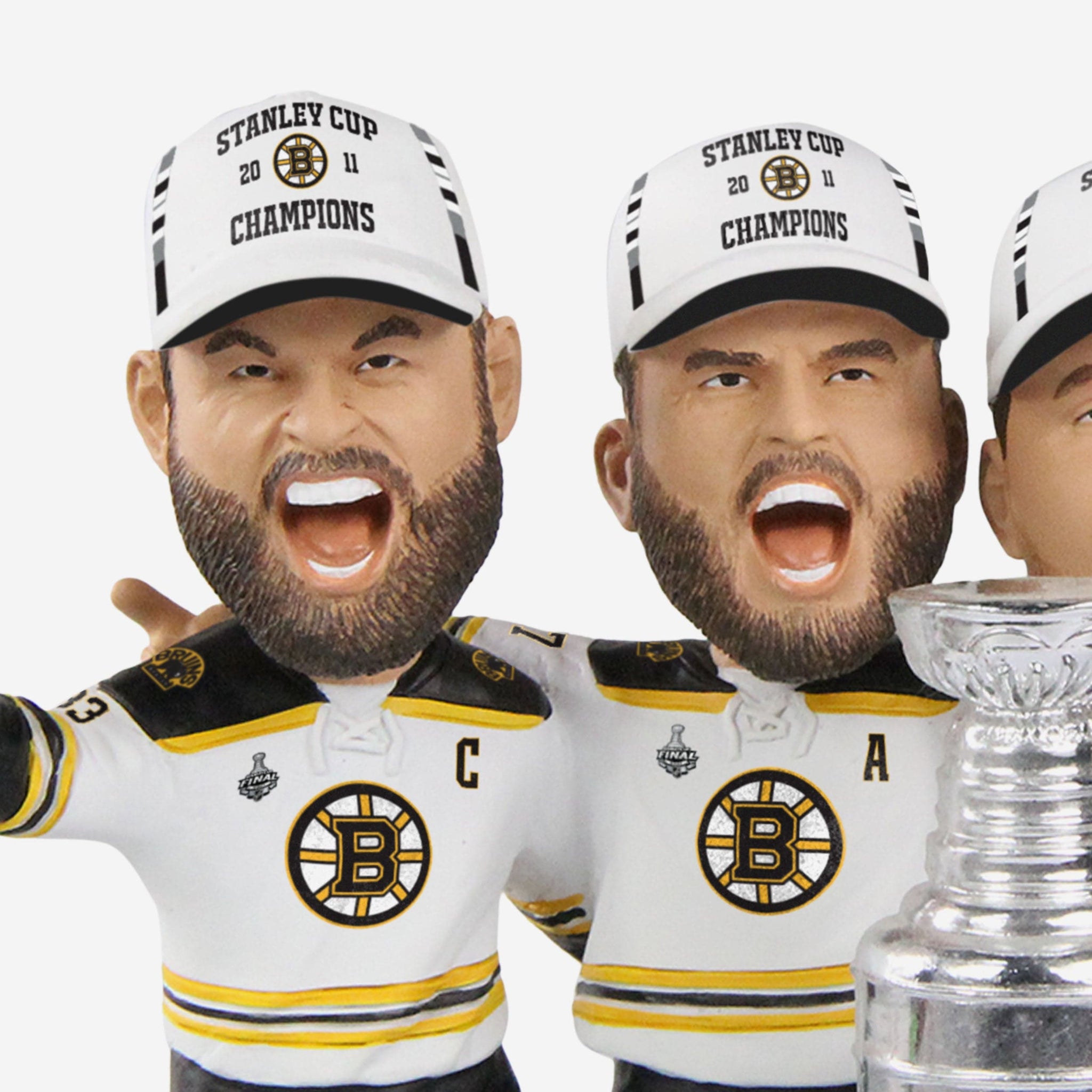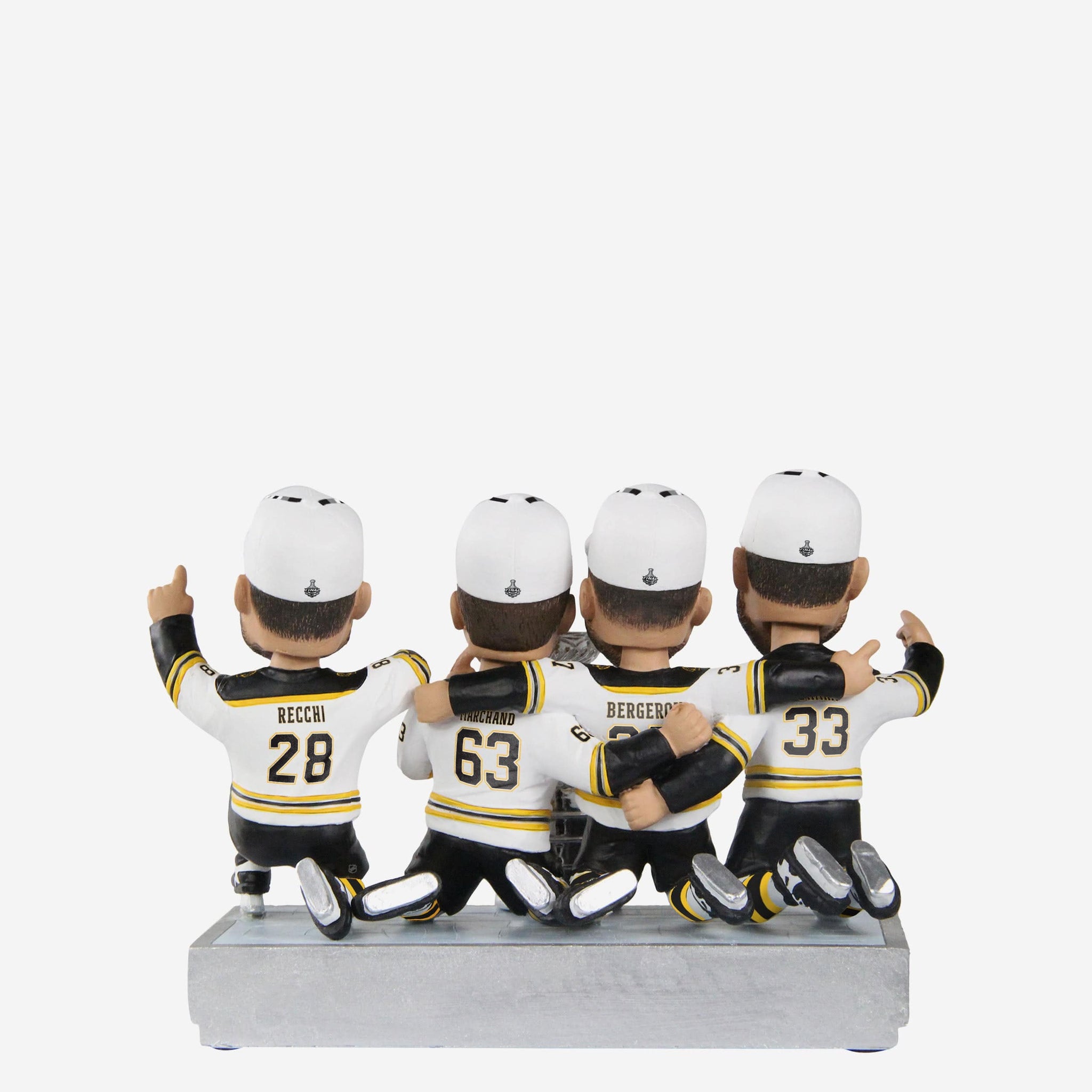 - Portrays Zdeno Chara, Patrice Bergeron, Brad Marchand, and Mark Recchi wearing their gameday uniforms and championship caps in a celebratory pose, ready to get the party started