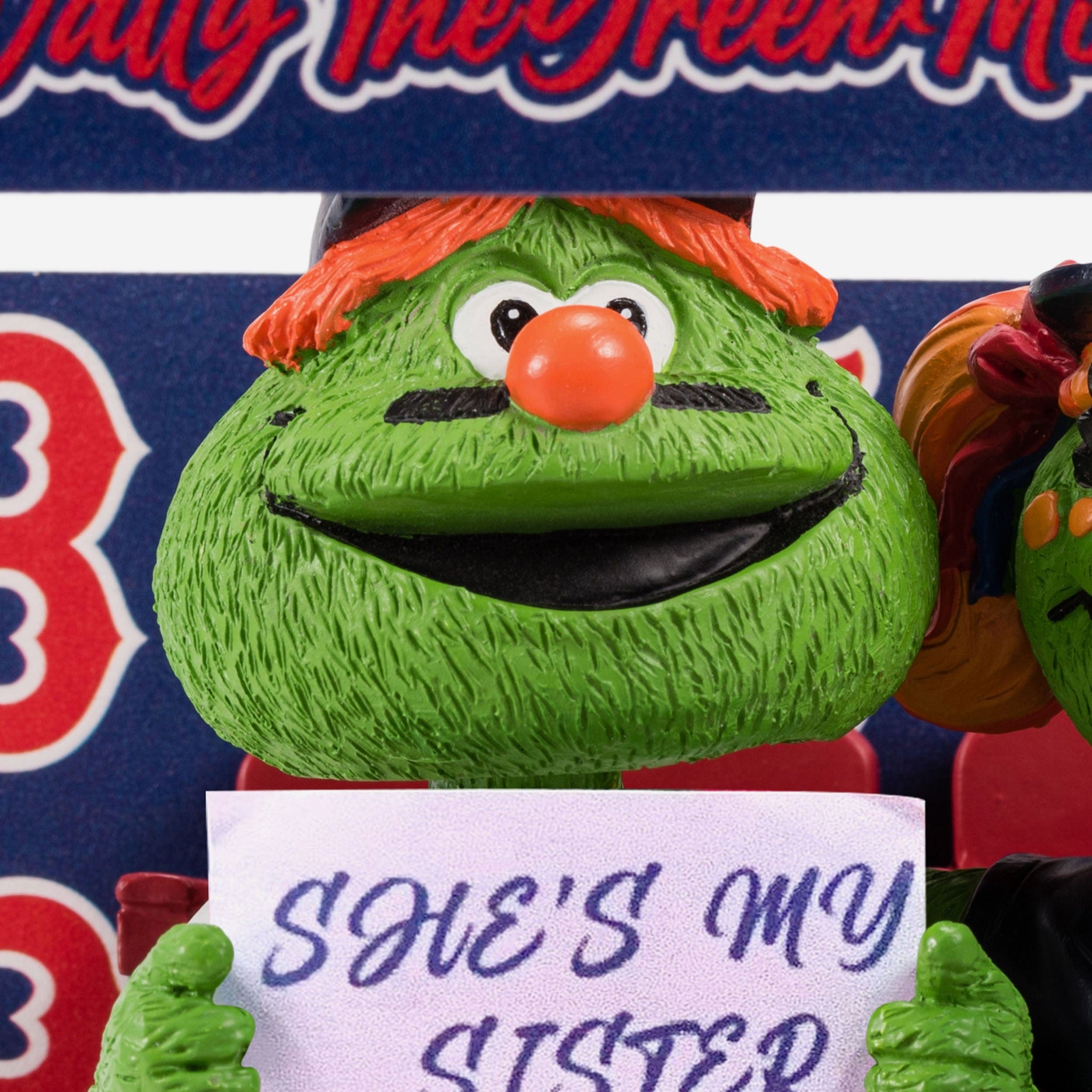 - Portrays Wally the Green Monster and Tessie wearing their gameday uniforms and sitting in the stands while Wally holds a SHE’S MY SISTER sign