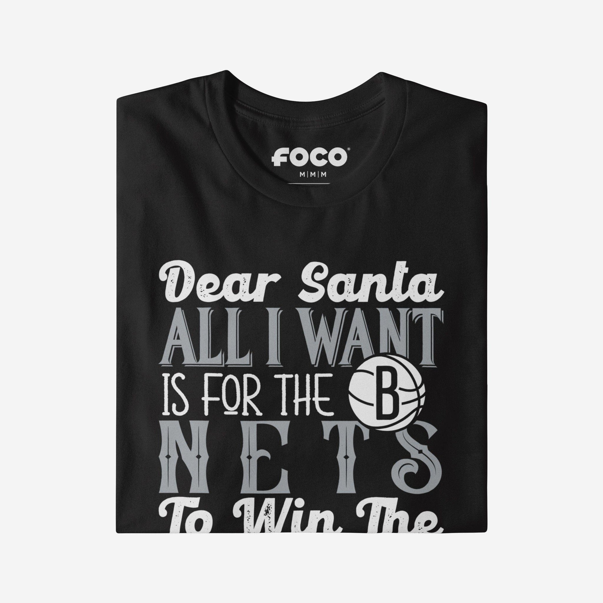 - Festive, team-colored design: This traditional t-shirt shows off the official Brooklyn Nets colors in an all-over design with a festive message to Santa, so you can combine your team spirit with holiday spirit.