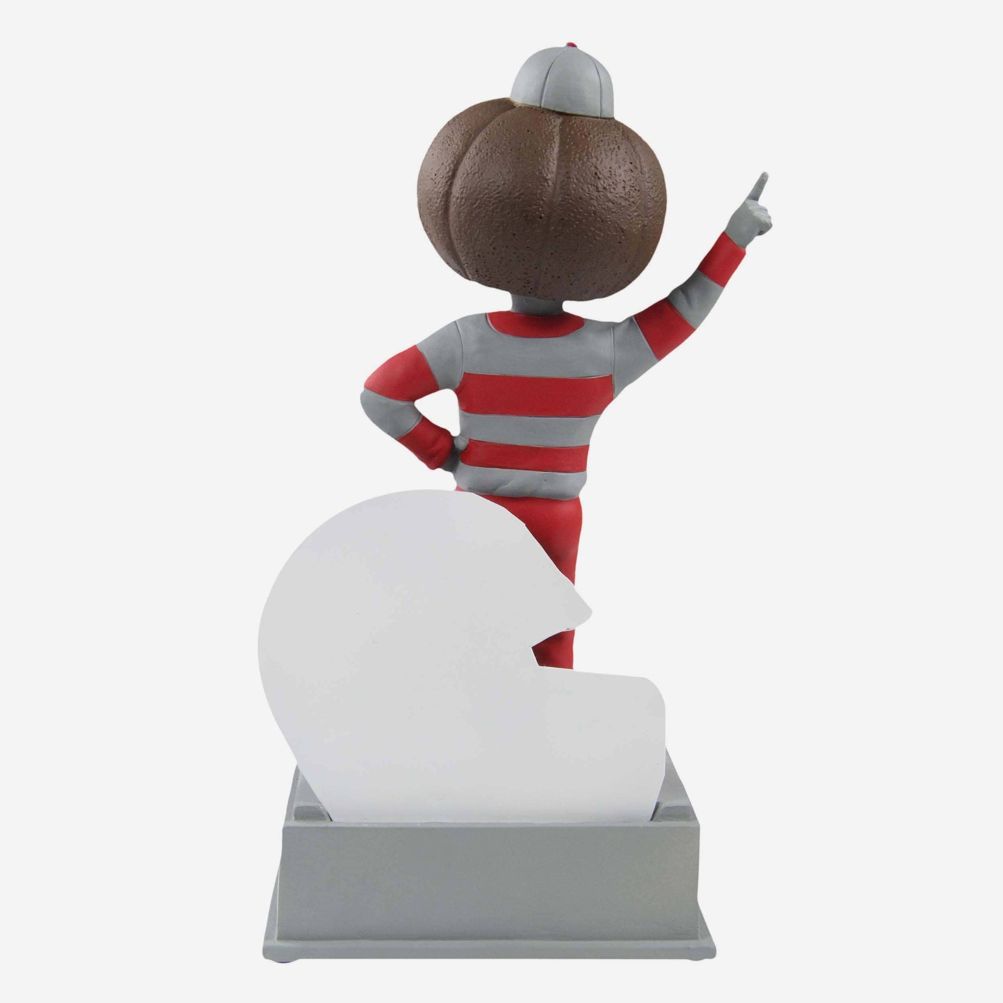 • Portrays mascot posing in front of miniature team helmet backdrop, ready to get the crowd fired up